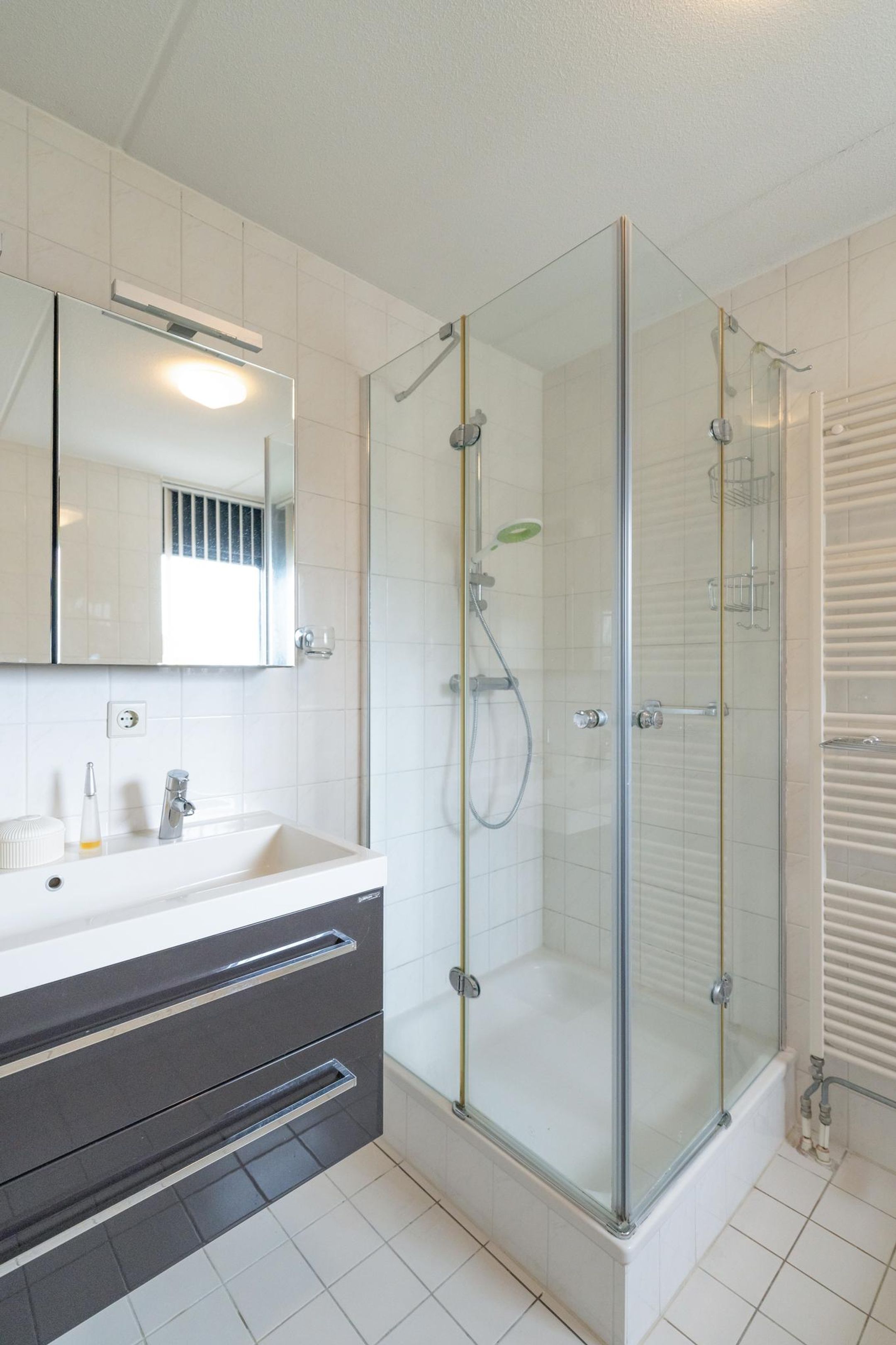 Douchecabine met hardglazen wanden en deuren, thermostaatkraan, hand- en regendouche.