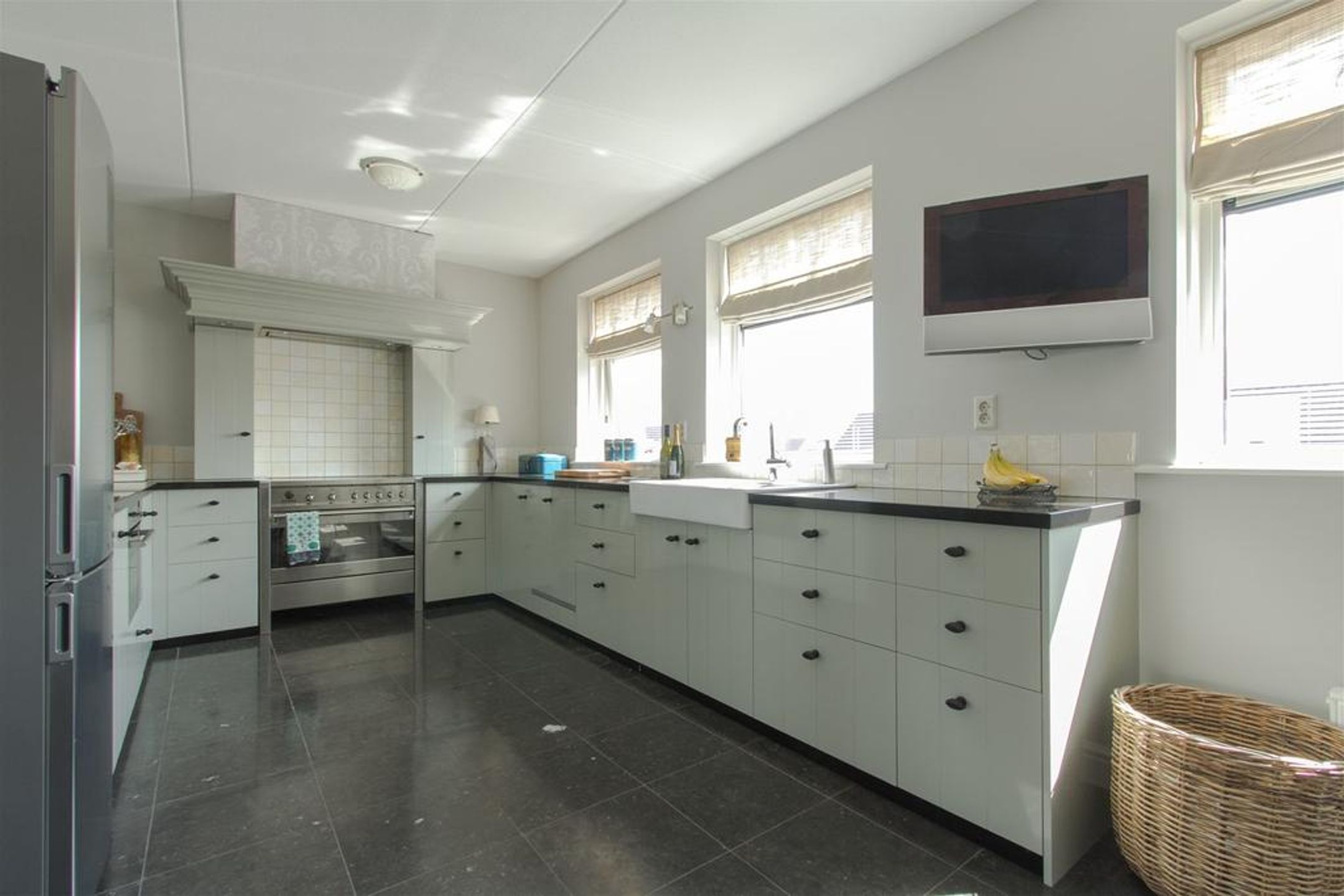 - ruime woonkeuken uitgevoerd met grijs geschilderde fronten gecombineerd met composiet werkblad, breed fornuis voorzien van 5-pits keramische plaat en brede bakoven, sierlijk gedetailleerde schouw met SIEMENS afzuigunit, extra oven- magnetron combinatie, vaatwasautomaat, vrijstaande RVS koel- vrieskast, nostalgische keramische dubbele spoelbak en een tweede sfeervolle houtkachel.