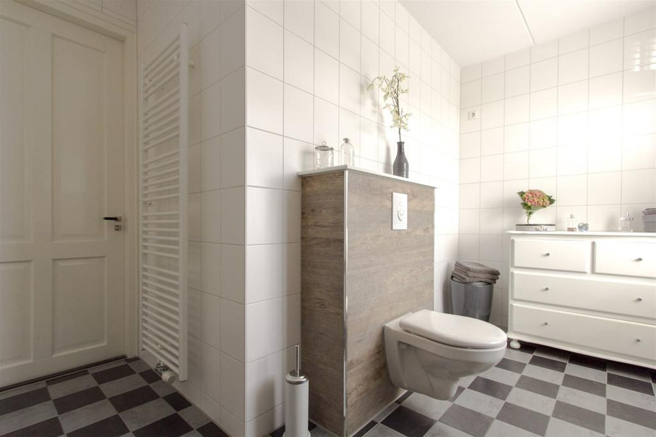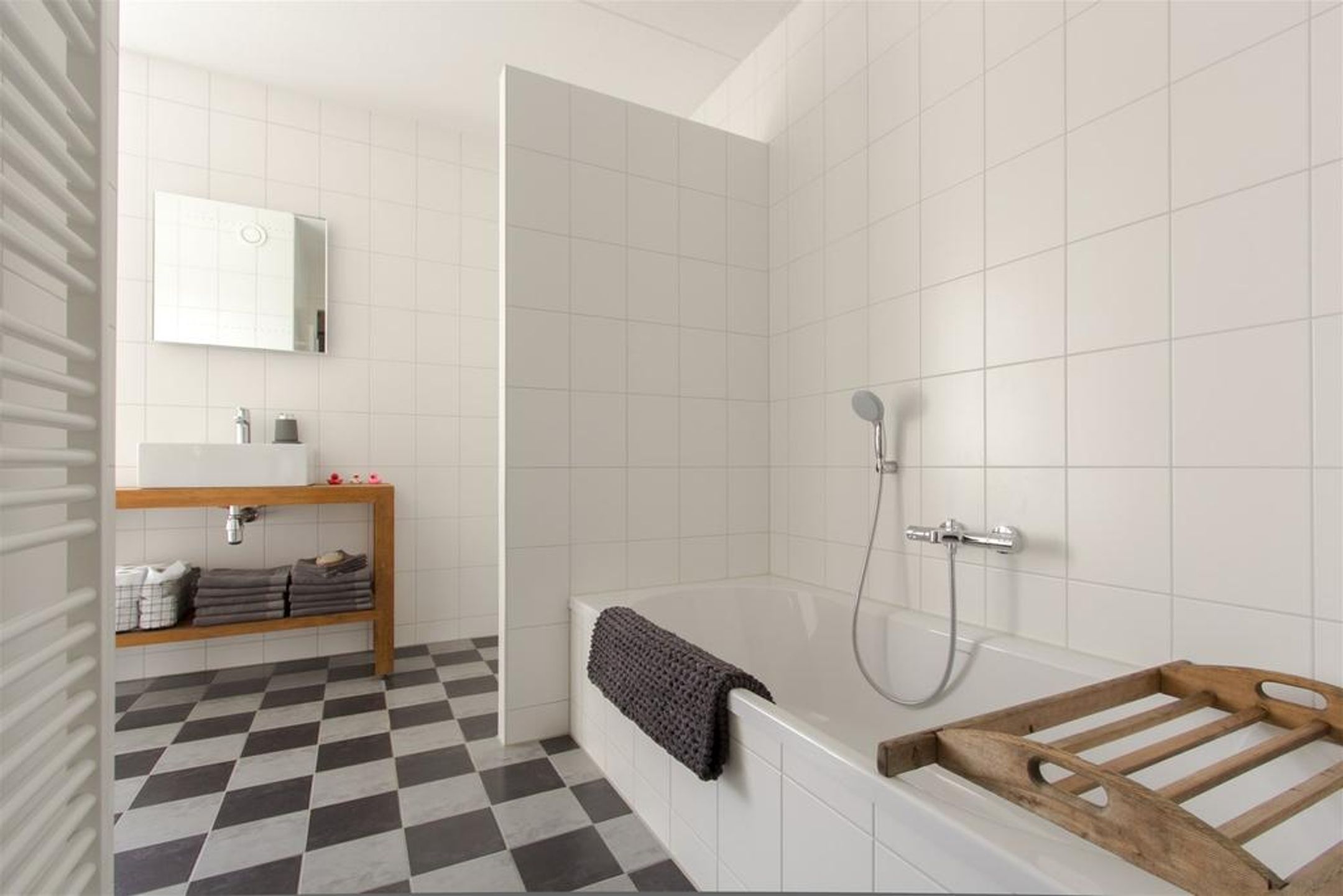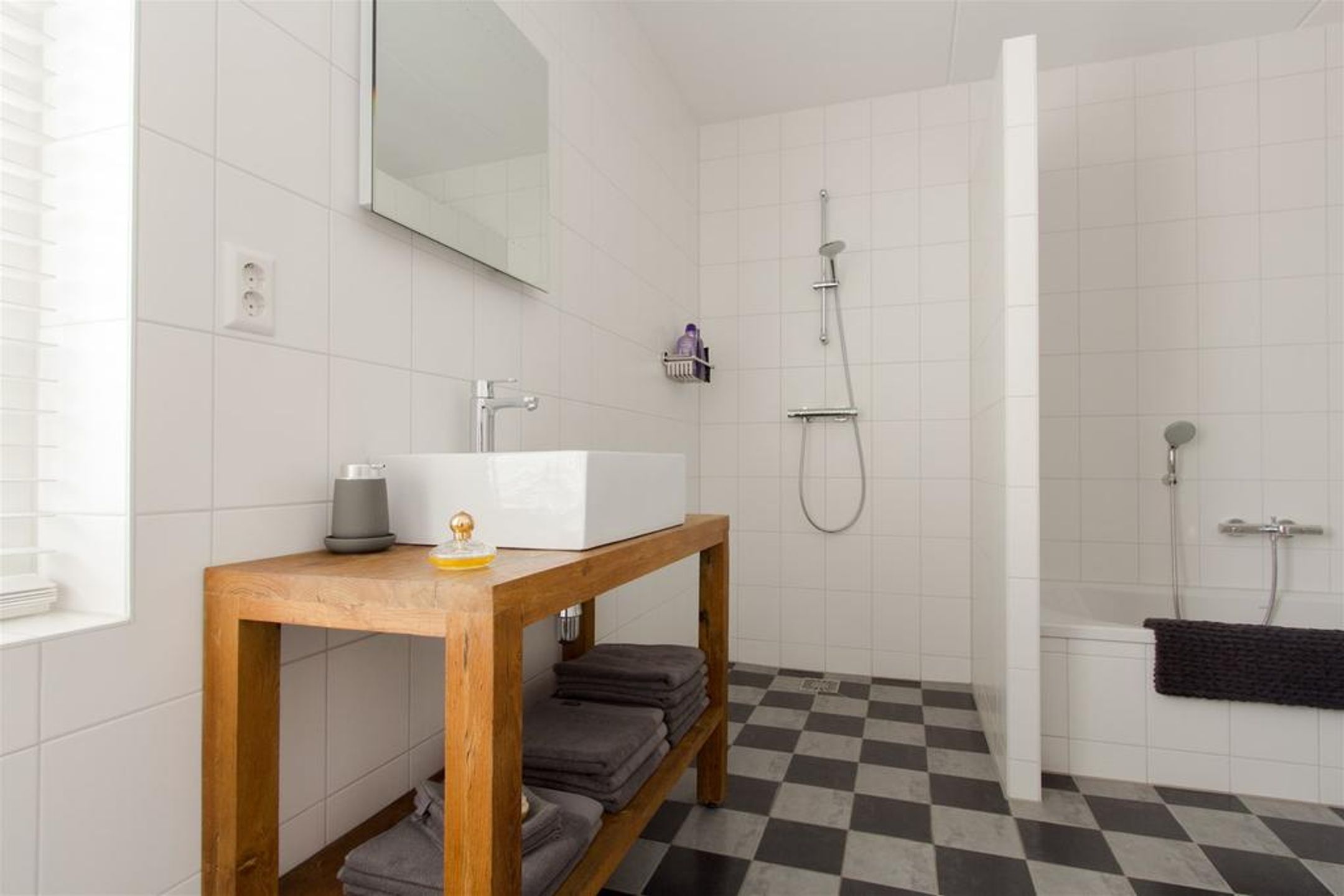 - badkamer voorzien van ligbad, inloopdouche, badmeubel voorzien van waskom, spiegel en verlichting, vrijhangend closet met inbouwreservoir en designradiator;