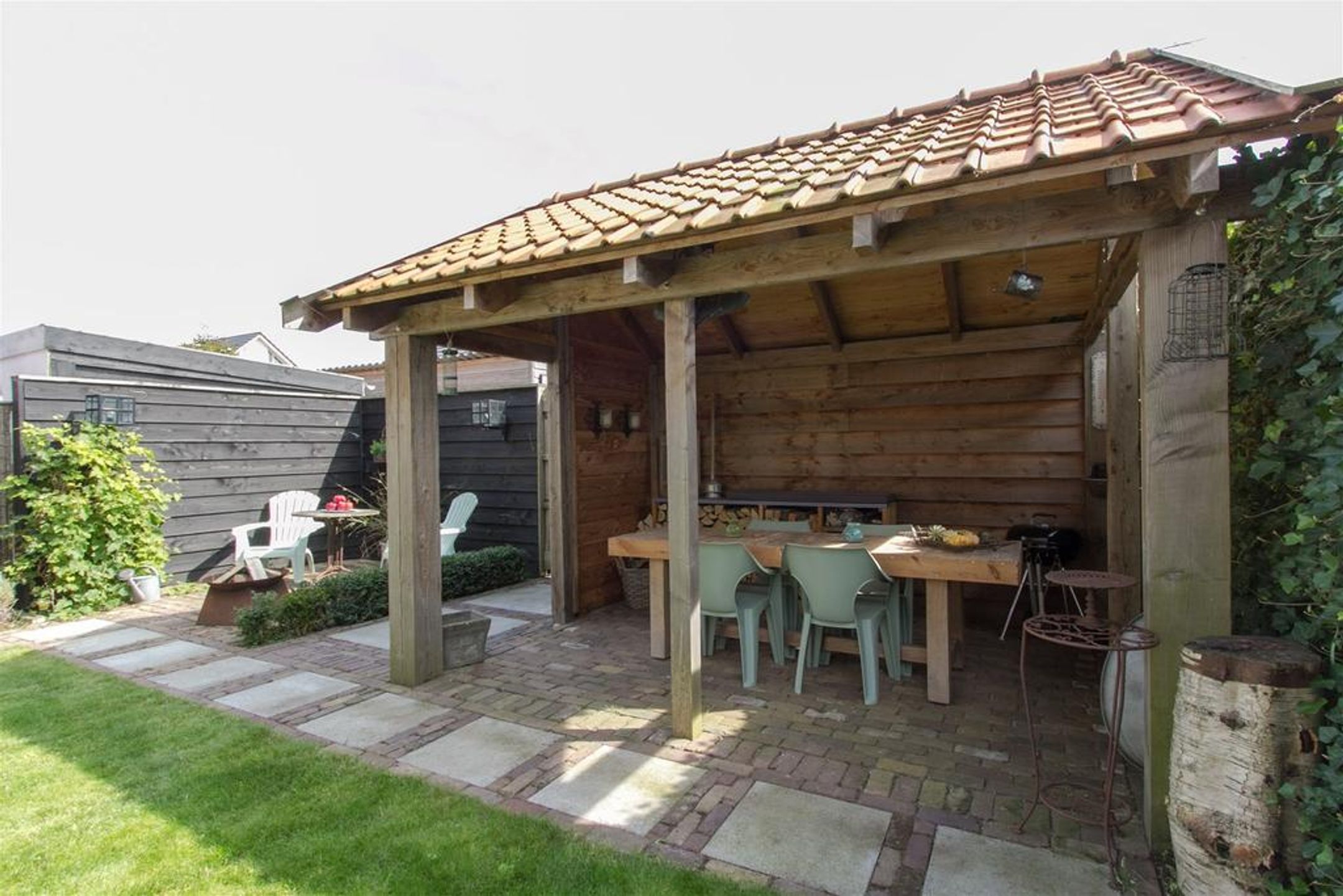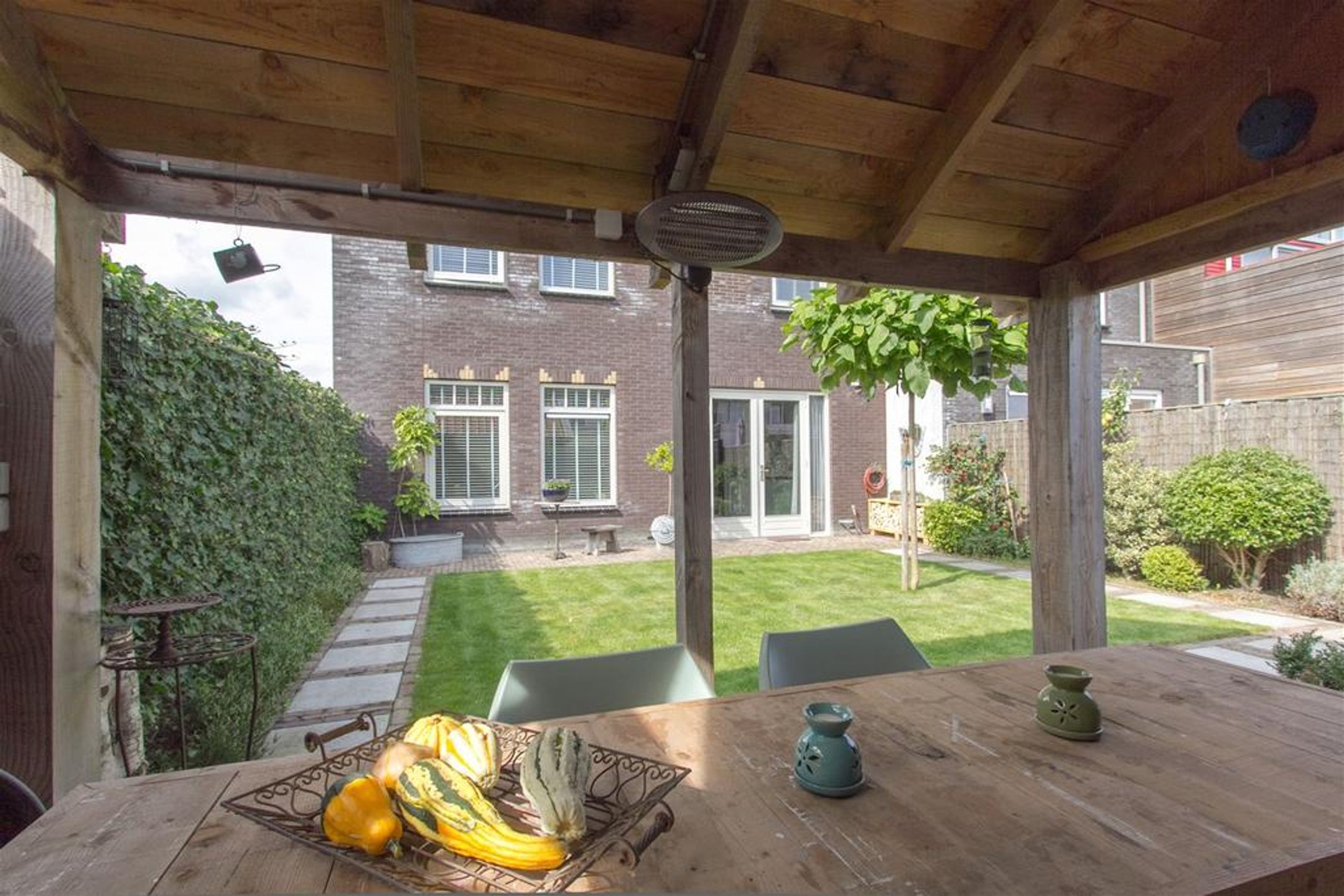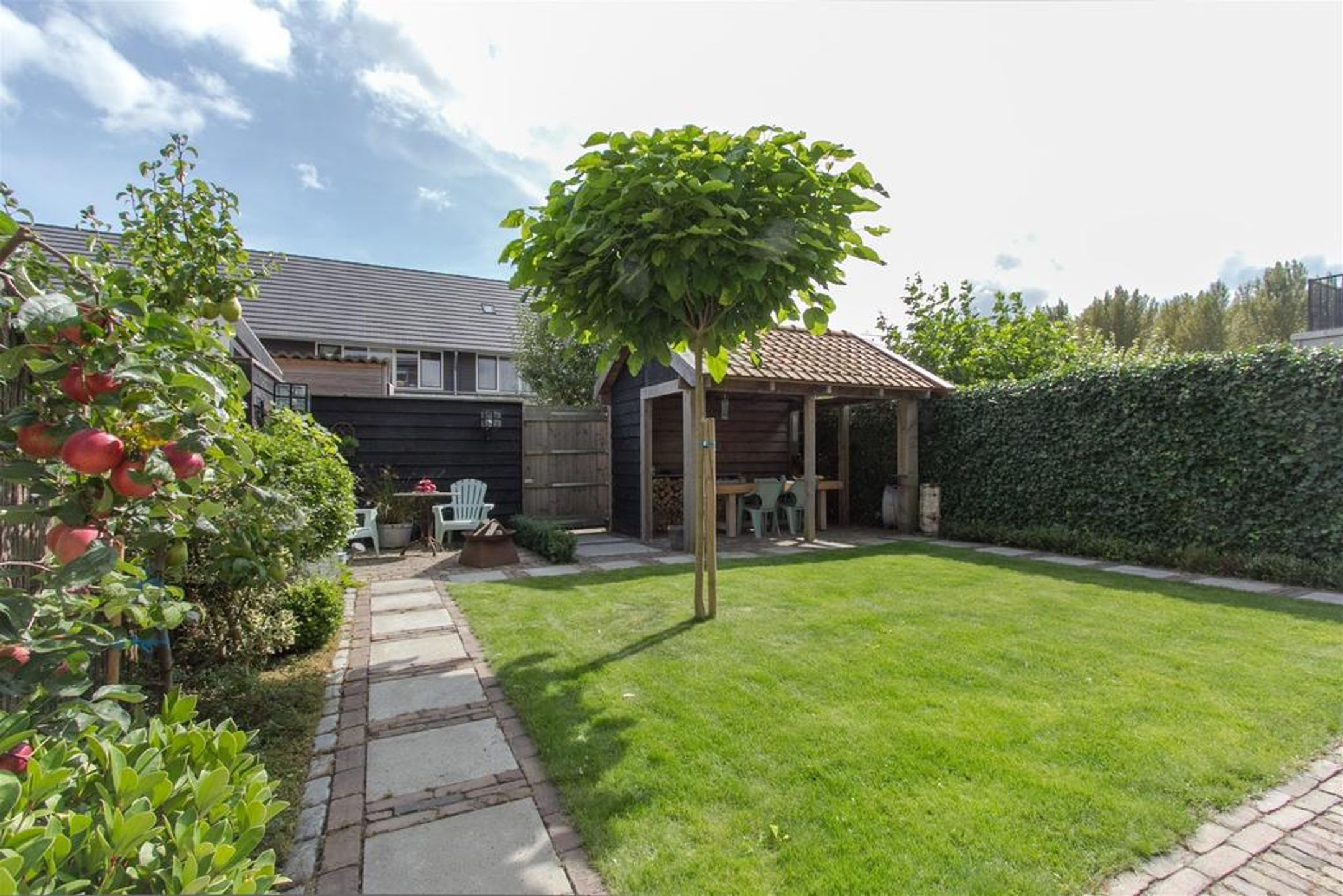 - brede en zonnige achtertuin eveneens voorzien van karakteristiek oude klinkers, gazon, tweemaal zonneterras, sfeervolle overkapping met traditionele oude pannen, buitenkraan, lichtpunten en achterom.