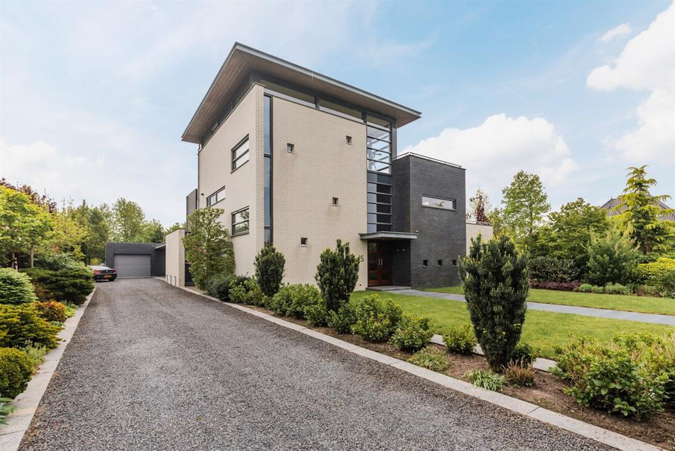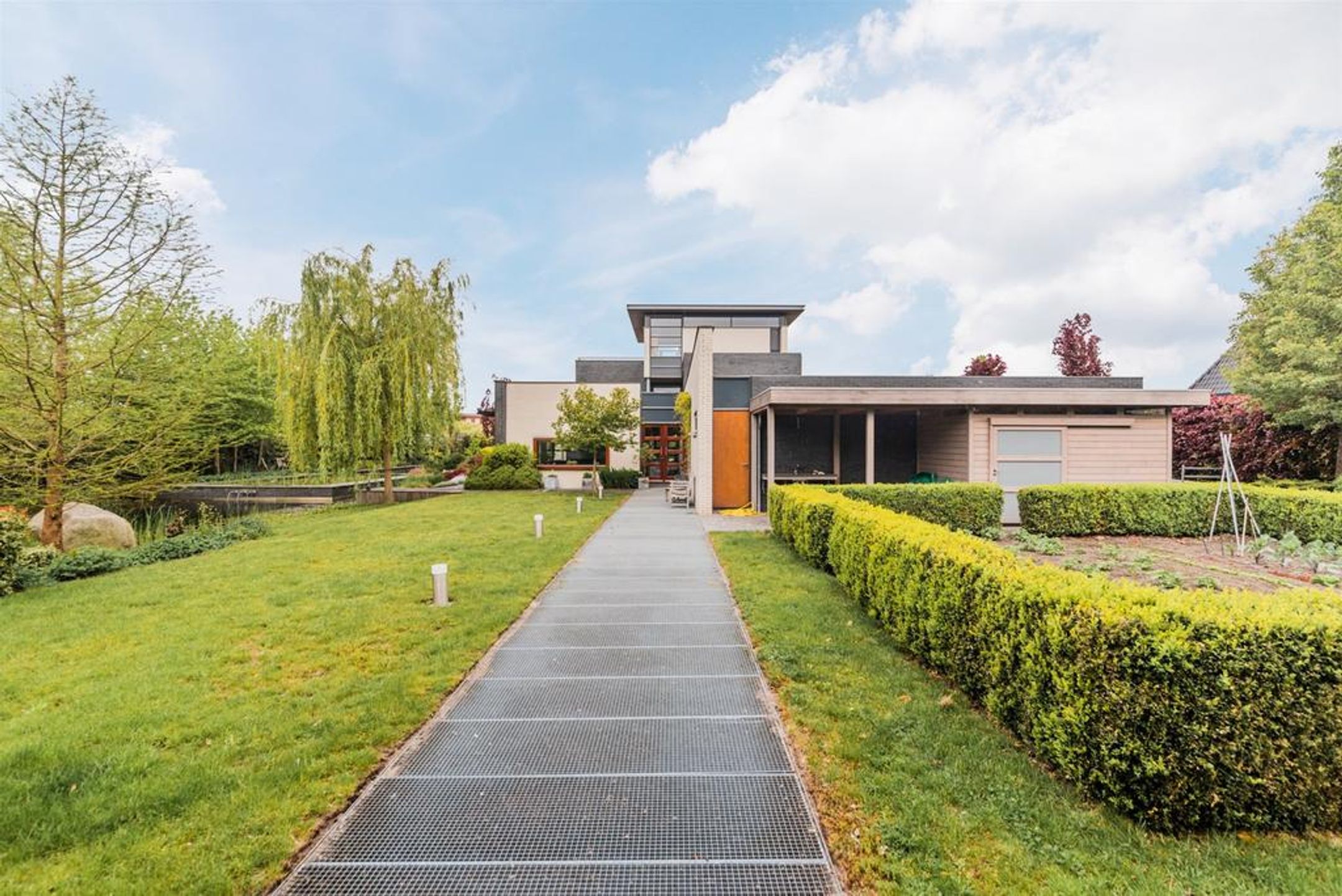 De royale villa kenmerkt zich door moderne vormgeving, lichte en donkere metselstenen, hoge raampartijen, onderhoudsvrij Western Red Cedar beklede brede overstekken, grote geïsoleerde verwarmde garage met sectional overheaddeur, brede carport voor 2 auto's, stijlvolle dubbele voordeuren en de overdekte entree.