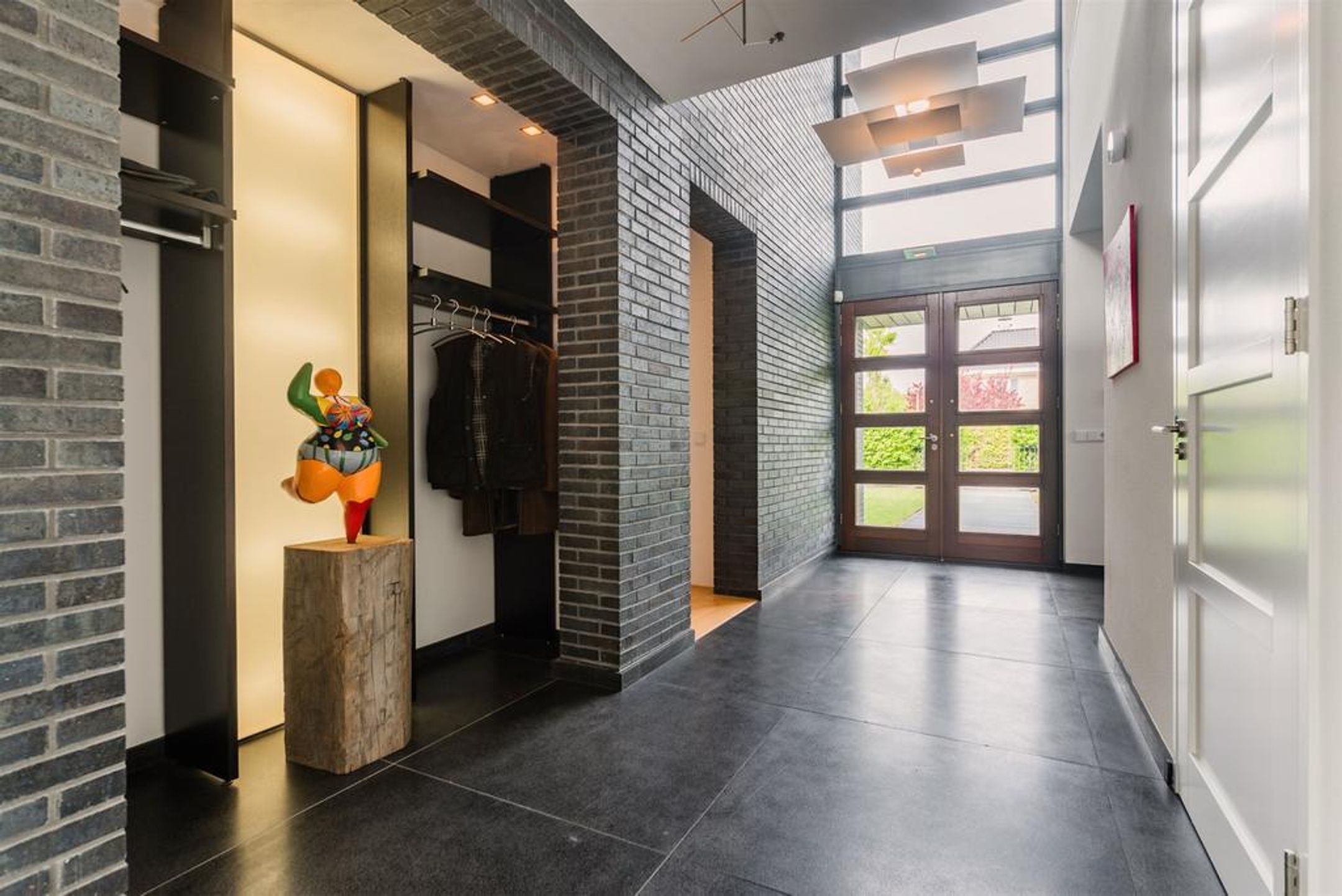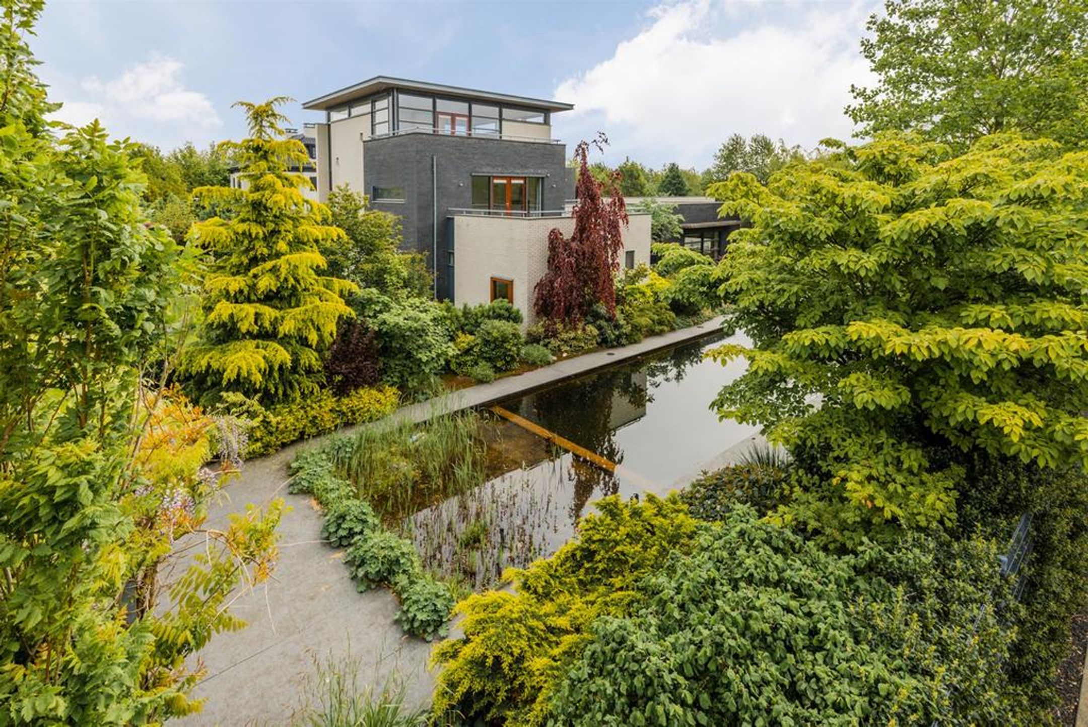 De eyecatcher van deze villa: de grote vijverpartij van 5 x 23m. Stijlvol omlijst door luxe Basaltnatuurstenen tegels met een looppad over de waterpartij. De vijver is opgesplitst in een natuurvijver met beplanting en filtersysteem en een grote zwemvijver van 5 x 13m met stalen zwem-trap. Veel privacy dankzij de hoge beplanting, de hagen en de boswal aan de achterzijde.