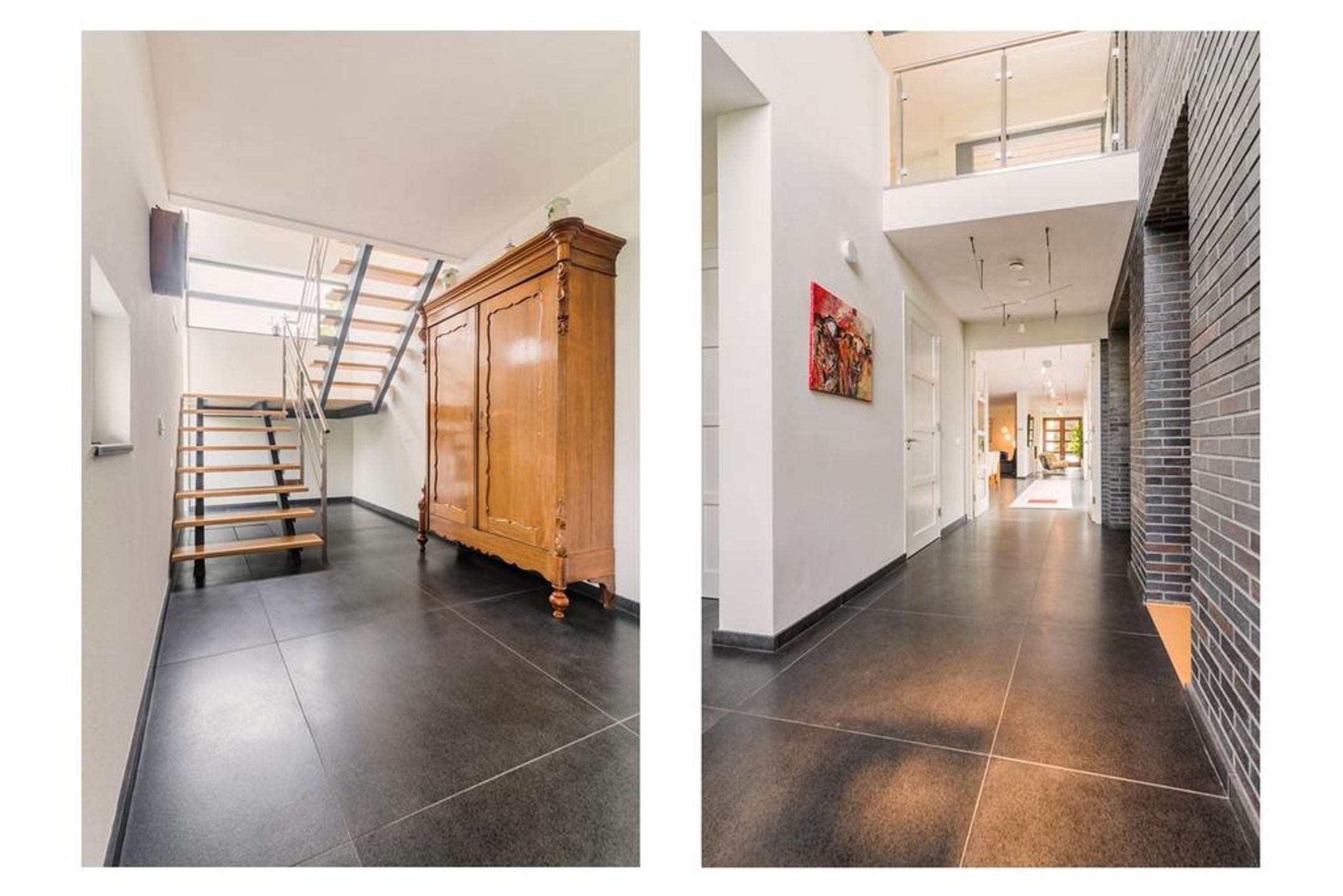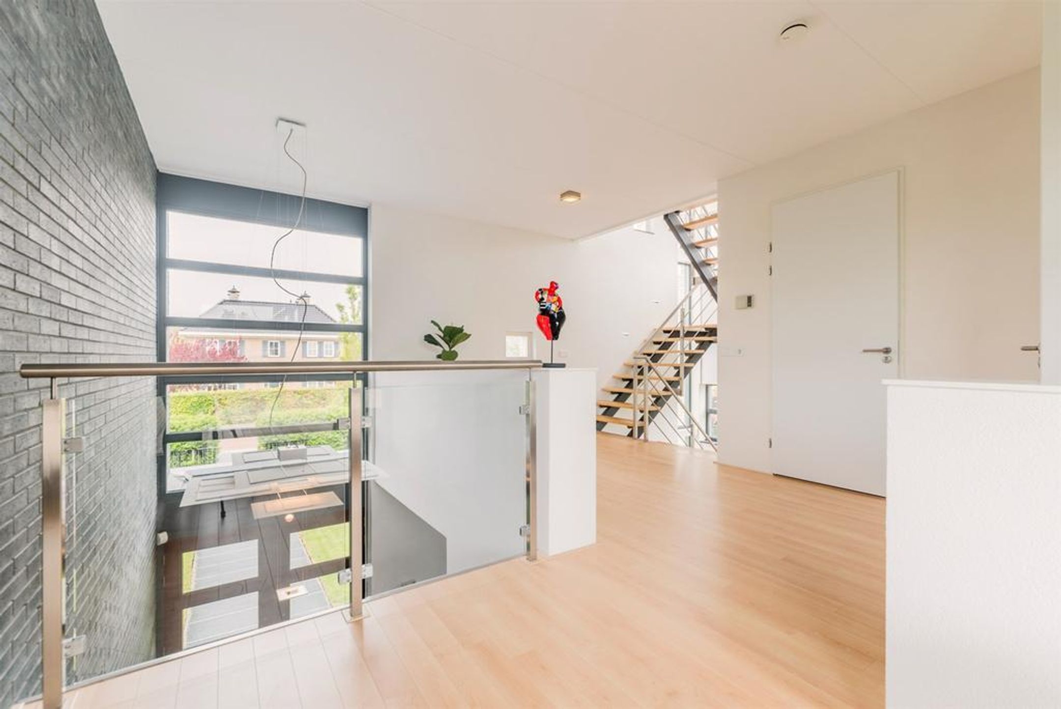 • Trappenhuis voorzien van moderne trap met bordes en Beuken traptreden, hoogoplopend plafond, hoogoplopende raampartijen en vide;