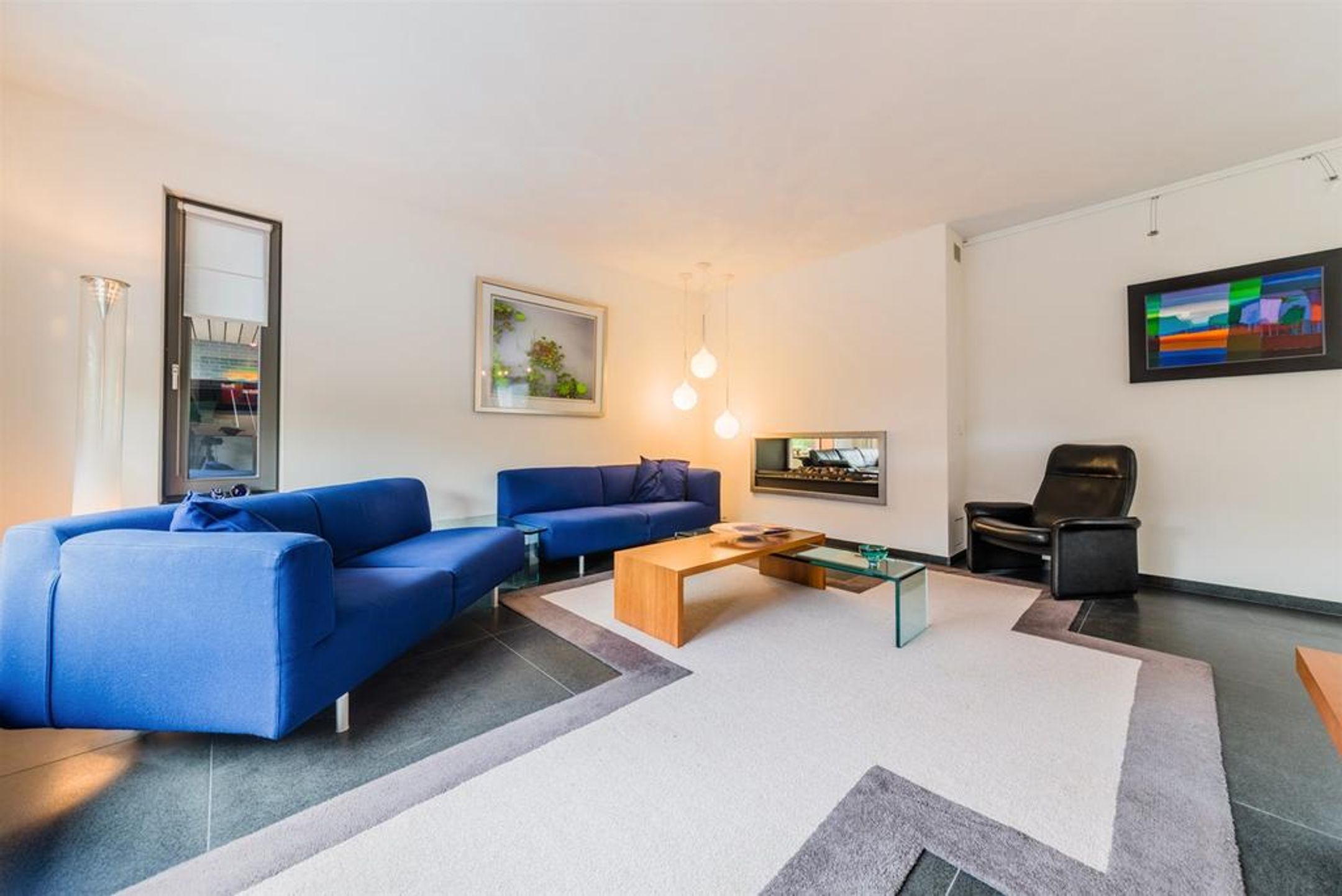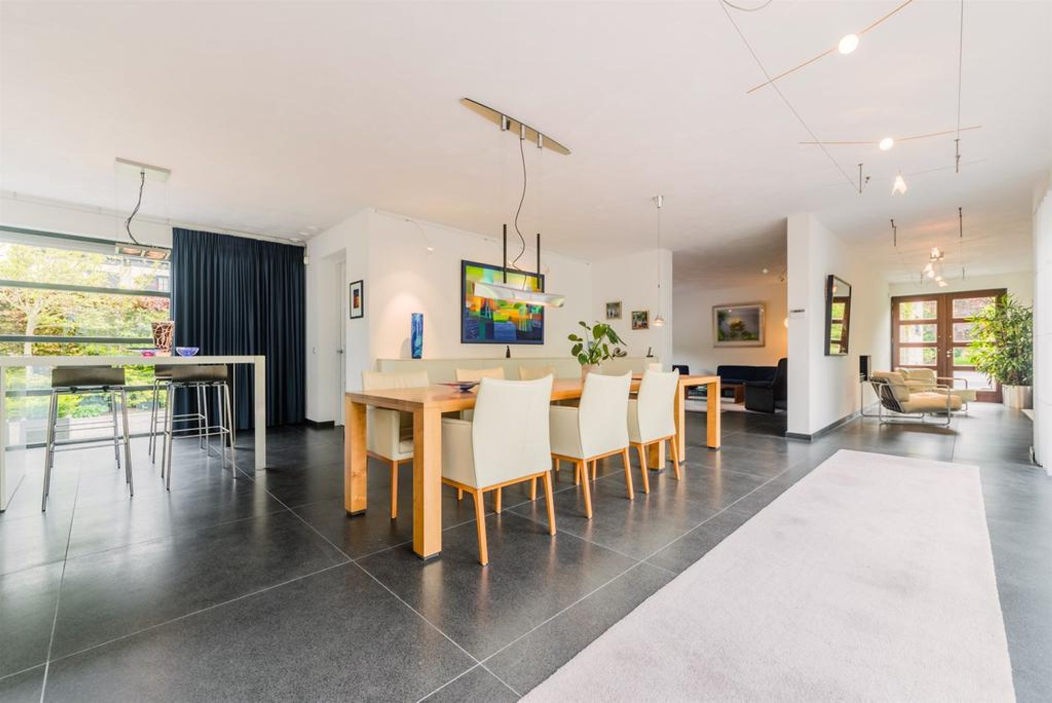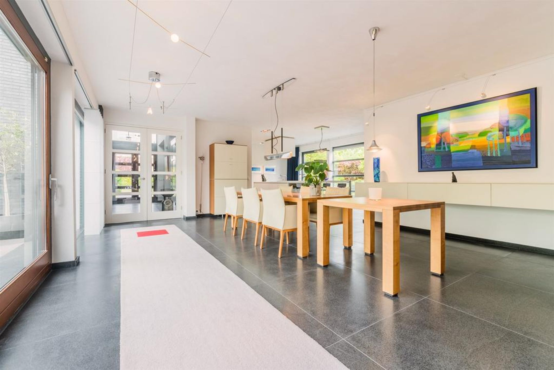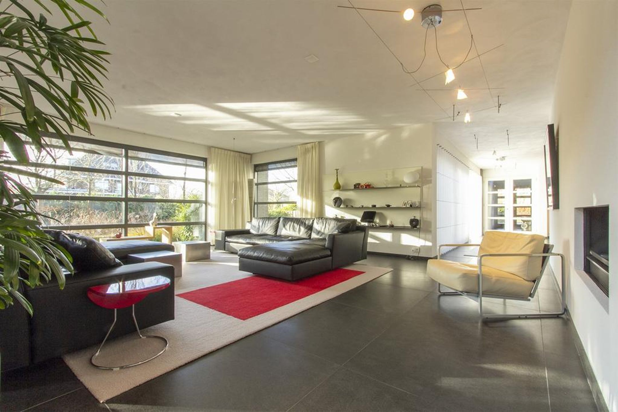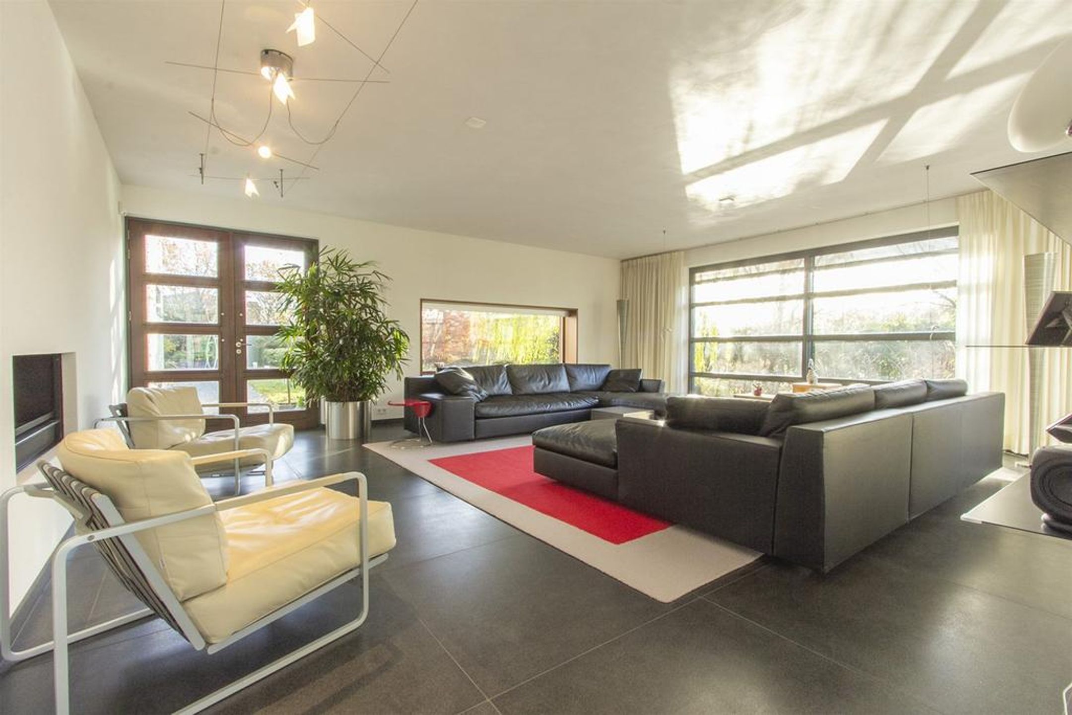 De royale living beschikt over twee in grootte variërende zitkamers. De grote raampartijen rondom, voorzien van dubbele openslaande deuren, bieden zicht op en toegang tot de prachtige tuin met zwemvijver. Een tweede ruime zithoek is ingericht als tv-hoek. Tussen de twee kamers is de moderne BOLEY gashaard gesitueerd. De ramen op de zuid- en westzijde zijn voorzien van screens.