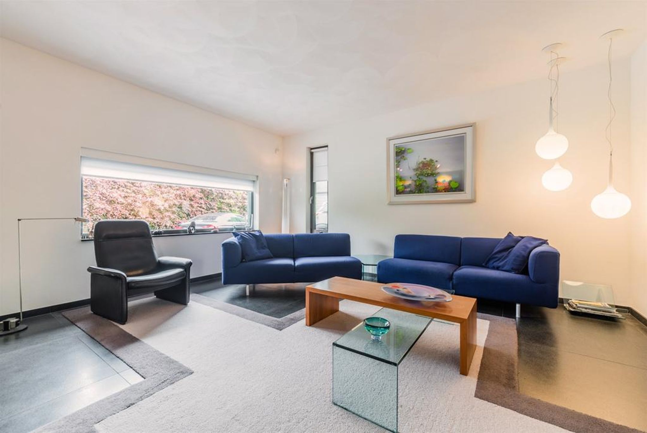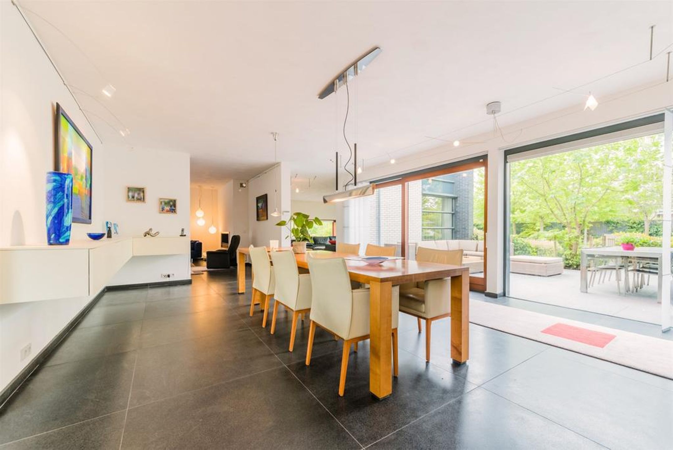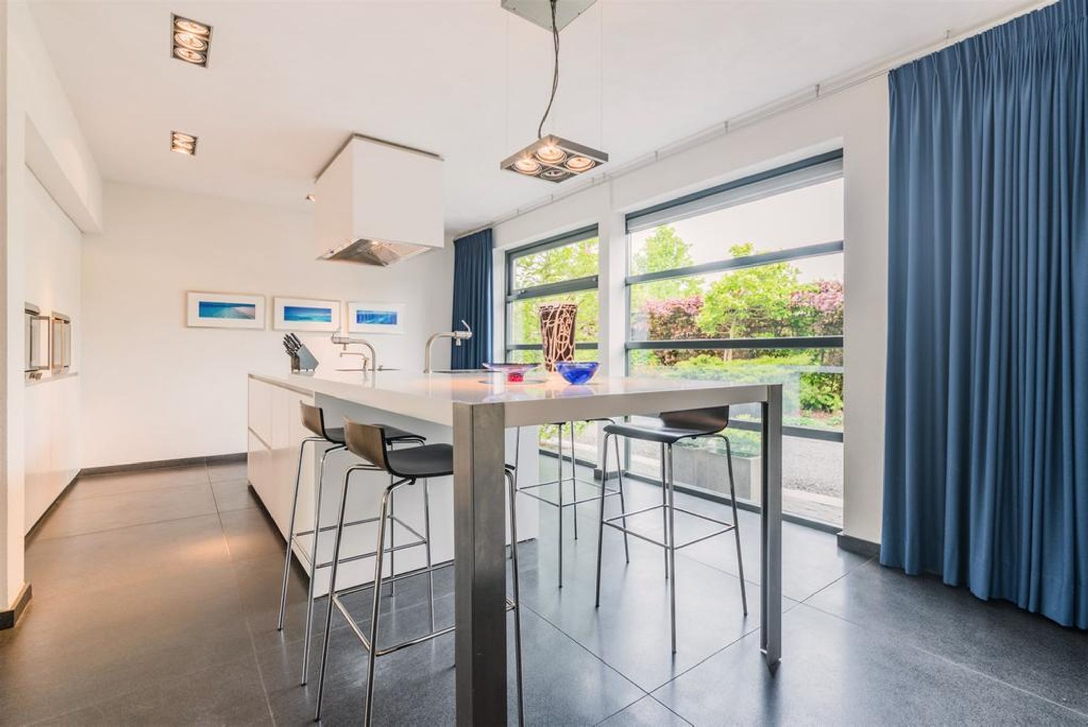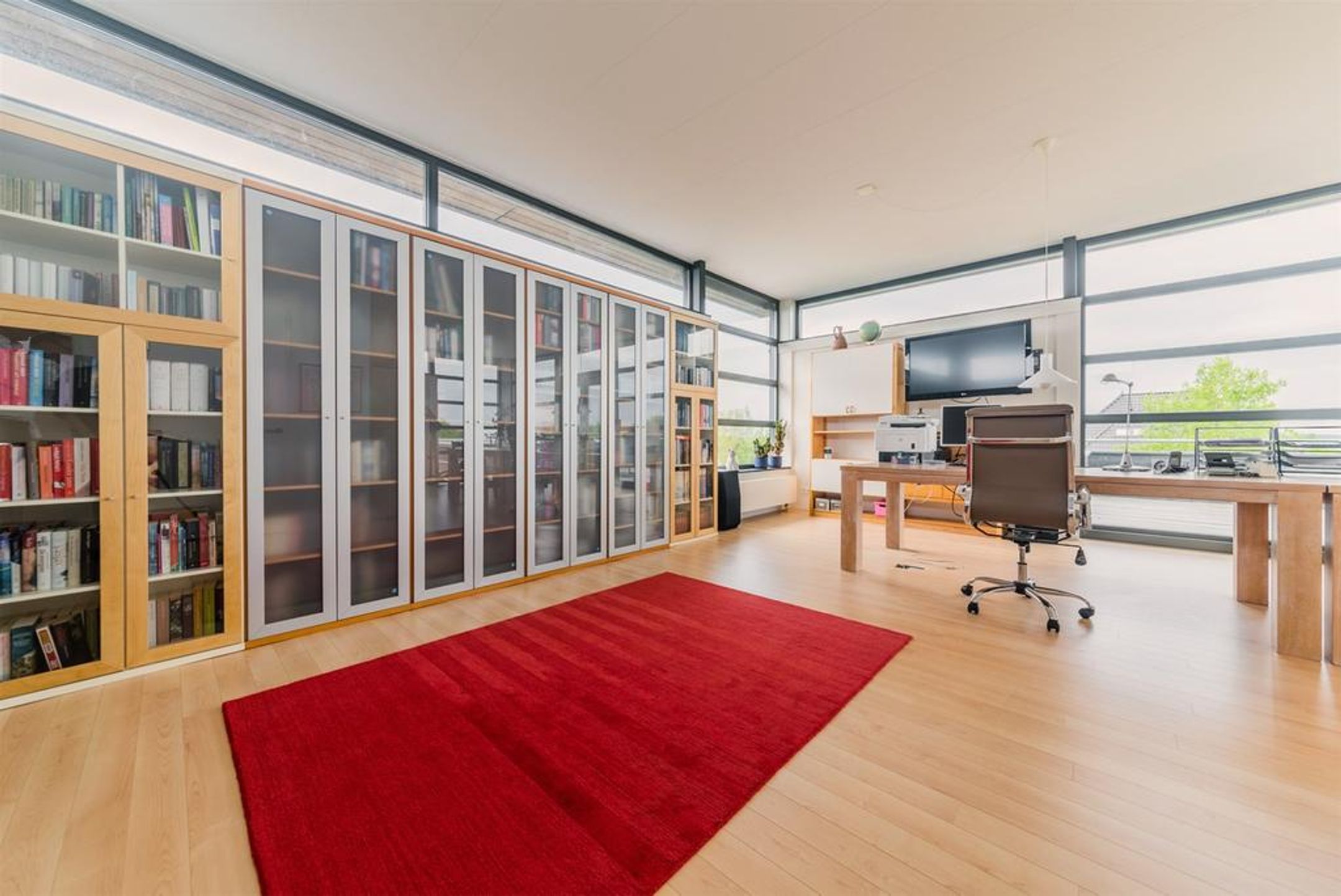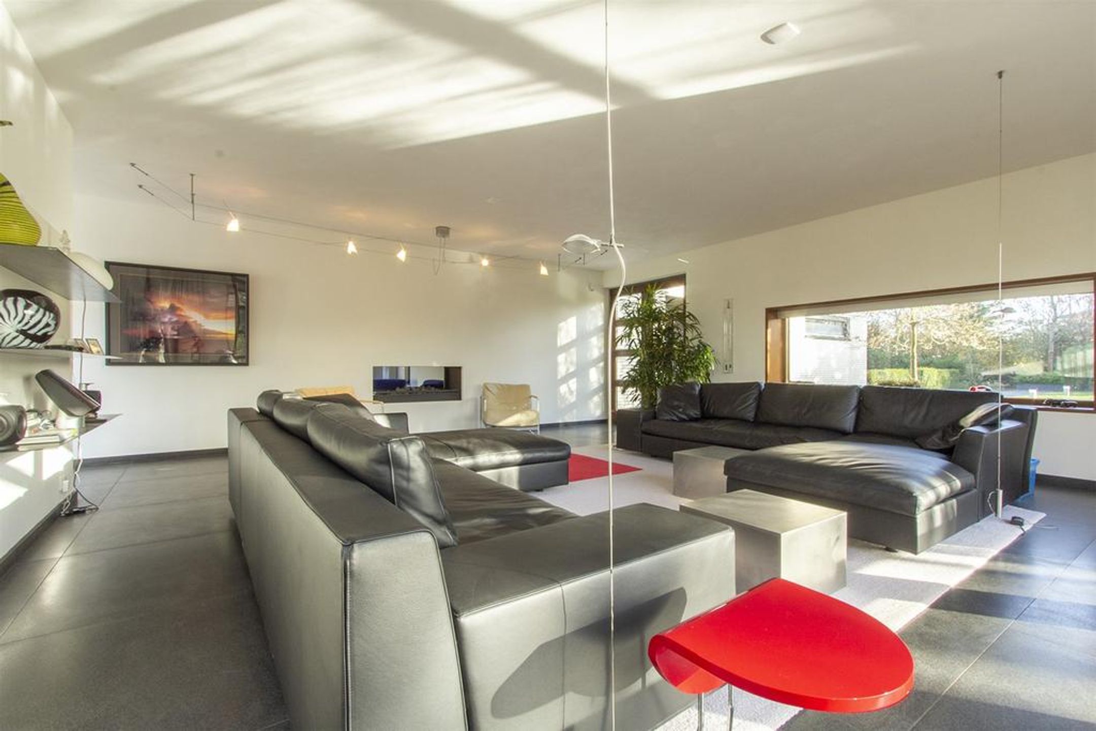 De royale living beschikt over twee in grootte variërende zitkamers. De grote raampartijen rondom, voorzien van dubbele openslaande deuren, bieden zicht op en toegang tot de prachtige tuin met zwemvijver. Een tweede ruime zithoek is ingericht als tv-hoek. Tussen de twee kamers is de moderne BOLEY gashaard gesitueerd. De ramen op de zuid- en westzijde zijn voorzien van screens.
