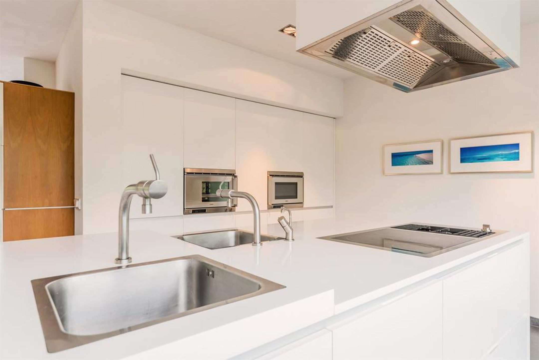 De moderne en luxe keuken van het Italiaanse kwaliteitsmerk BOFFI staat opgesteld in een wandmodule en een kook/spoeleiland met vier barkrukken. De fronten en het werkblad zijn uitgevoerd in wit Corian. U beschikt over veel bergruimte in de diverse lades en kasten voorzien van aluminium legplanken. De afzuigunit is weggewerkt in een kolom van Corian. U beschikt over een BOFFI keramische kookplaat en gas/wok brander, een GAGGENAU oven/magnetron, een GAGGENAU hetelucht-/stoomoven met vaste wateraansluiting, een LIEBHERR inbouwkoelkast, een MIELE ladekoelkast, een GAGGENAU vaatwasautomaat, een QUOOKER en twee RVS spoelbakken.