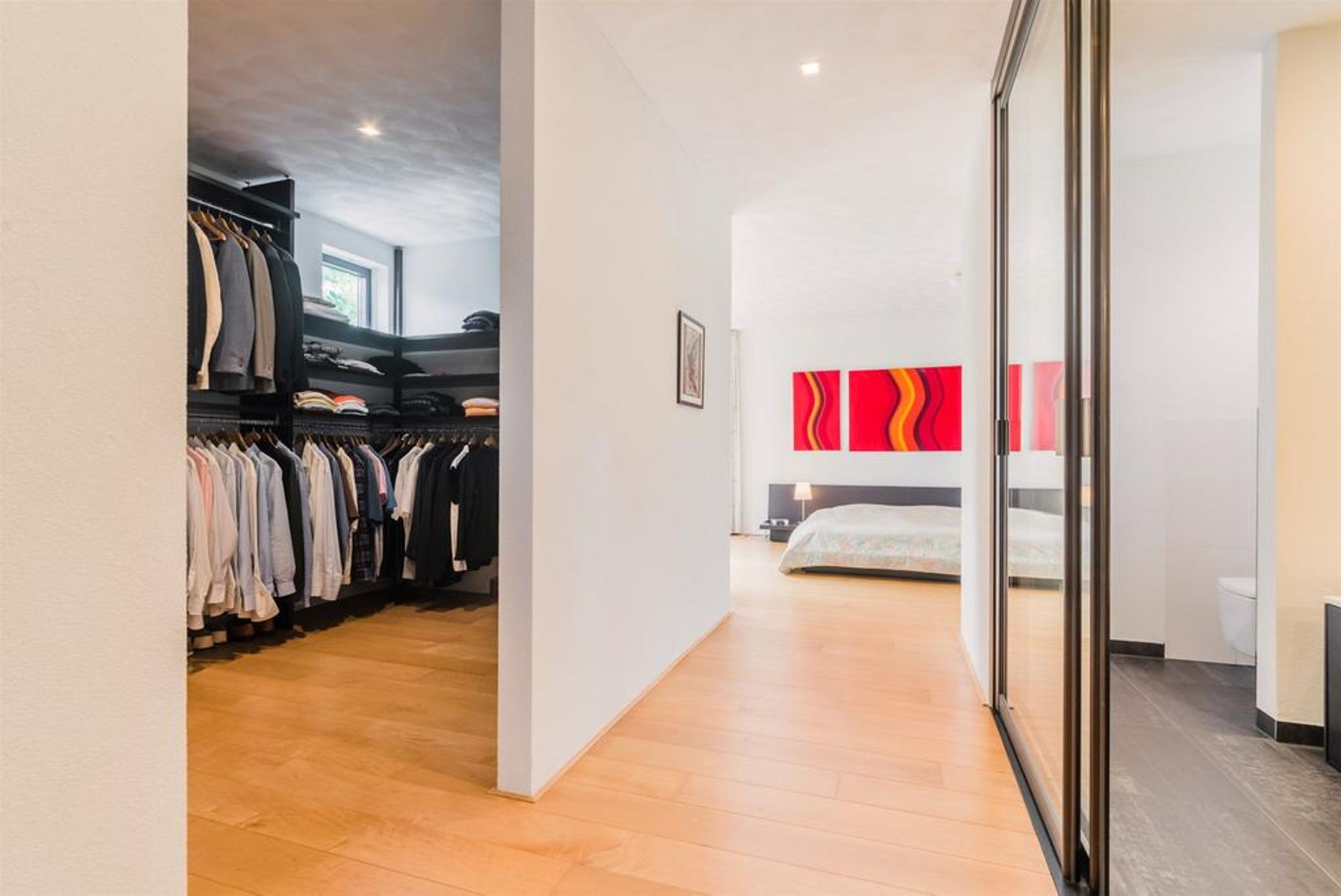 Door dubbele deuren betreedt u de "Mastersuite" met master bedroom, garderobekamer en luxe badkamer. Op de vloer ligt een Maple houten vloer doorlopend naar de master bedroom en de garderobekamer. De master bedroom beschikt over een hardhouten hefschuifpui met zicht en toegang tot de schitterende tuin. De kastelementen (overname) in de garderobekamer bieden veel ruimte voor uw garderobe. Een raam biedt wenselijk daglicht.