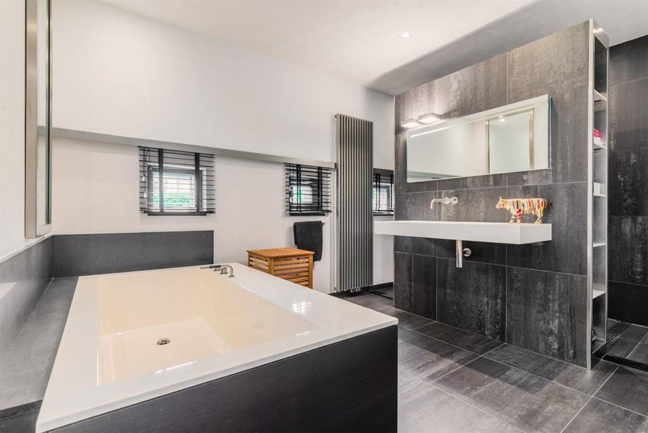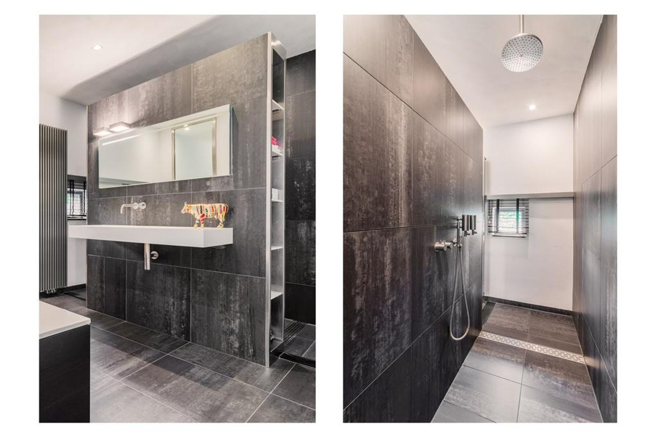 Achter glazen schuifwand bevindt zich de luxe badkamer met in het plafond inbouwspots. Op de vloer liggen keramische tegels met vloerverwarming. Centraal staat een groot BOFFI ligbad met luxe ombouw van Wengé en Natuursteen. Achter een tussenwand is de inloopdouche gesitueerd met regendouche en separate handdouche van het designmerk VOLA.