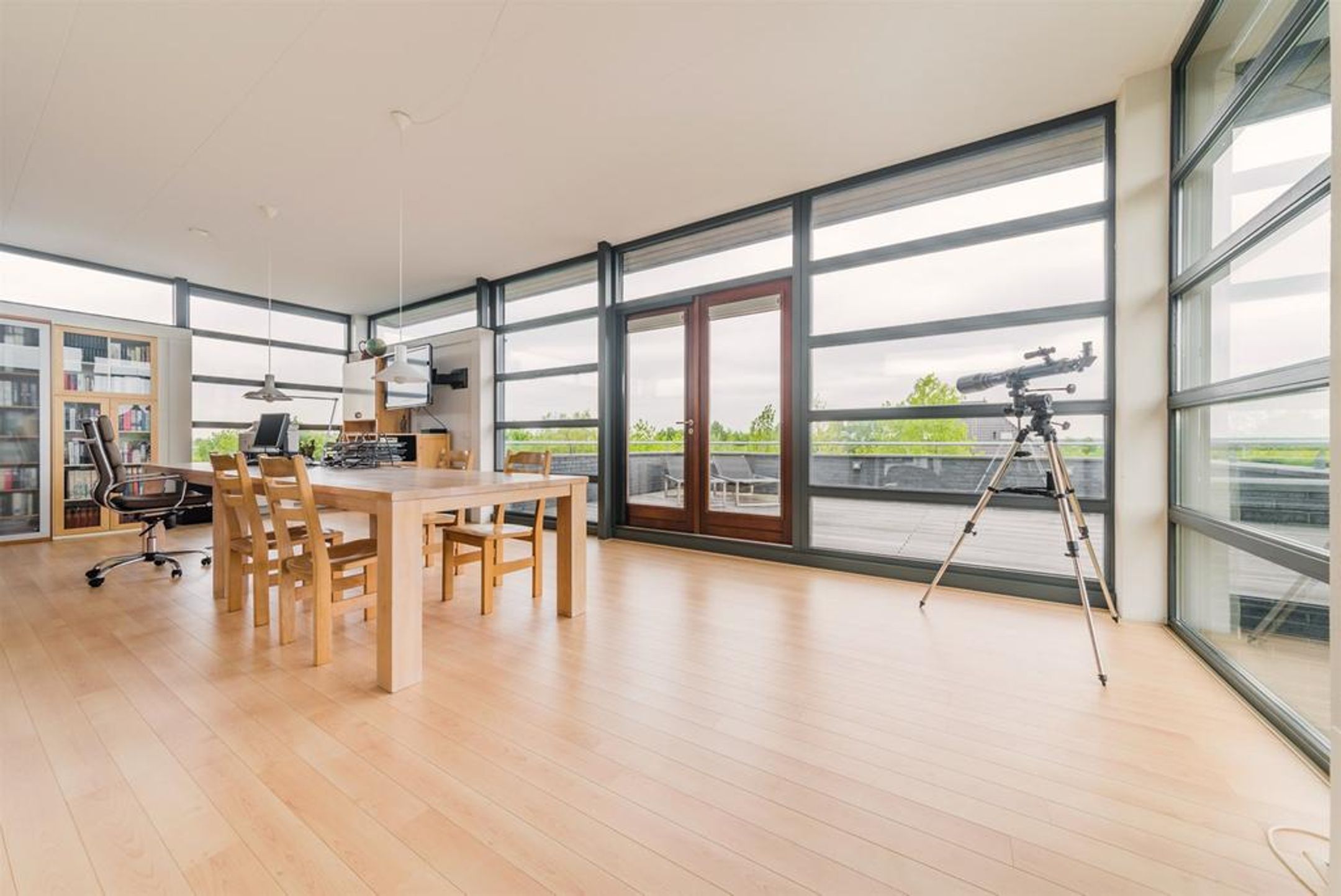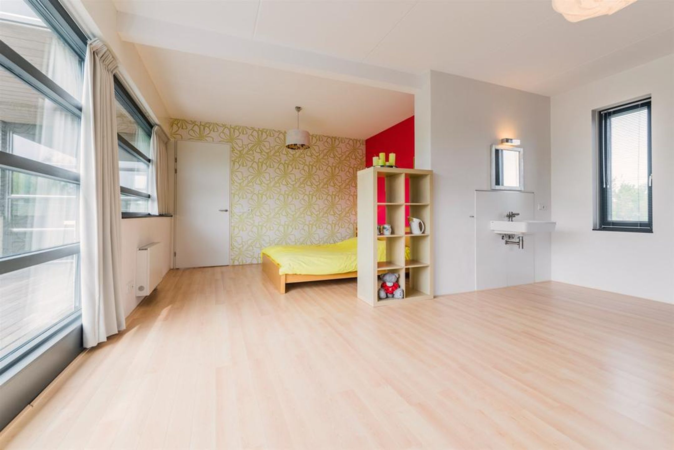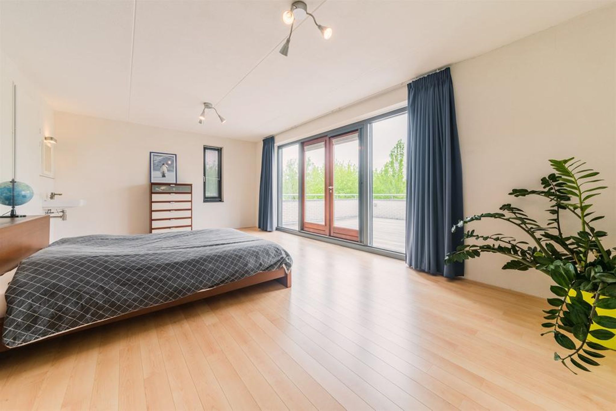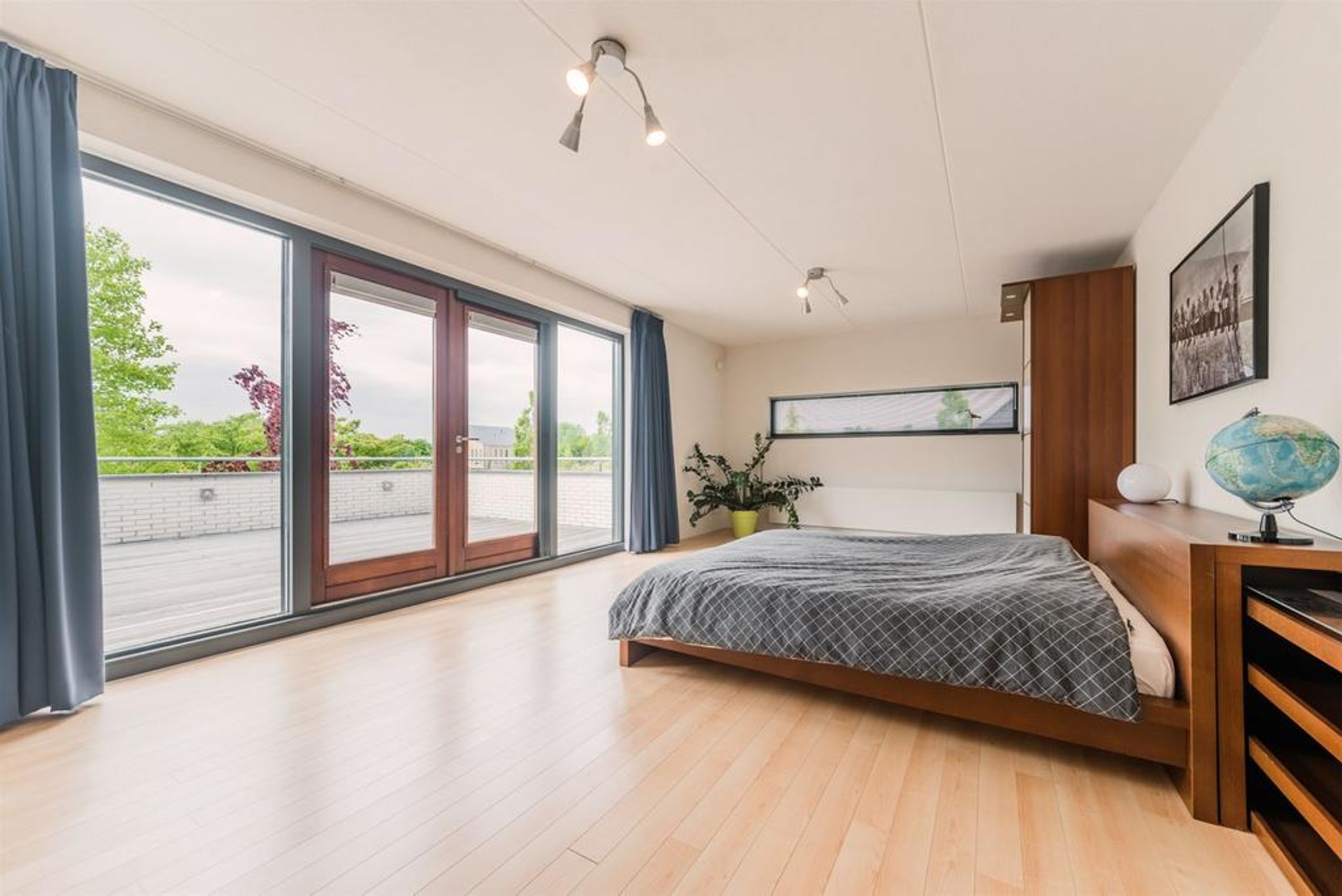 De royale derde slaapkamer beschikt eveneens over een wastafel en is op eenvoudige wijze te splitsen waardoor er een extra slaapkamer ontstaat. De grote raampartij, voorzien van loopdeur, biedt toegang tot een tweede dakterras.