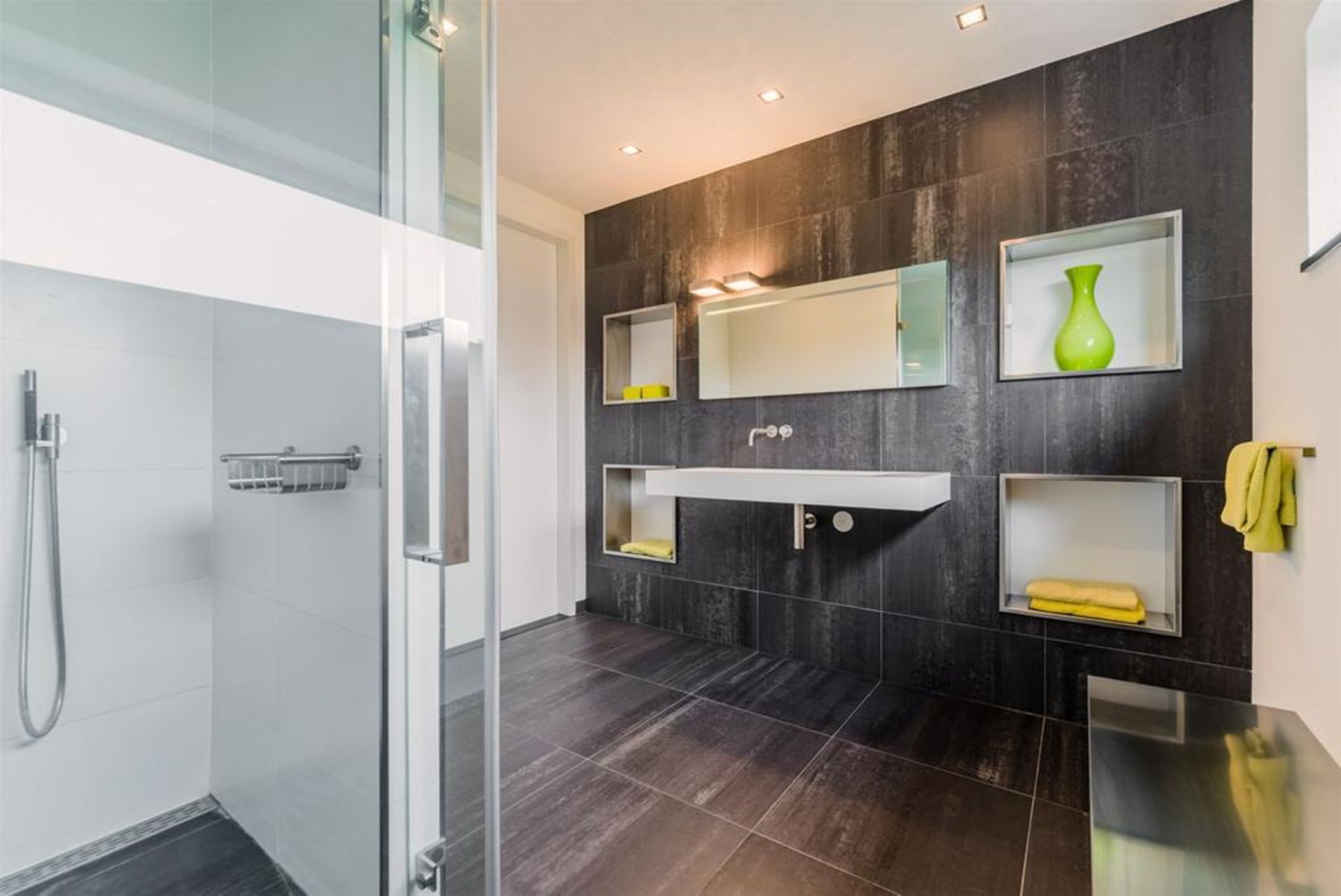Aan de zijkant zijn RVS vakken gecreëerd tbv uw handdoeken en badproducten. Aan de wand treft u een designradiator. In een nis bevindt zich het closet voorzien van inbouwreservoir.