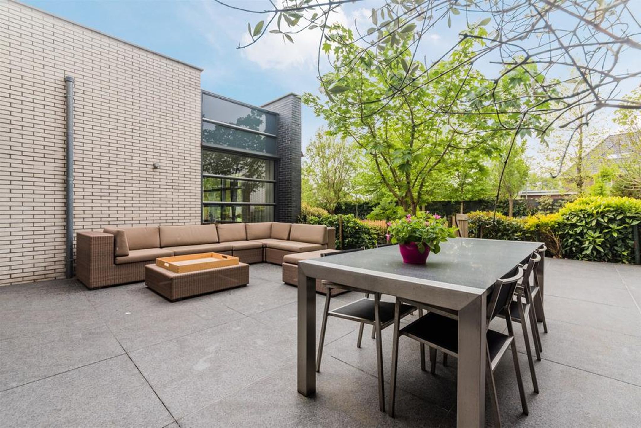 Onder architectuur aangelegde tuin met meerdere terrassen, tuinkamers, groot gazon, diverse borders met diversiteit aan planten, struiken en bomen, grote moestuin, pergola voorzien van blauwe en witte regen, praktische buitenberging en overkapping. Stijlvolle materialen zoals Basaltnatuursteen, Basaltsplit en de grote grijze 1 x 1m vloertegels geven een luxe uitstraling. Verder beschikt u over buitenverlichting, zonwering, screens, een spoelbak voorzien van waterkraan, buitenkraan en schrobput.