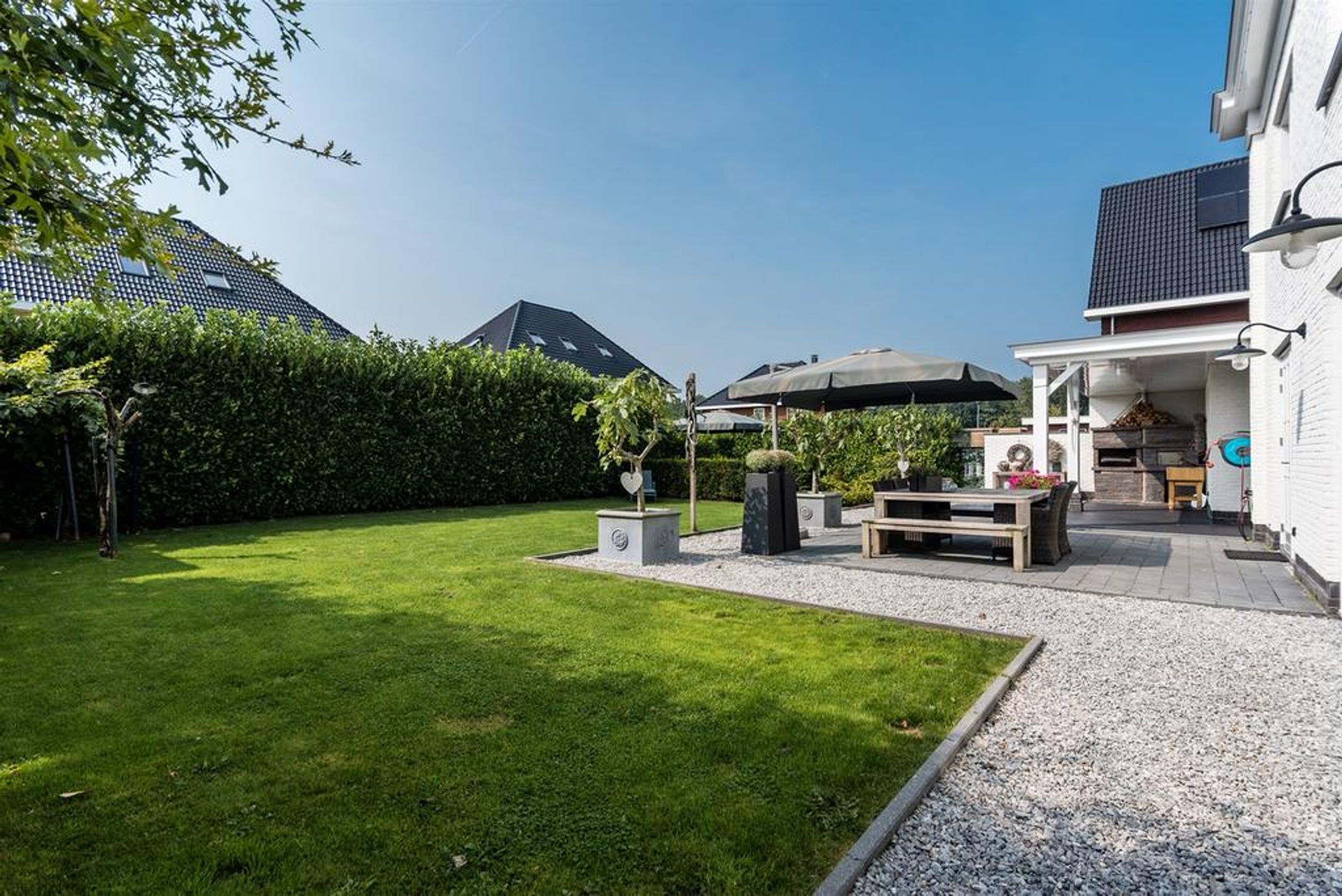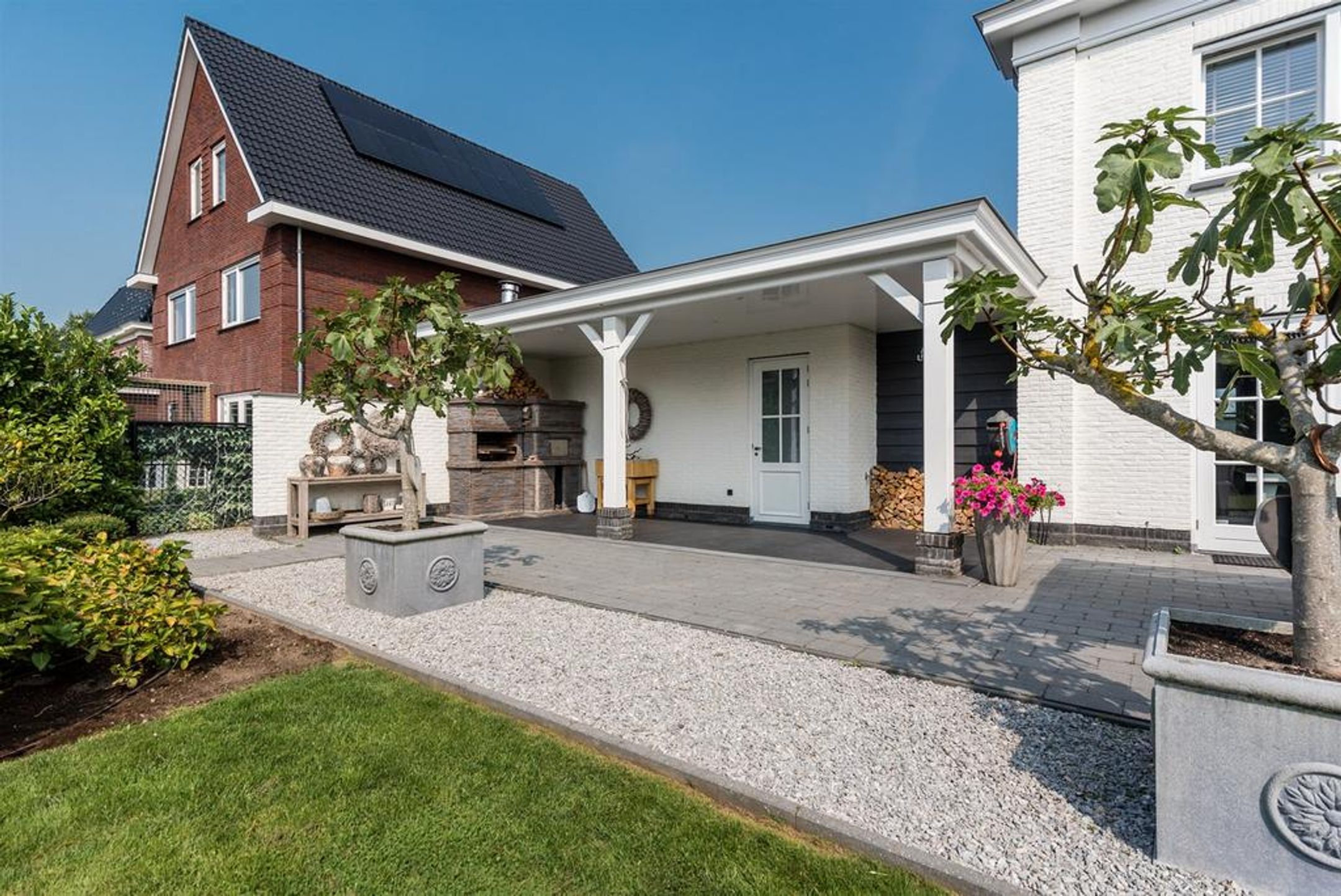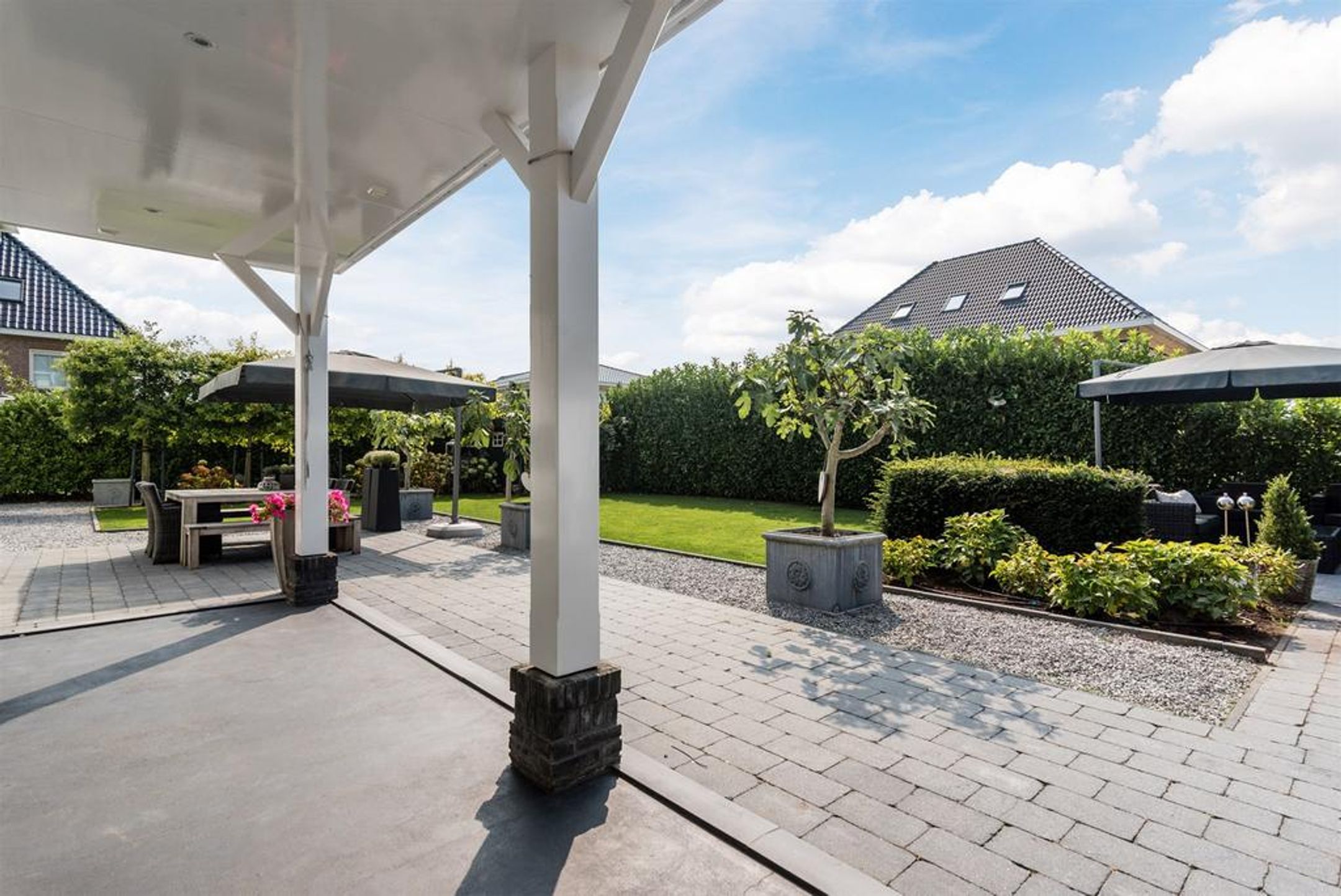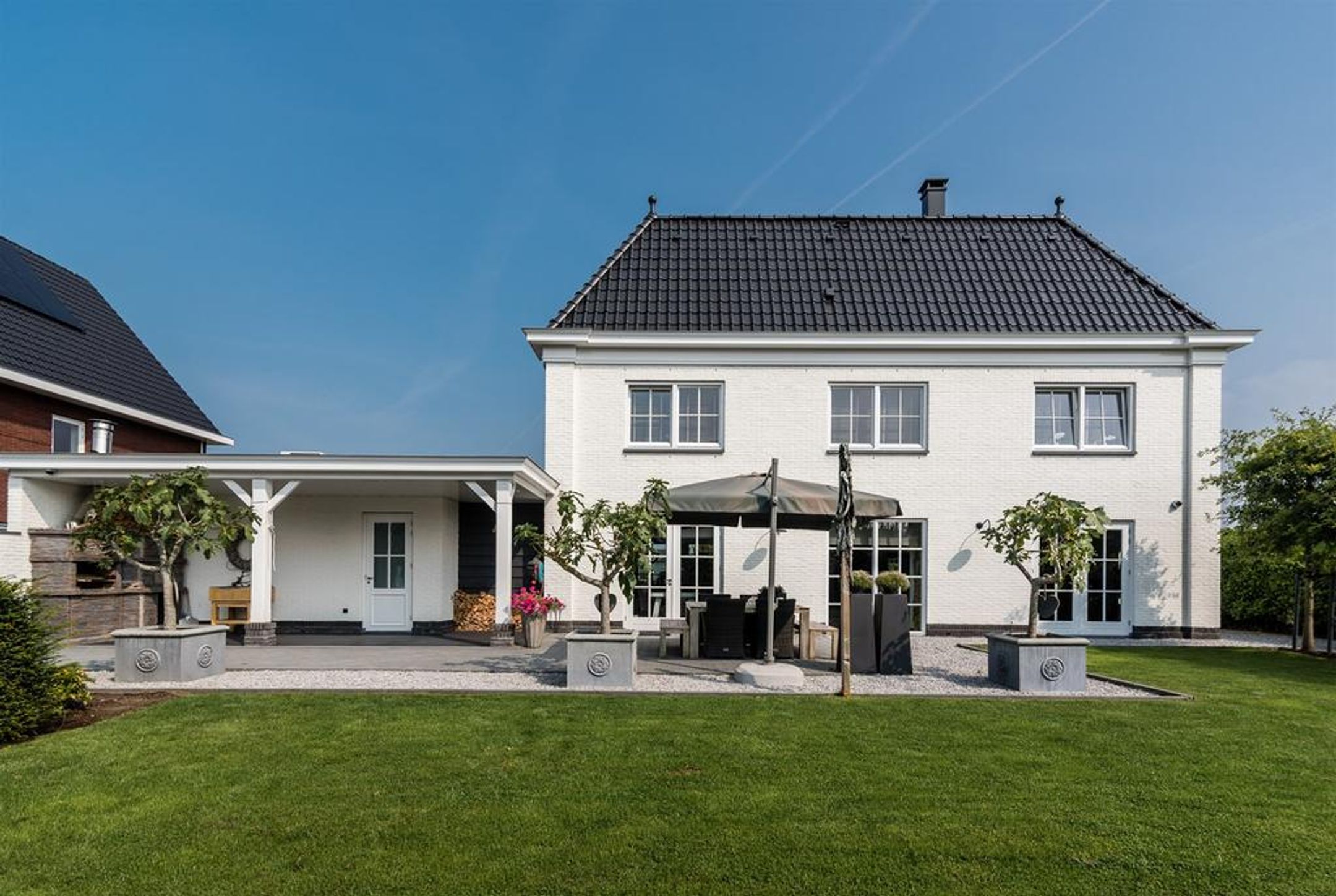 - brede zonnige achtertuin voorzien van rijk gedetailleerde overkapping in dezelfde stijl als de woning;