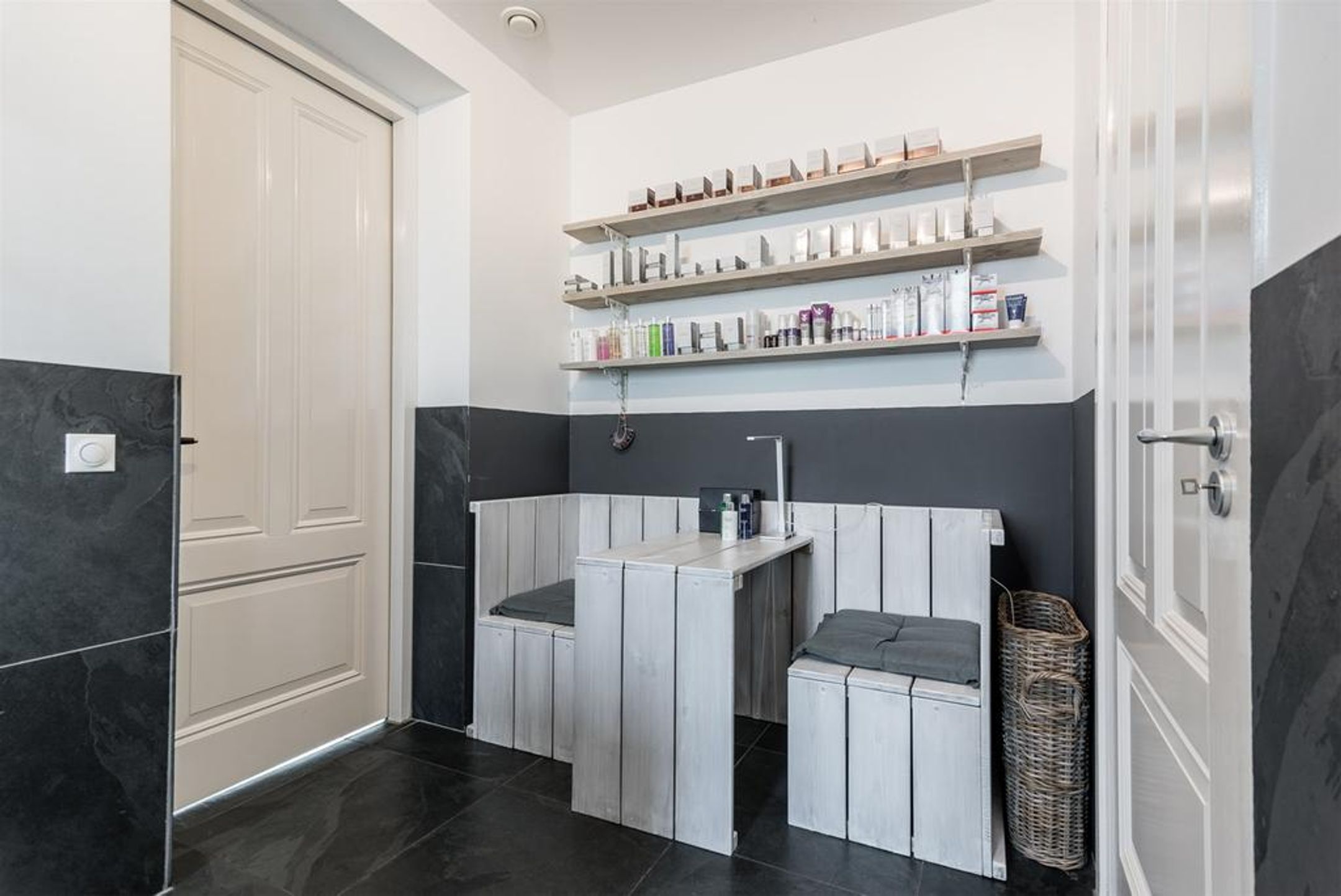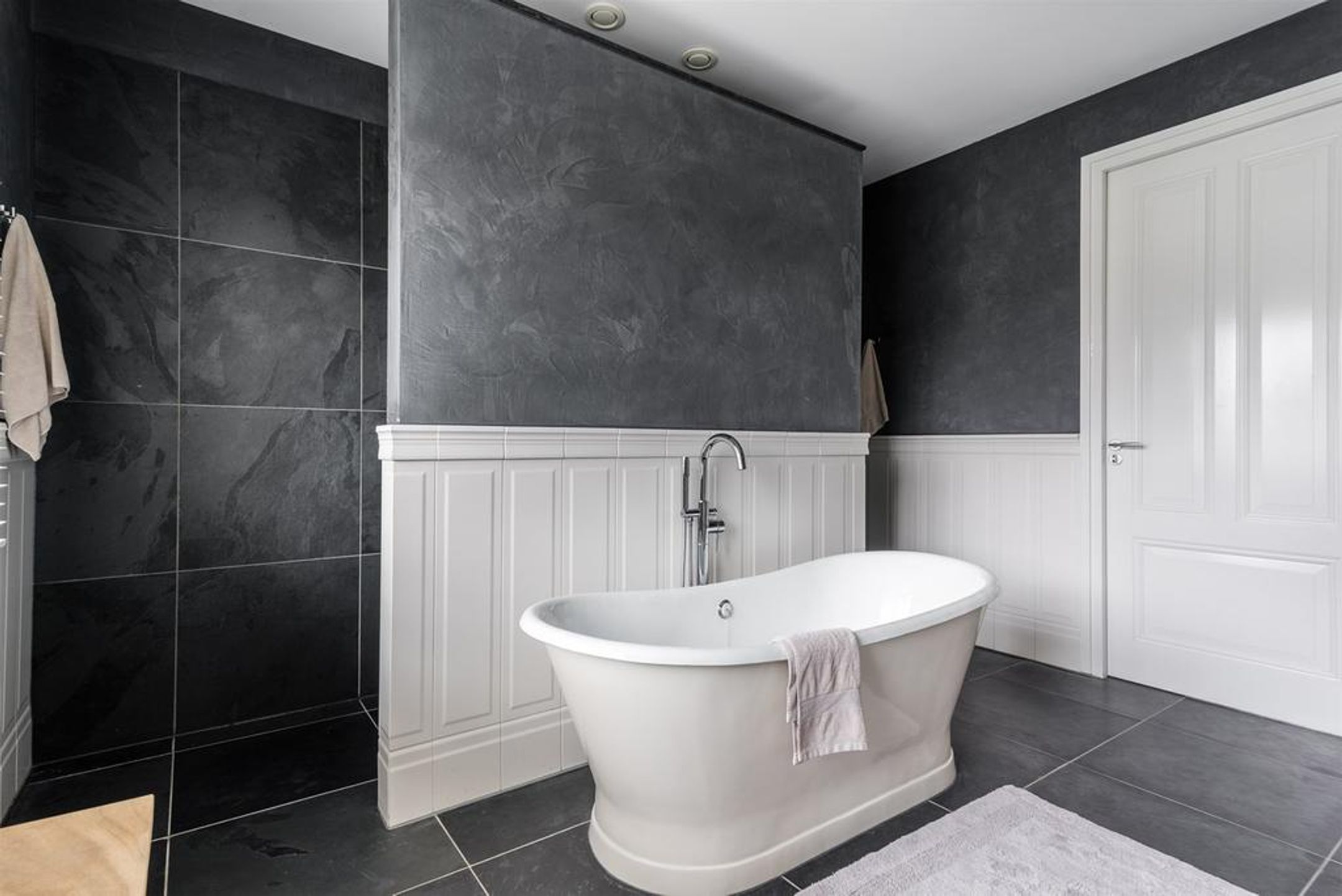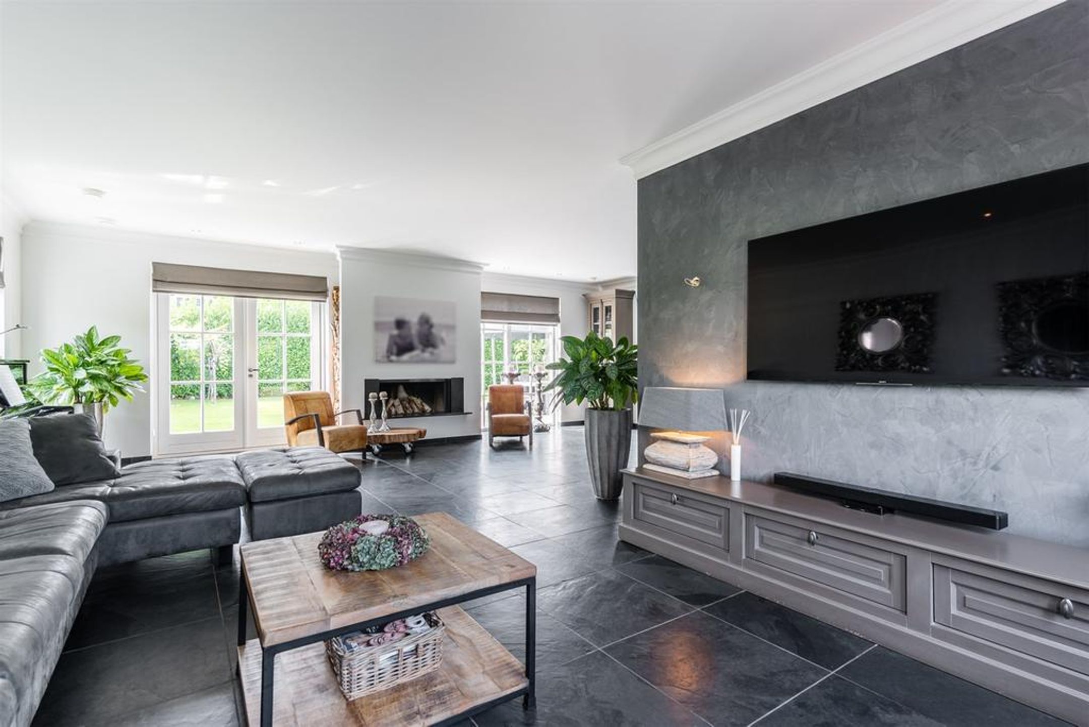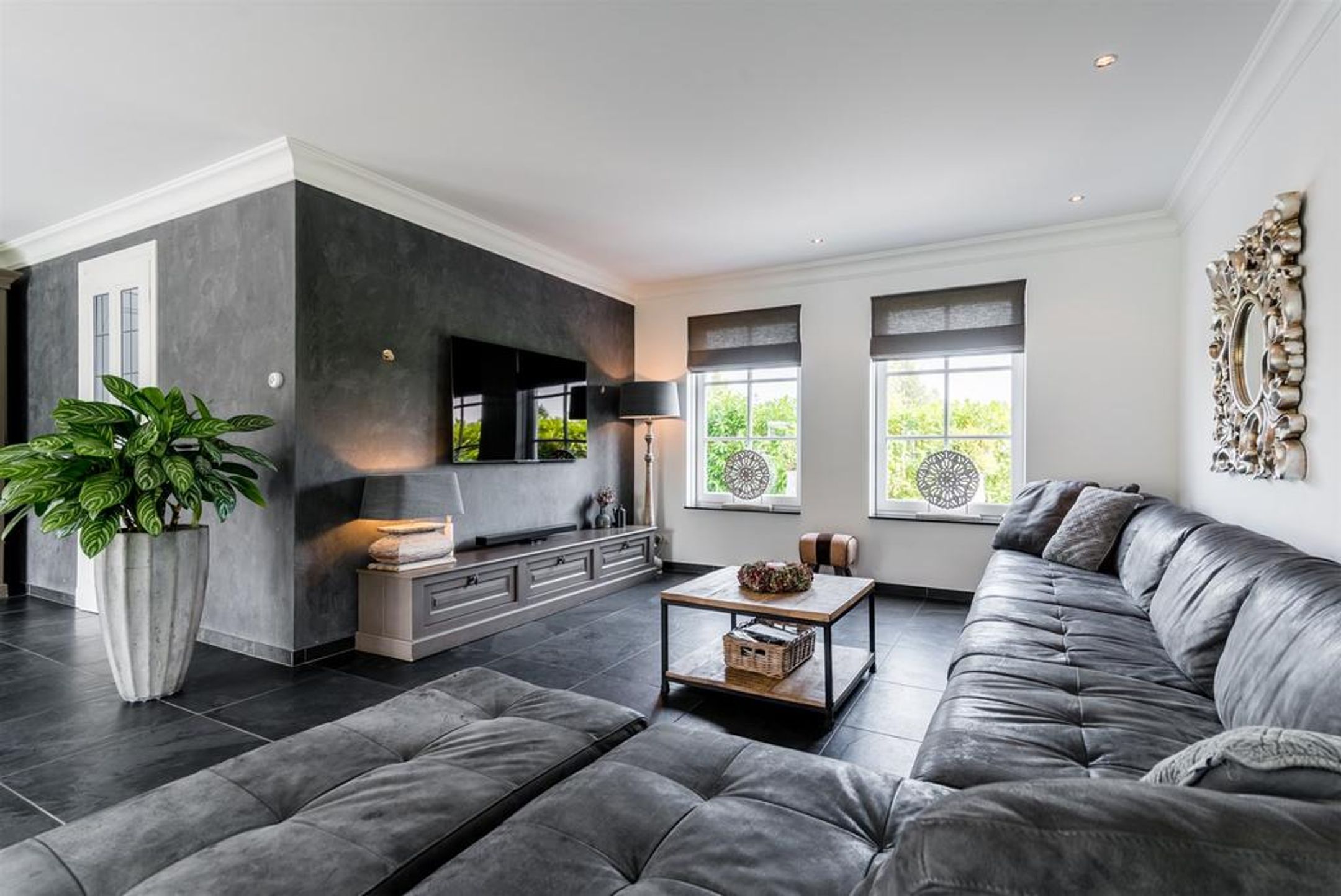 De wanden zijn deels glad gestukt en deels voorzien van een luxe PANDOMO stuklaag en op de vloer liggen grote leisteen vloertegels met daaronder comfortabele vloerverwarming, drempelloos doorlopend naar de andere vertrekken. De stijlvolle en rijk gedetailleerde vide zorgt voor een ruimtelijk en speels effect.
