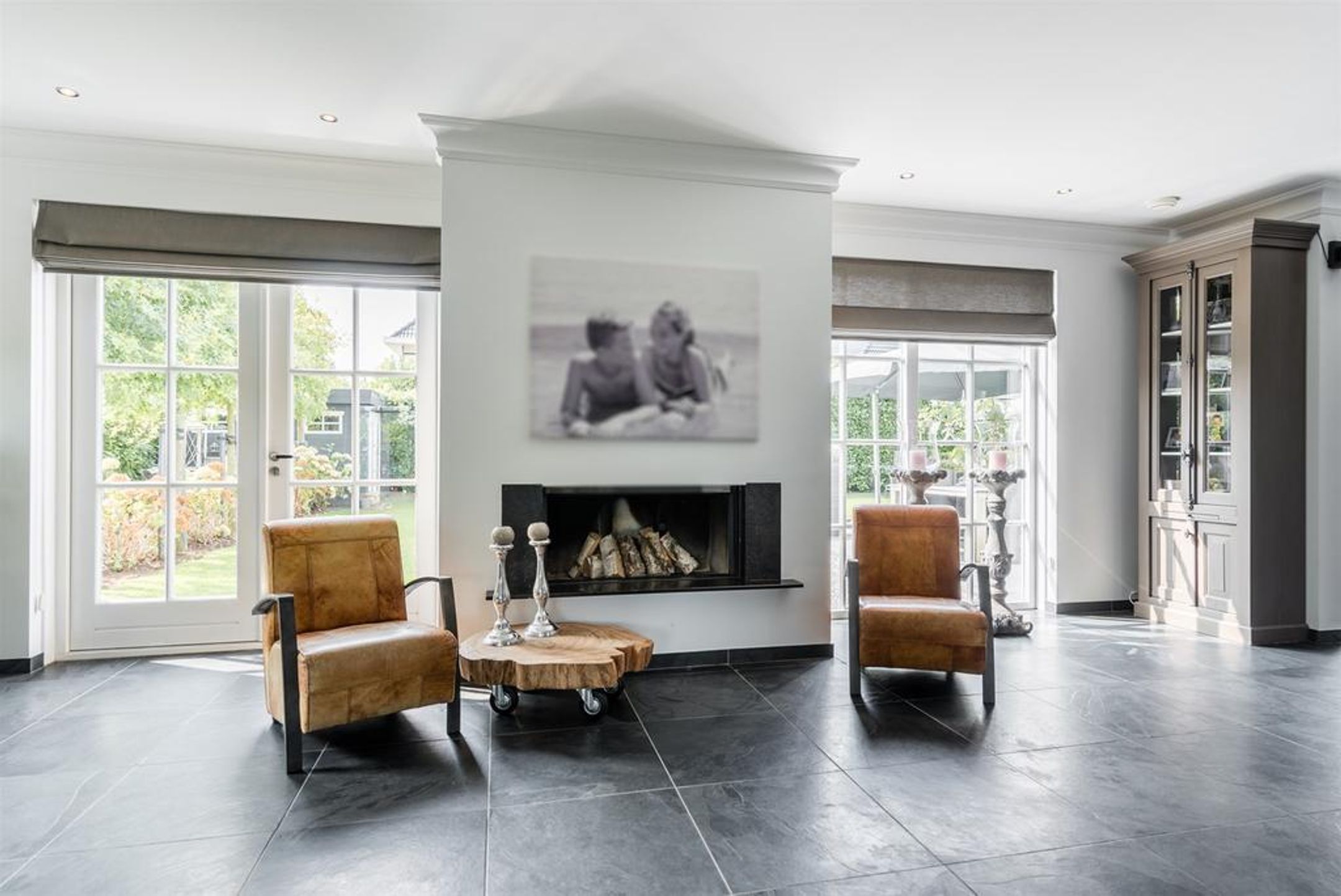 Links is de royale zithoek met TV aansluiting gesitueerd. In het midden rondom de sfeervolle hout gestookte haard bevind zich de 2de zithoek. Links en rechts achter de haard bevinden zich 2 hoge nissen t.b.v. het haardhout.