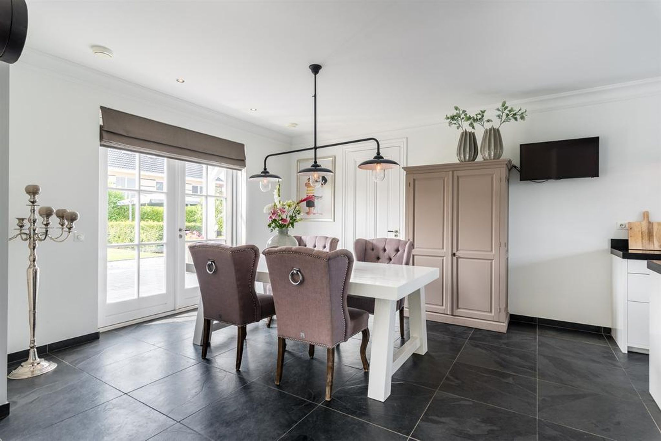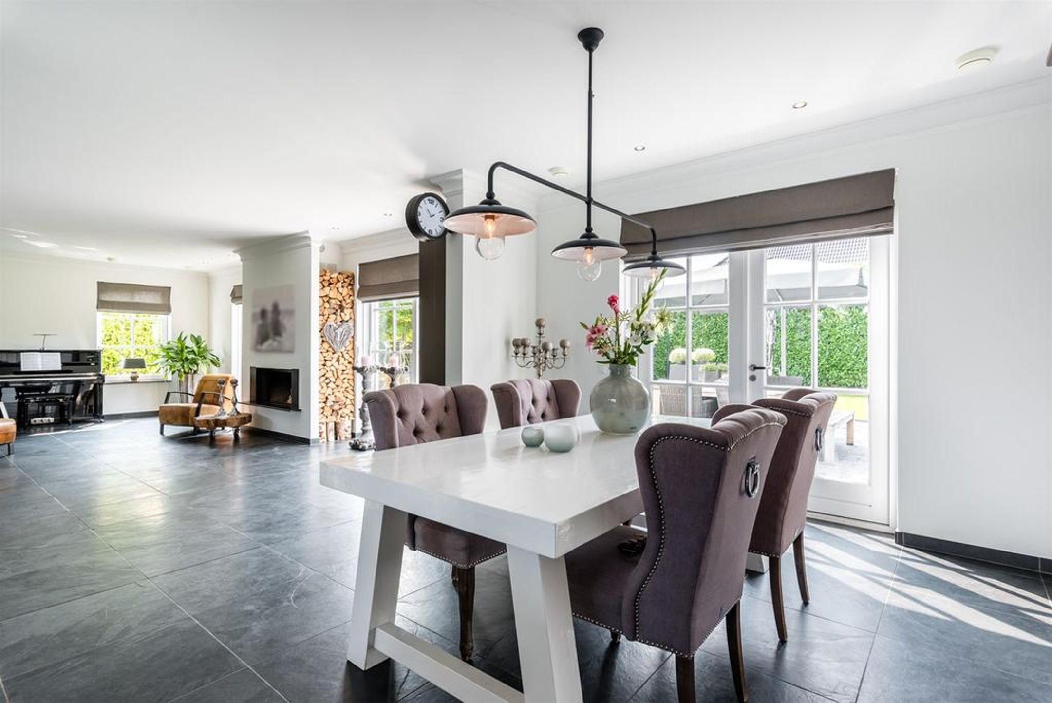De 2 dubbele openslaande deuren en de vele ramen rondom, voorzien van roedeverdeling, bieden zicht op de zonnige tuin en het schitterende naast gelegen park.