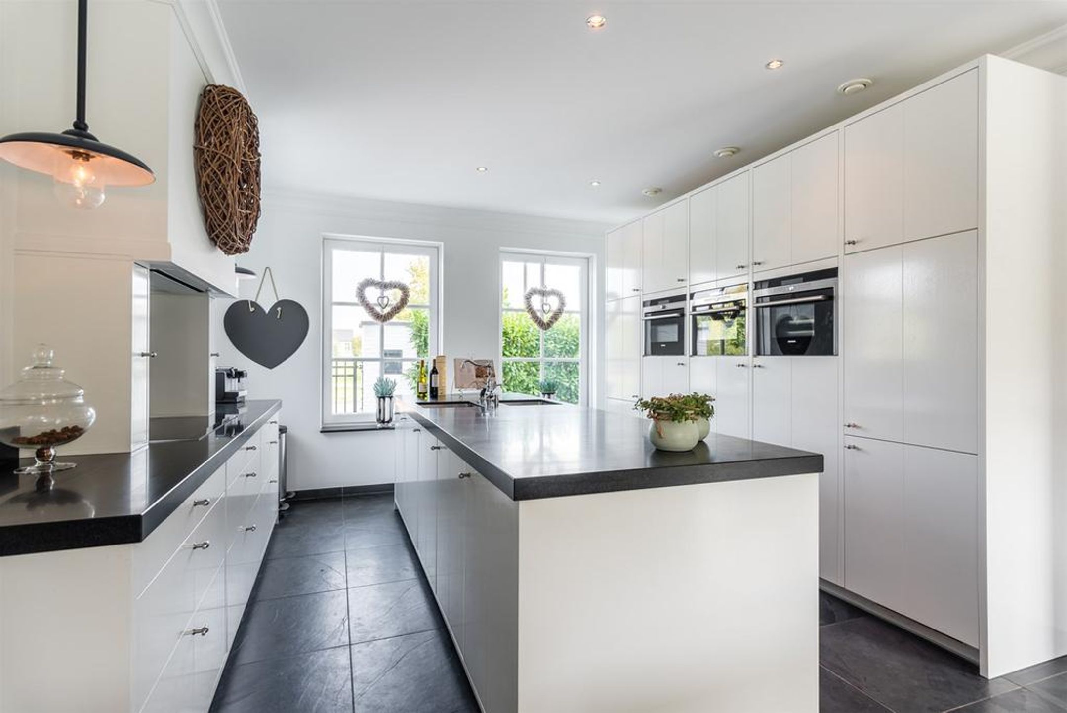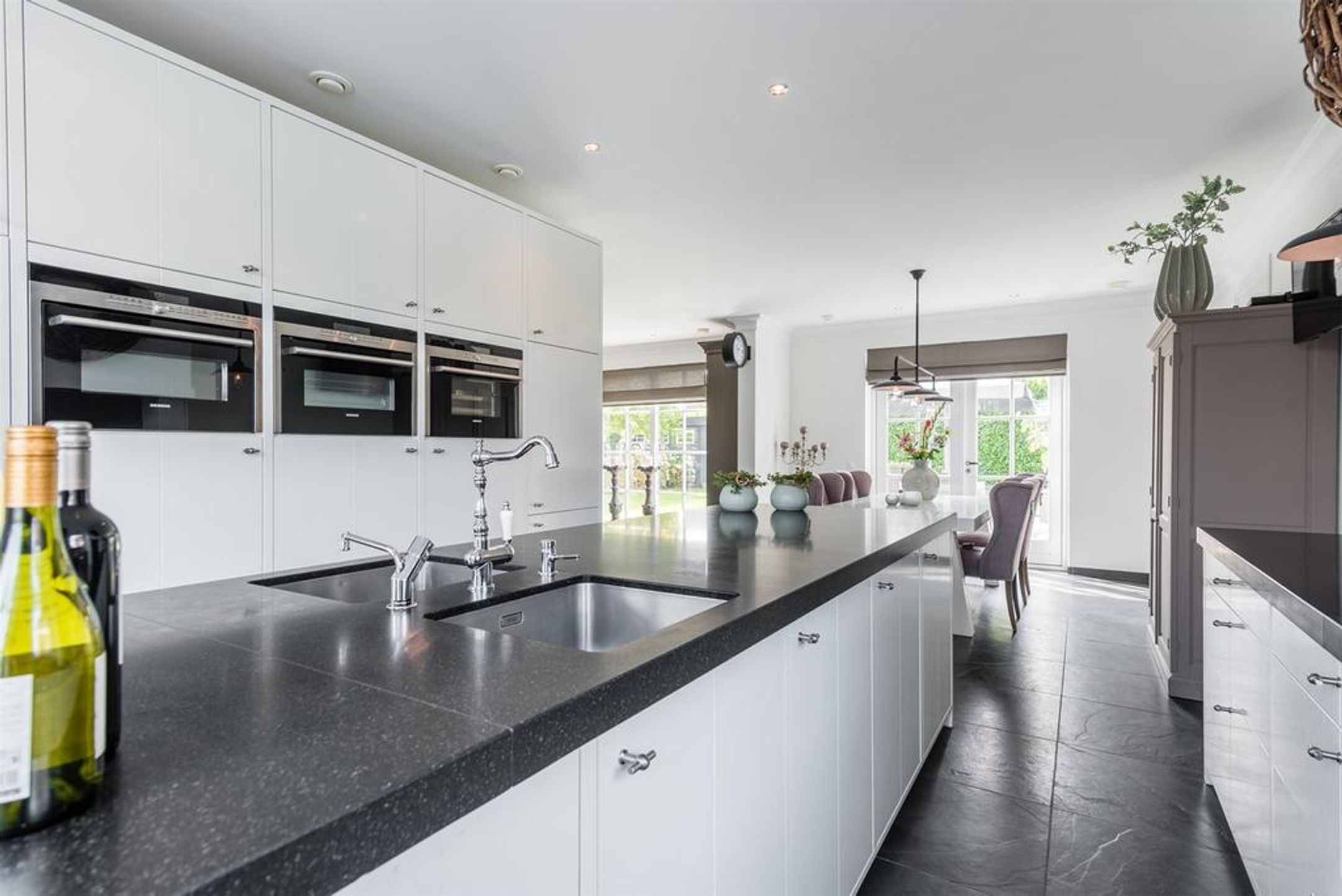 De luxe keuken is opgesteld in 2 wandmodules met in het midden een breed spoeleiland, en uitgevoerd met stijlvolle witte fronten gecombineerd met een donker natuursteen werkblad.