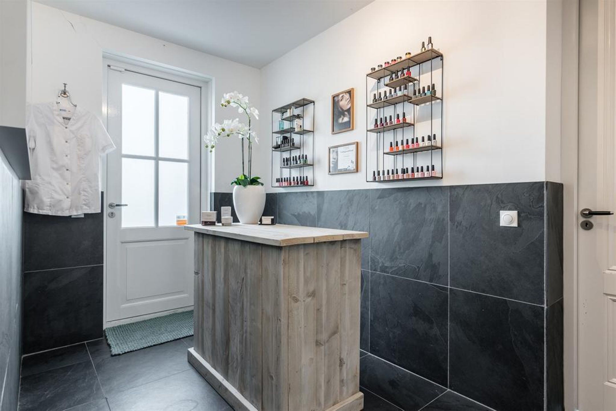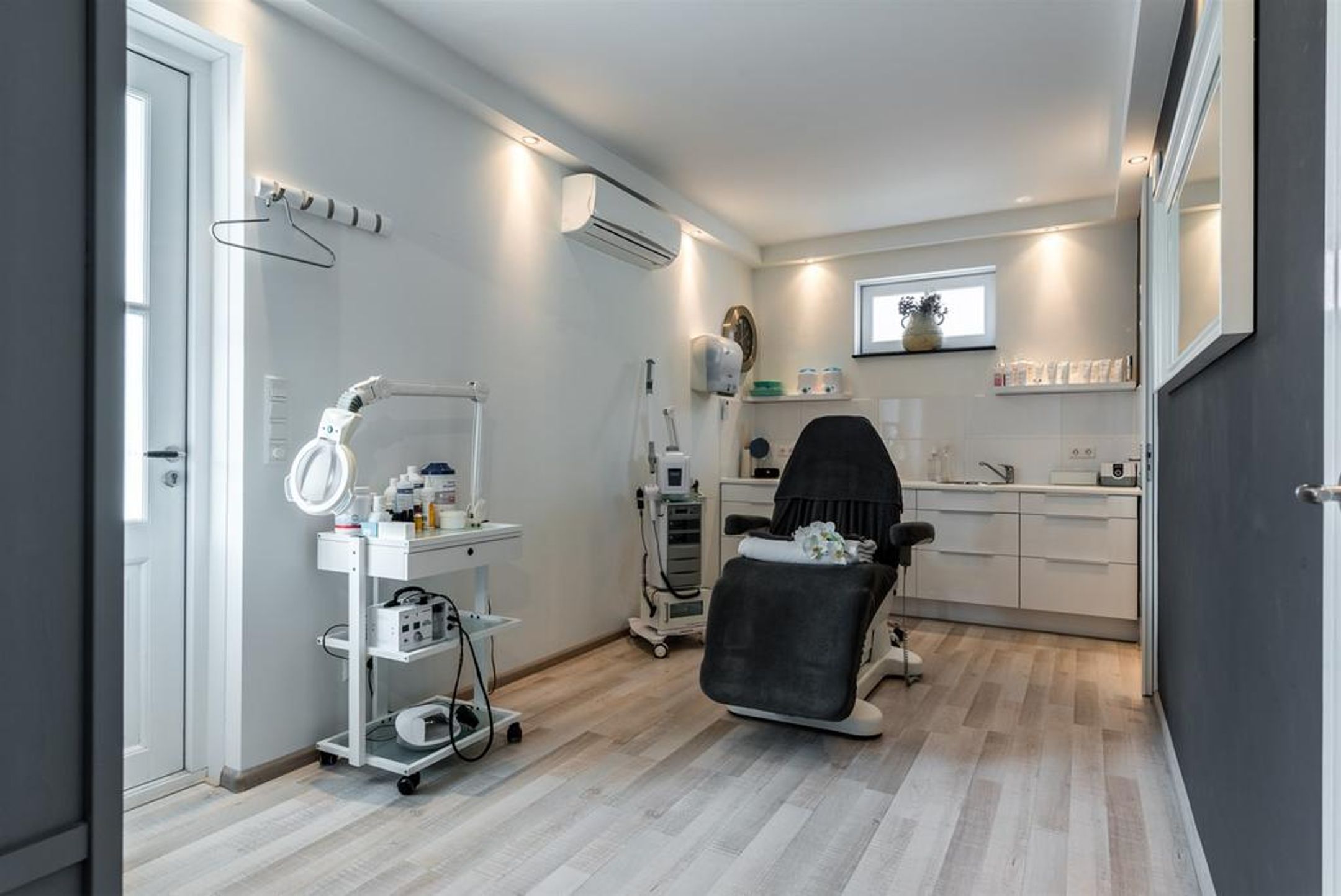 - praktijkruimte beschikt over en eigen toiletruimte, wandmodule voorzien van koud en warm water aansluiting en airco;
