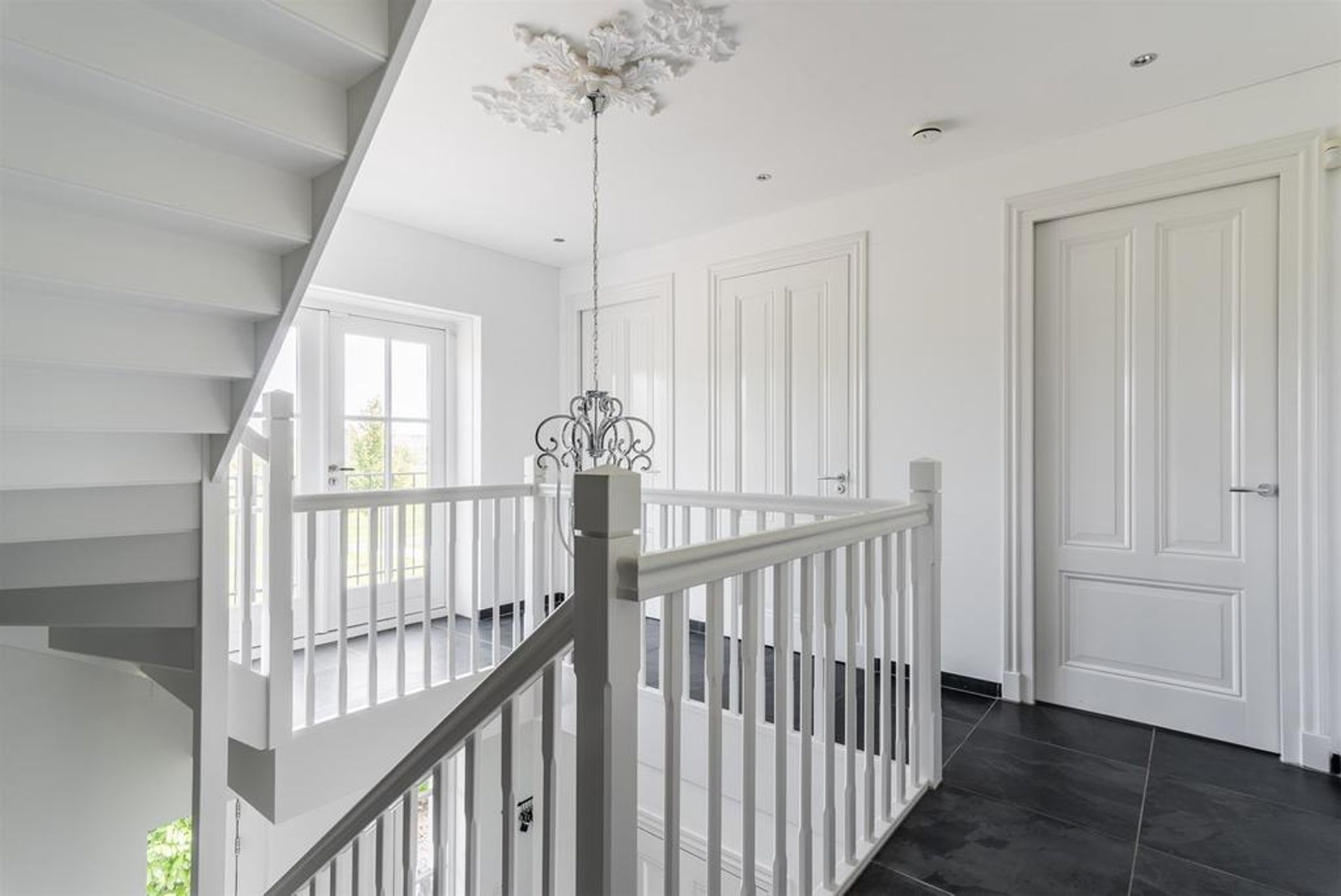 - in de gehele woning stijlvol klassiek en wit geschilderde houten deuren voorzien van blinde scharnieren en luxe deurbeslag;