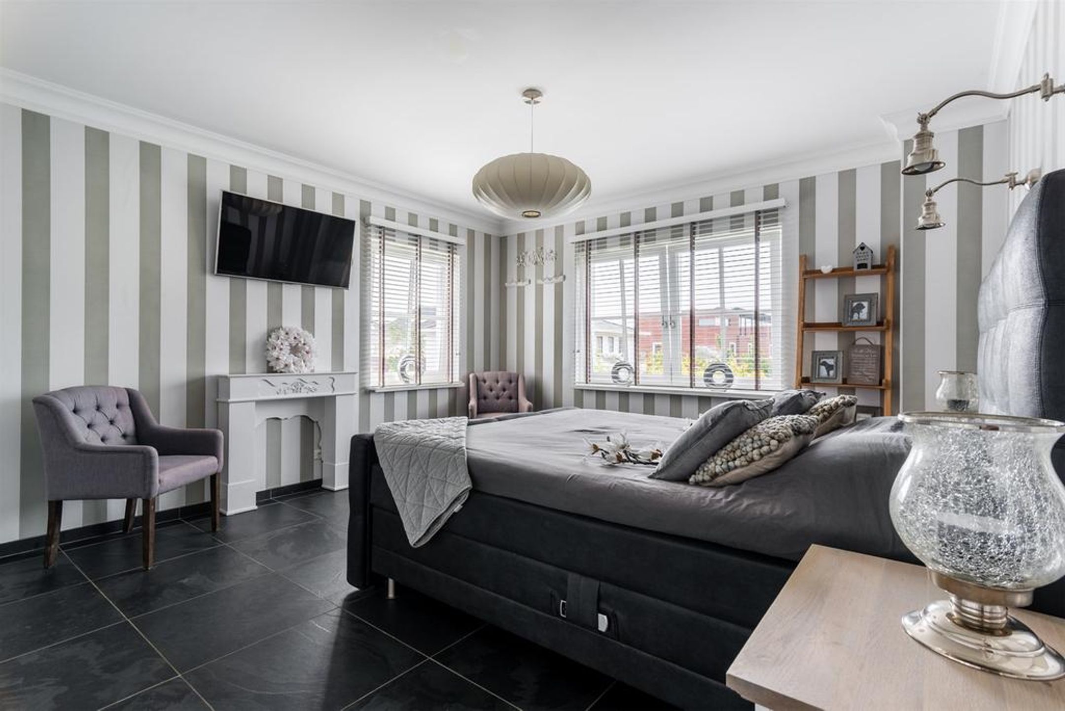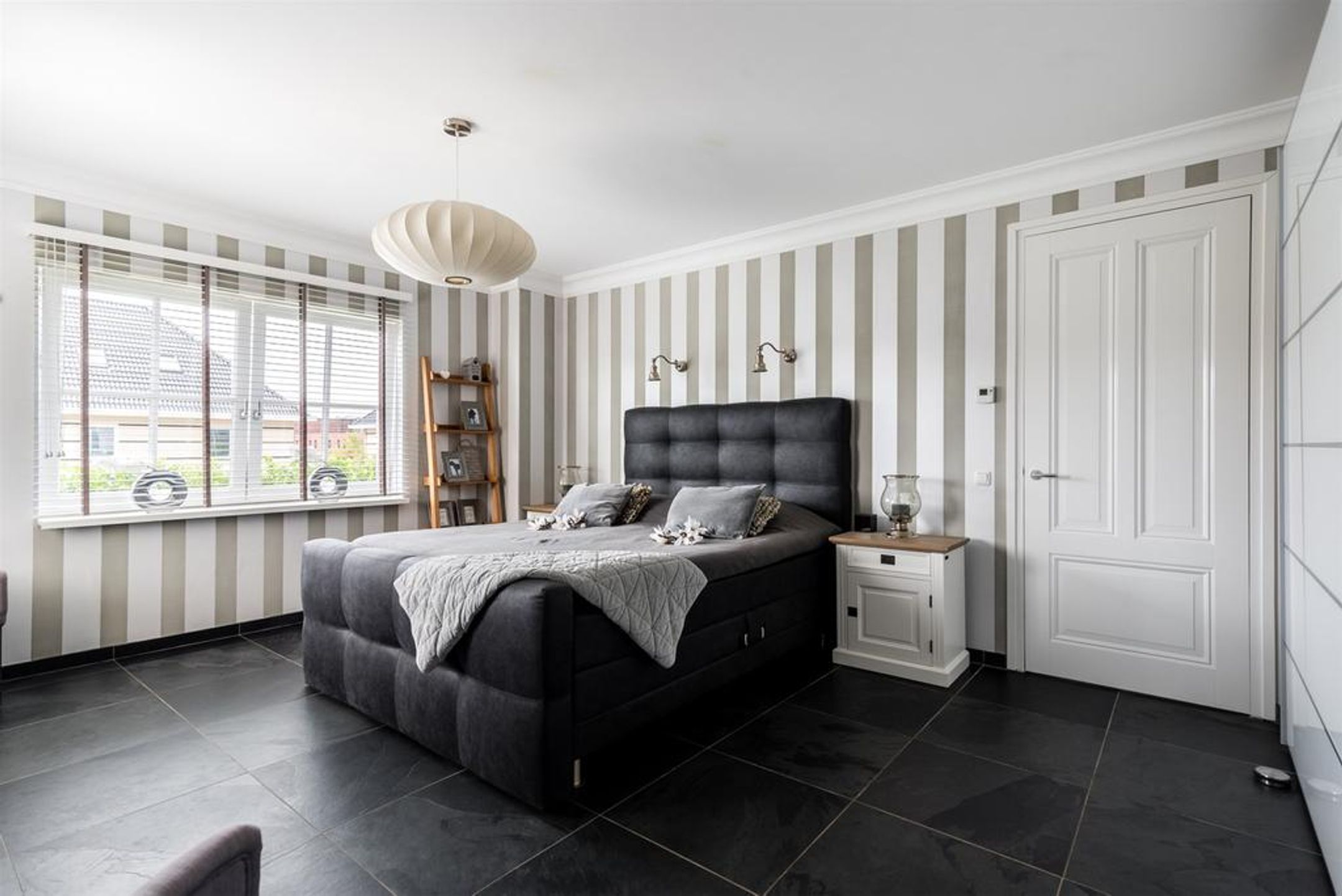 Over de stijlvolle wit geschilderde trap in het rijk getailleerde grote trappenhuis voorzien van vide bereikt u de ruime en lichte overloop op de 1e verdieping welke toegang biedt tot de royale master-bedroom voorzien van zeer brede kastenwand (ter overname), 2 ruime slaapkamers, de luxe en complete badkamer, de separate toiletruimte en de praktische ruime waskamer. De dubbele openslaande deuren voorzien van roedeverdeling bieden zicht op het aangrenzende park en bieden toegang tot het balkon. Het plafond is glad gestukt en voorzien van inbouwspots en een stijlvol plafondornement. De wanden zijn deels glad gestukt en deels voorzien van een luxe PANDOMO stuklaag. Ook op deze verdieping liggen grote leisteen vloertegels drempelloos doorlopend naar alle vertrekken met daaronder comfortabele vloerverwarming.