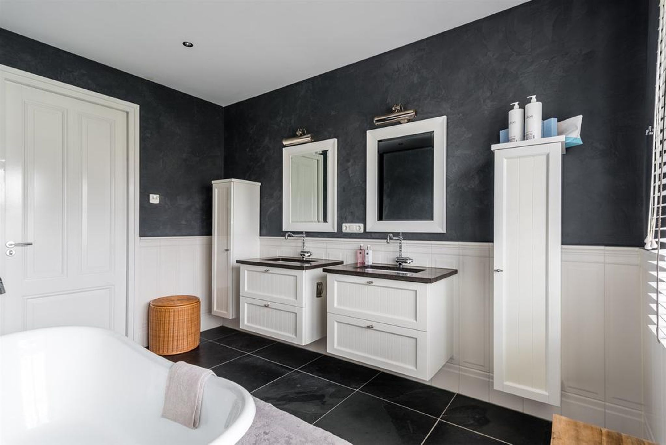 Voorts treft u 2 wasmeubels voorzien van geïntegreerde waskommen, brede lades, spiegels met verlichting en 2 hoge wandkasten.