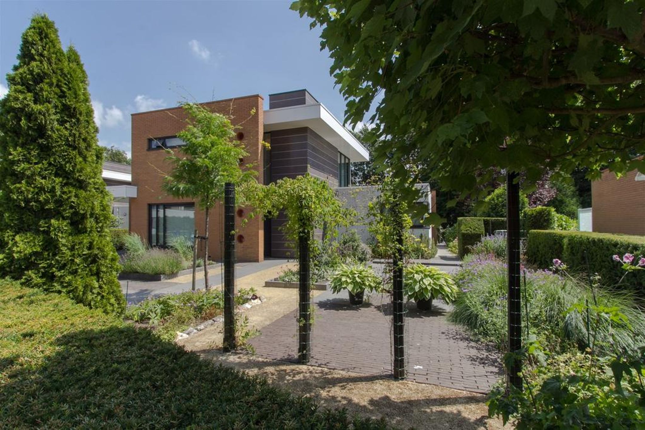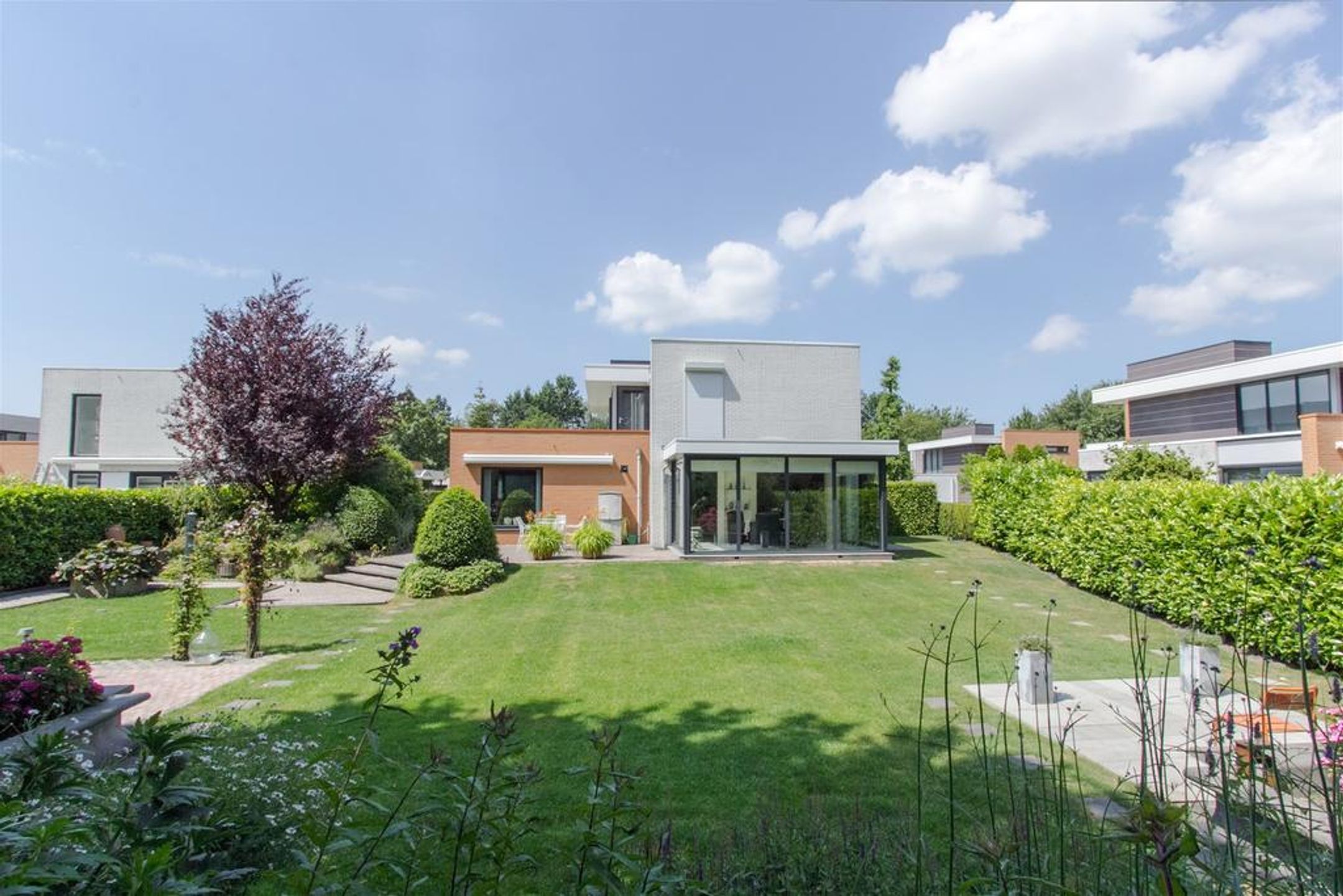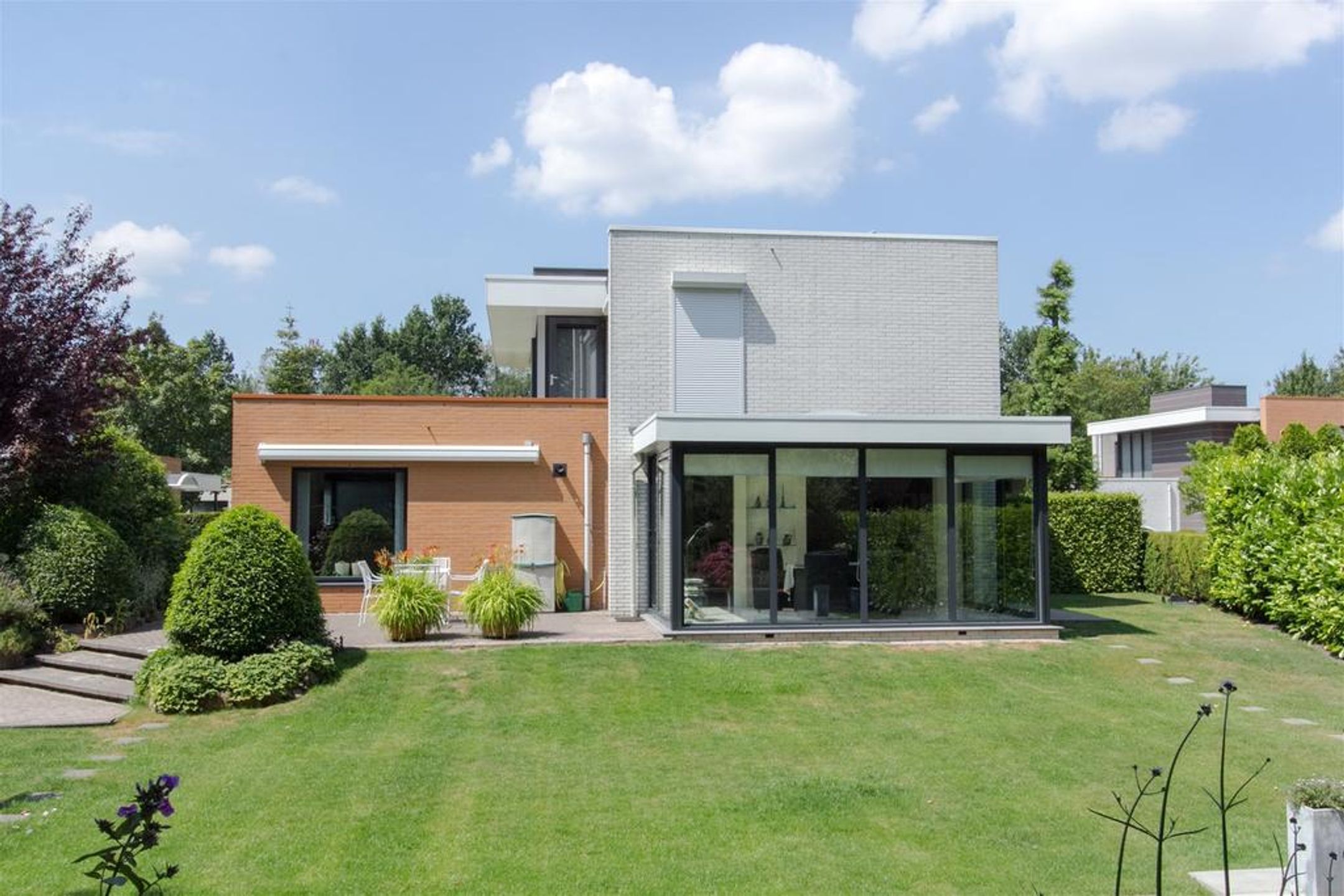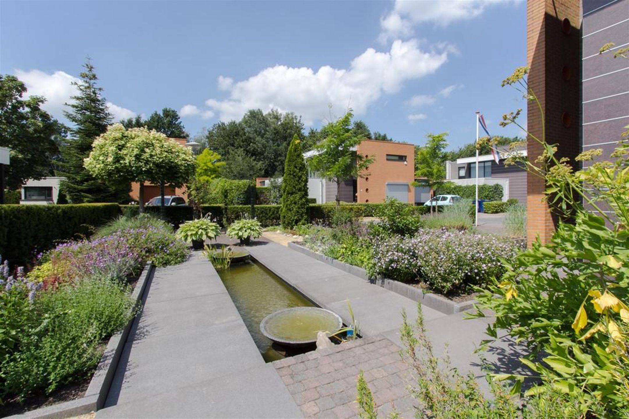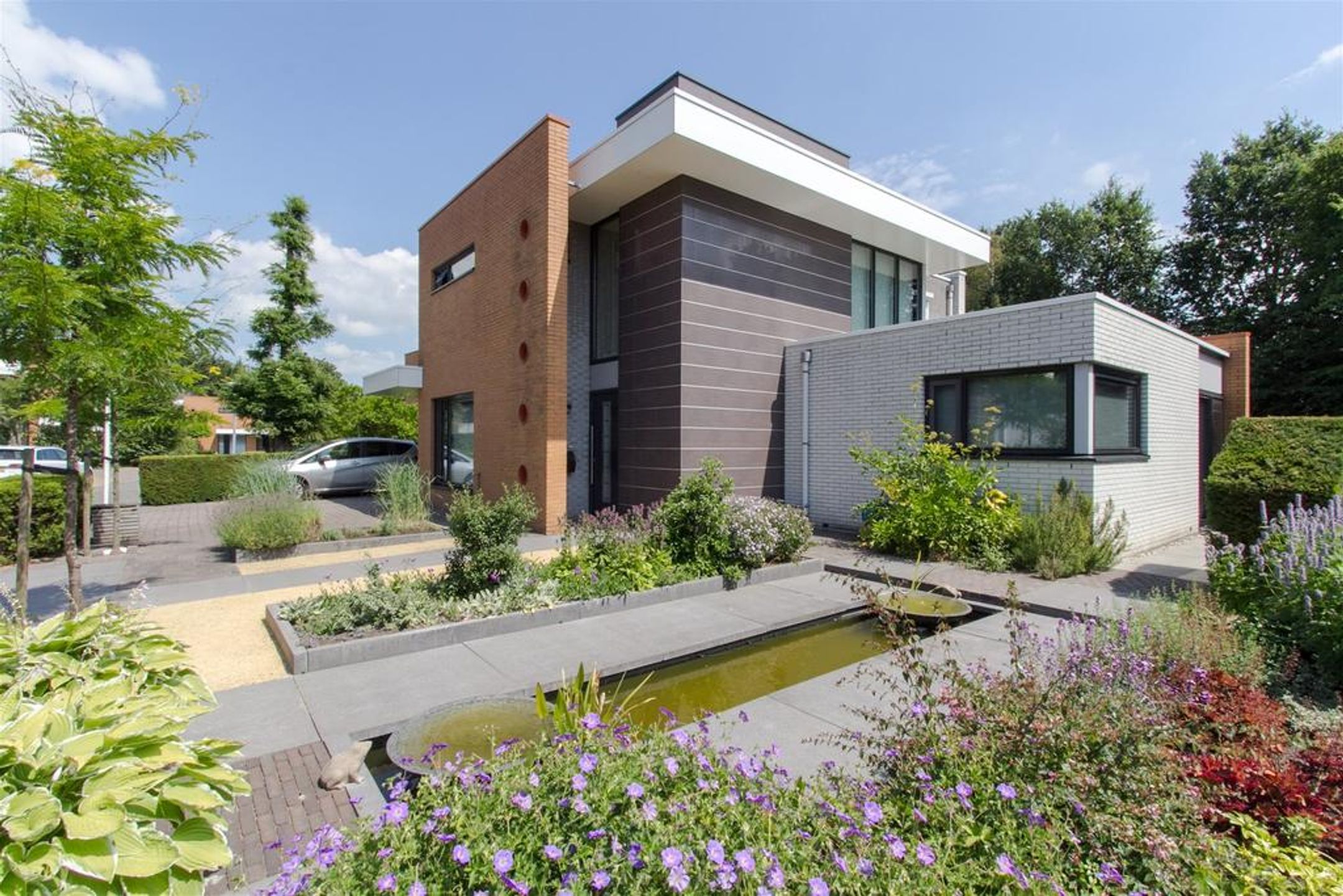 Extern De onder architectuur gebouwde woning staat op een fraai breed perceel met een voortuin welke in 2015 onder architectuur opnieuw is aangelegd. Het ontwerp is ingevuld met grote grijze tegels, split paden diverse strak gevormde borders, taxus hagen, grote diversiteit aan struiken en bomen en een moderne spiegelvijver met twee waterornamenten. De brede oprit biedt ruimte aan 3 tot 4 auto's en in de voorgevel treft u de praktische buitenkraan.