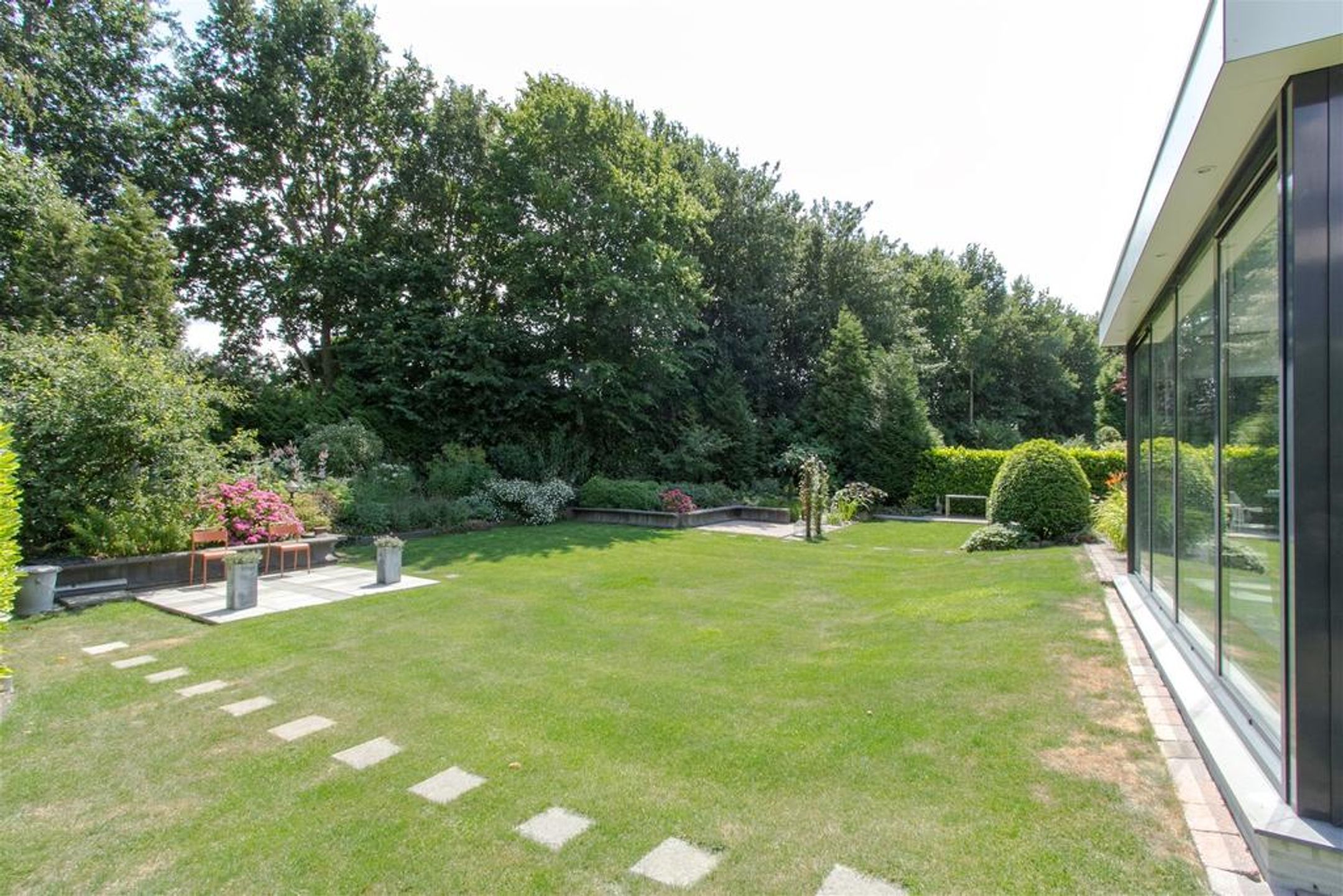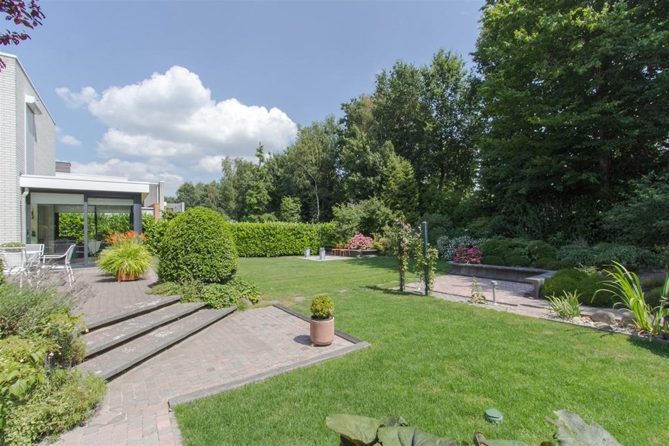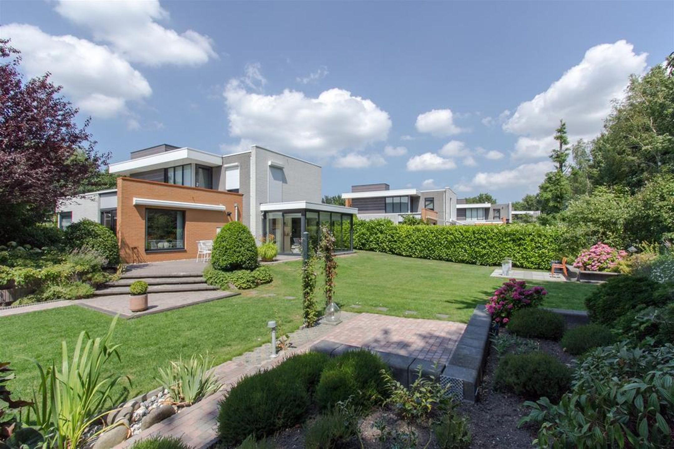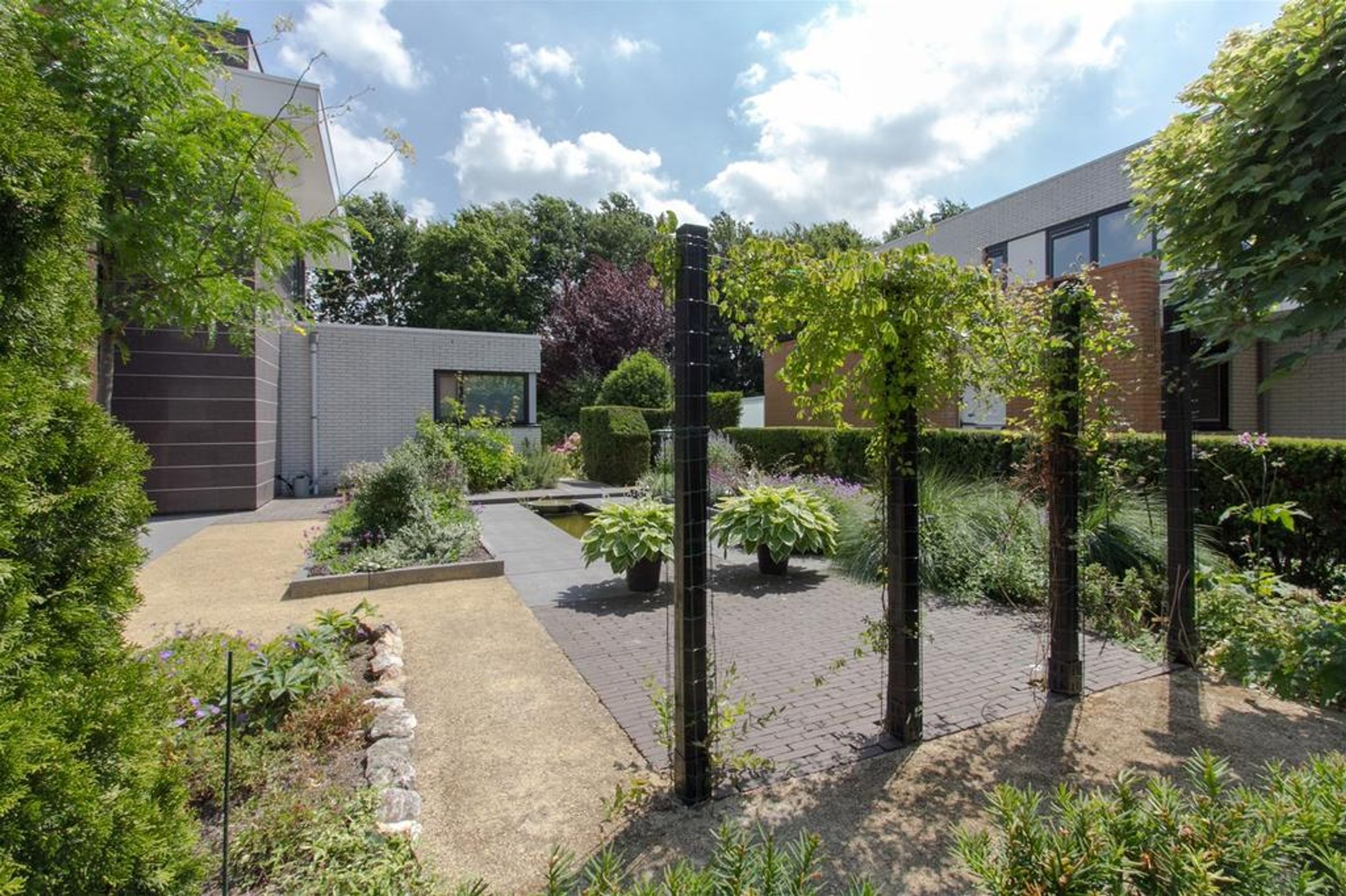 Extern De onder architectuur gebouwde woning staat op een fraai breed perceel met een voortuin welke in 2015 onder architectuur opnieuw is aangelegd. Het ontwerp is ingevuld met grote grijze tegels, split paden diverse strak gevormde borders, taxus hagen, grote diversiteit aan struiken en bomen en een moderne spiegelvijver met twee waterornamenten. De brede oprit biedt ruimte aan 3 tot 4 auto's en in de voorgevel treft u de praktische buitenkraan.