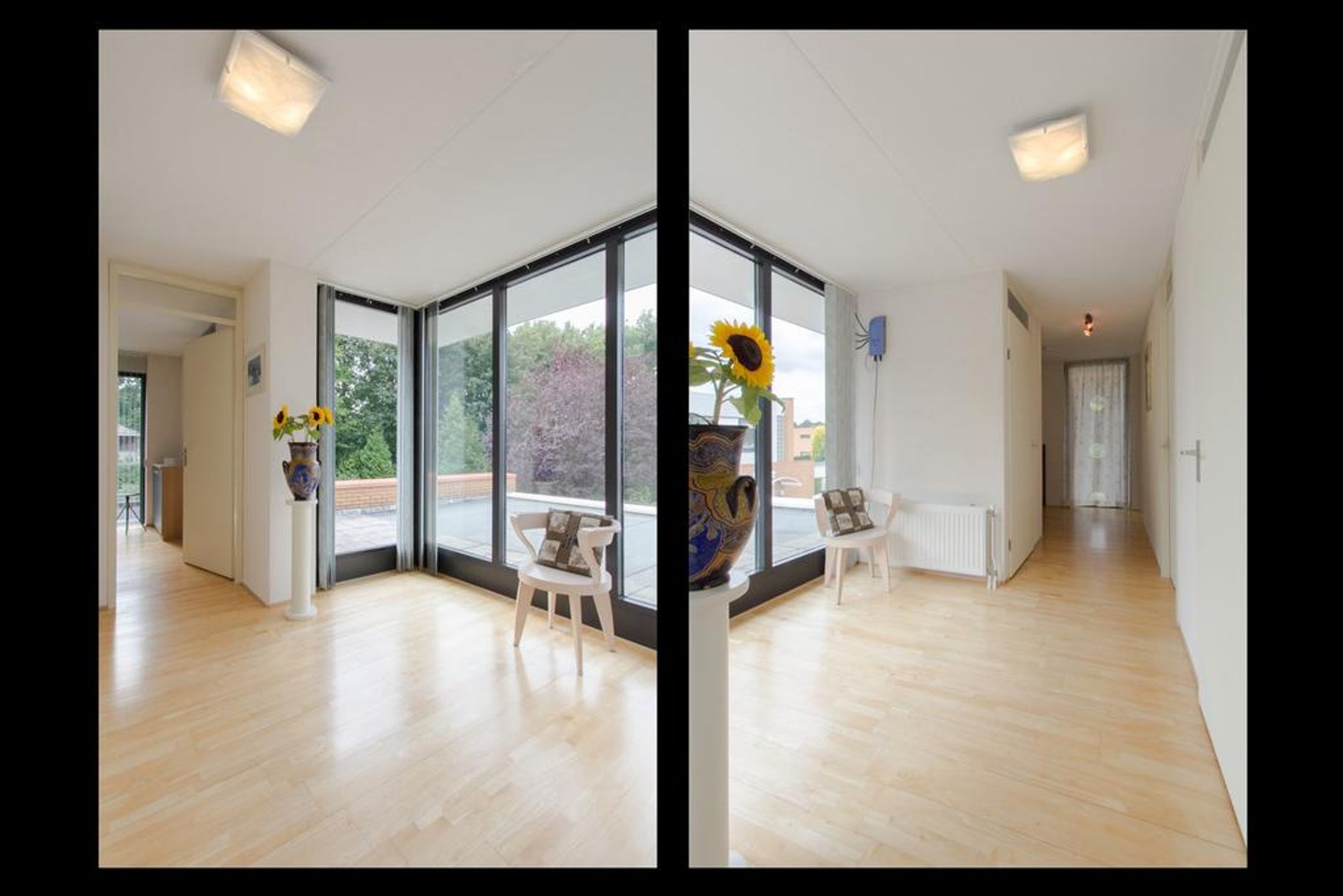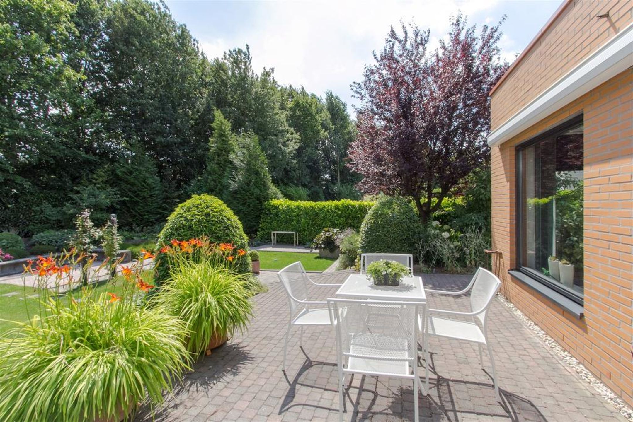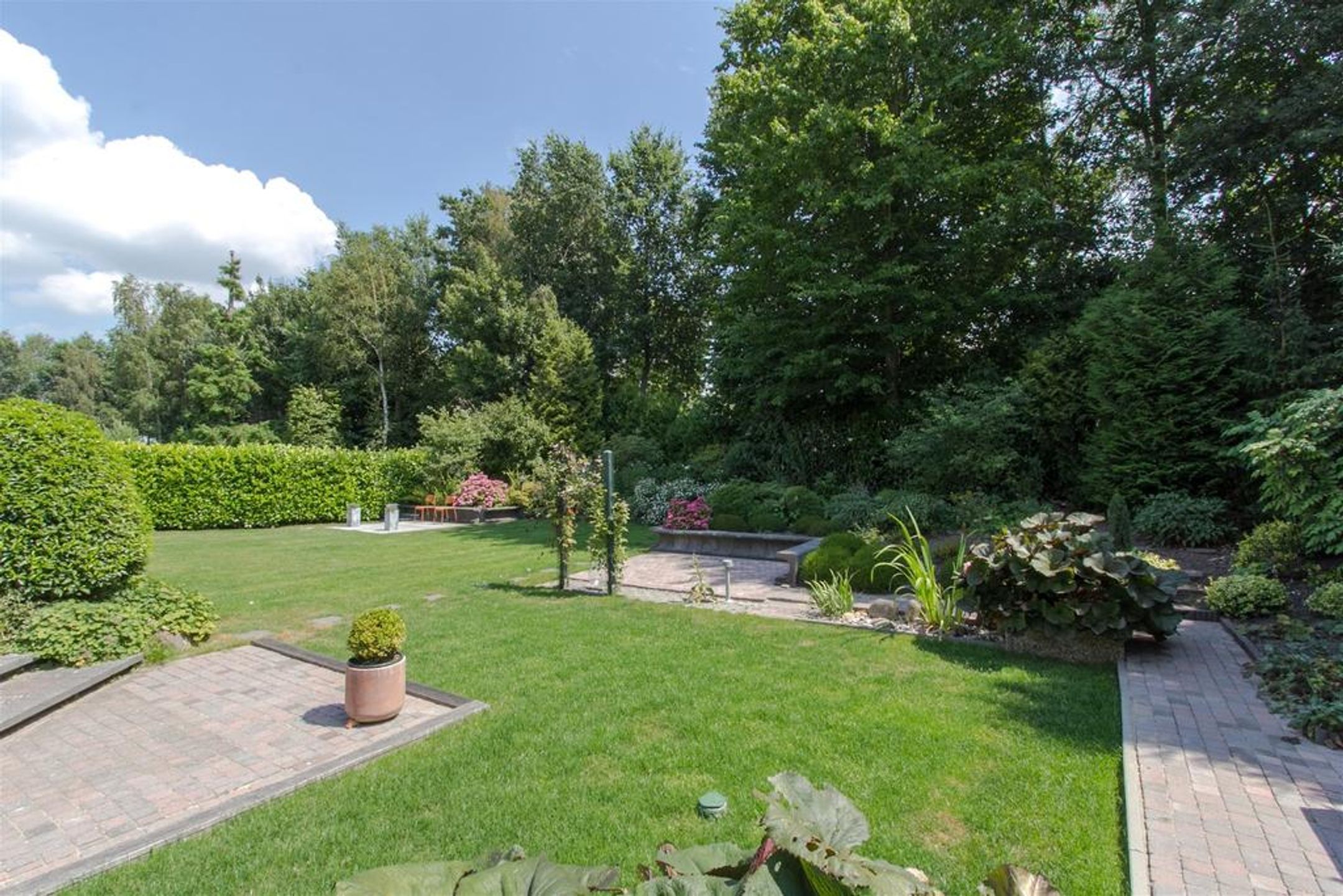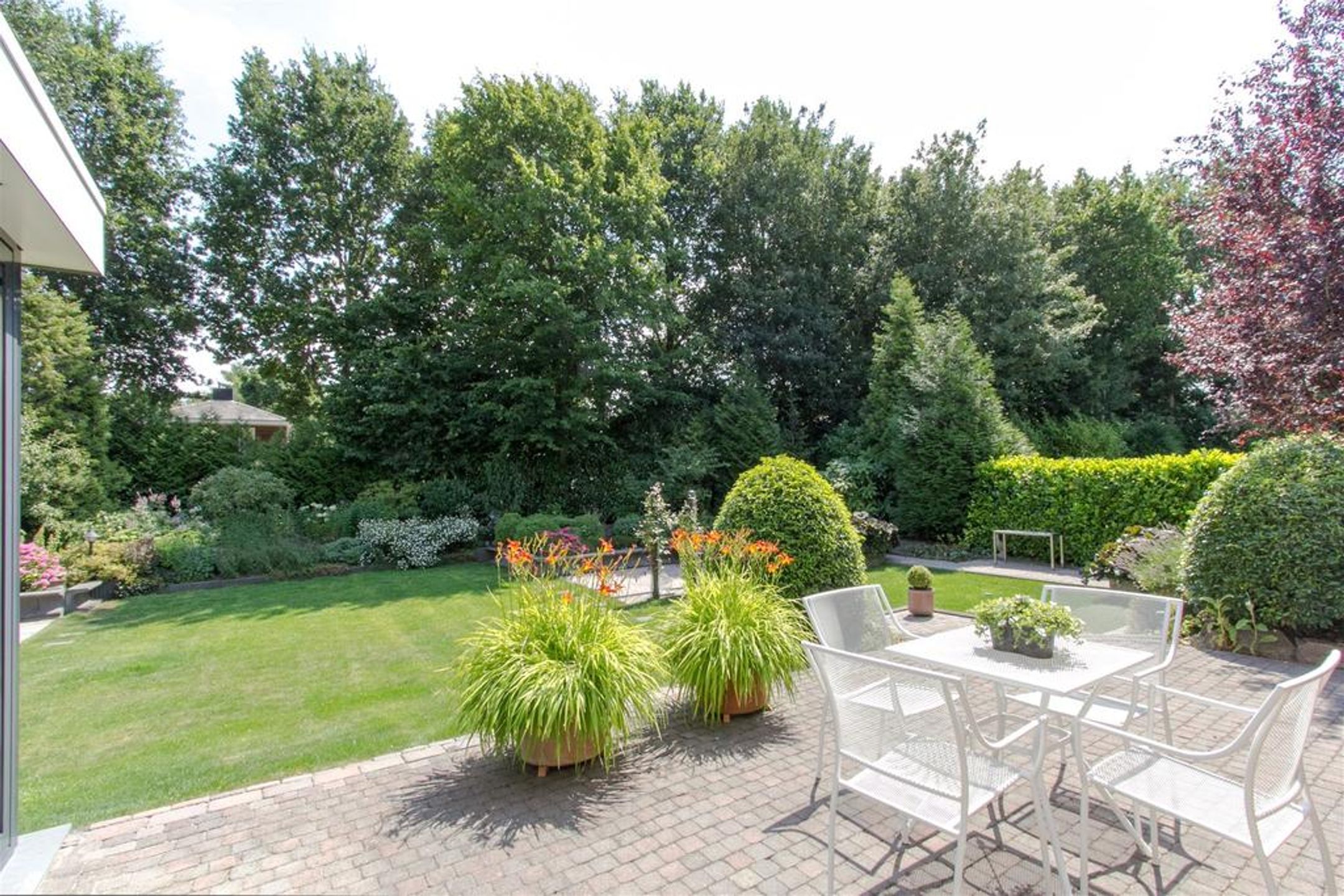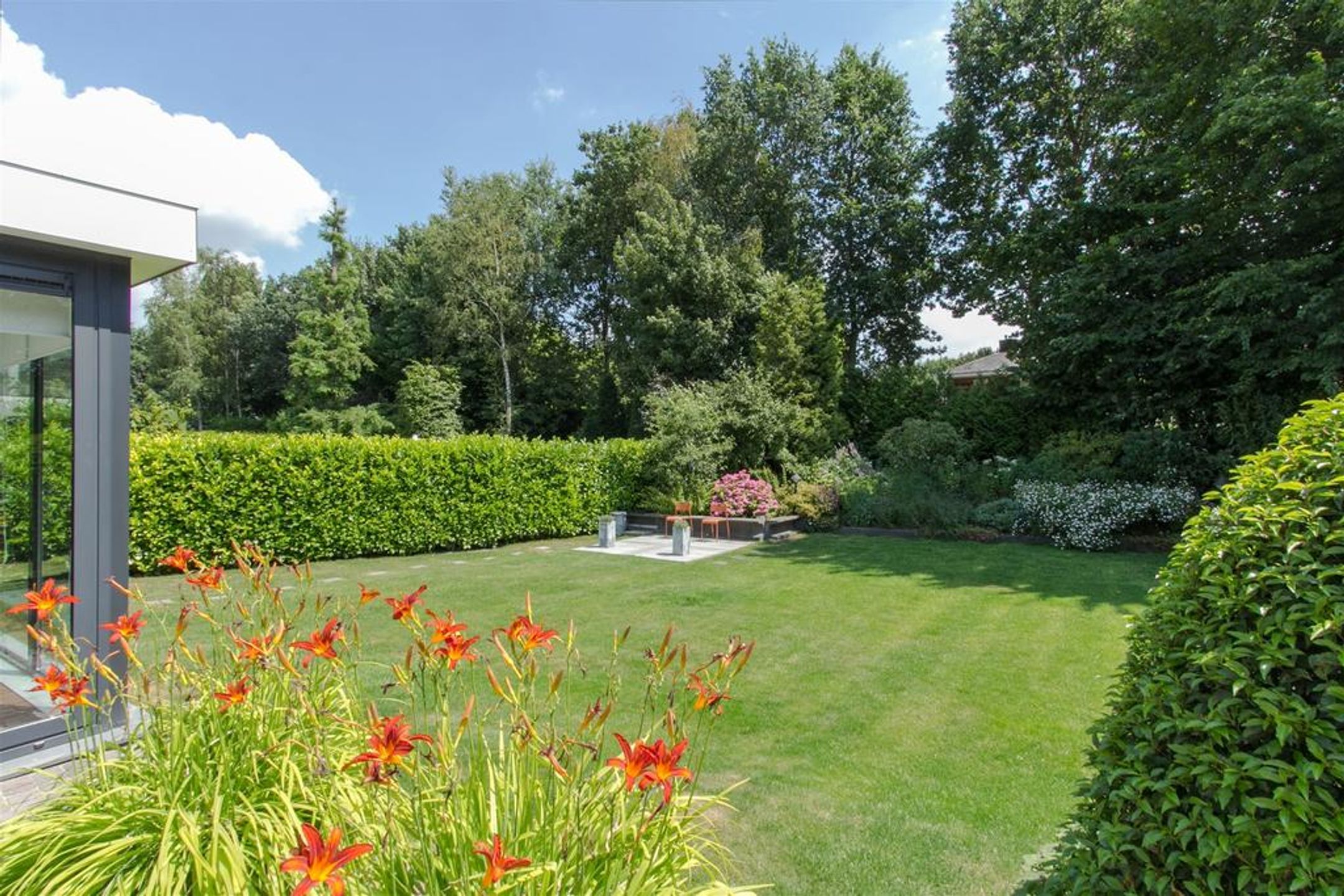 Extern De onder architectuur gebouwde woning staat op een fraai breed perceel met een voortuin welke in 2015 onder architectuur opnieuw is aangelegd. Het ontwerp is ingevuld met grote grijze tegels, split paden diverse strak gevormde borders, taxus hagen, grote diversiteit aan struiken en bomen en een moderne spiegelvijver met twee waterornamenten. De brede oprit biedt ruimte aan 3 tot 4 auto's en in de voorgevel treft u de praktische buitenkraan.