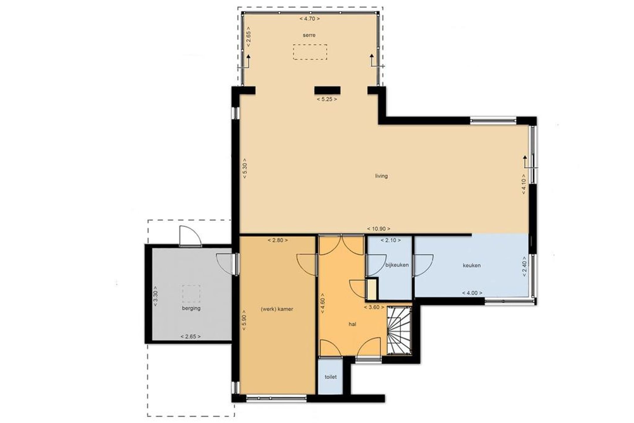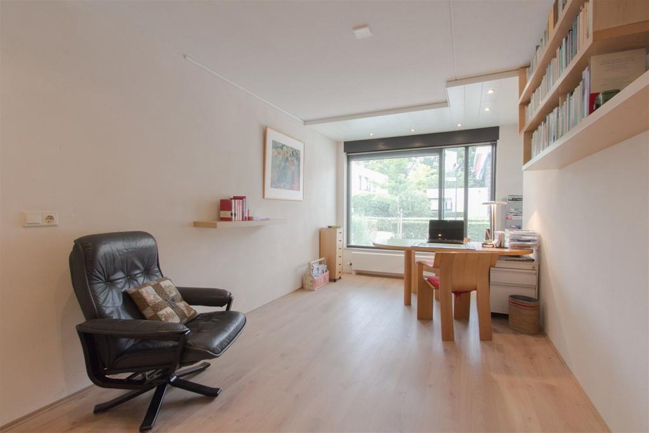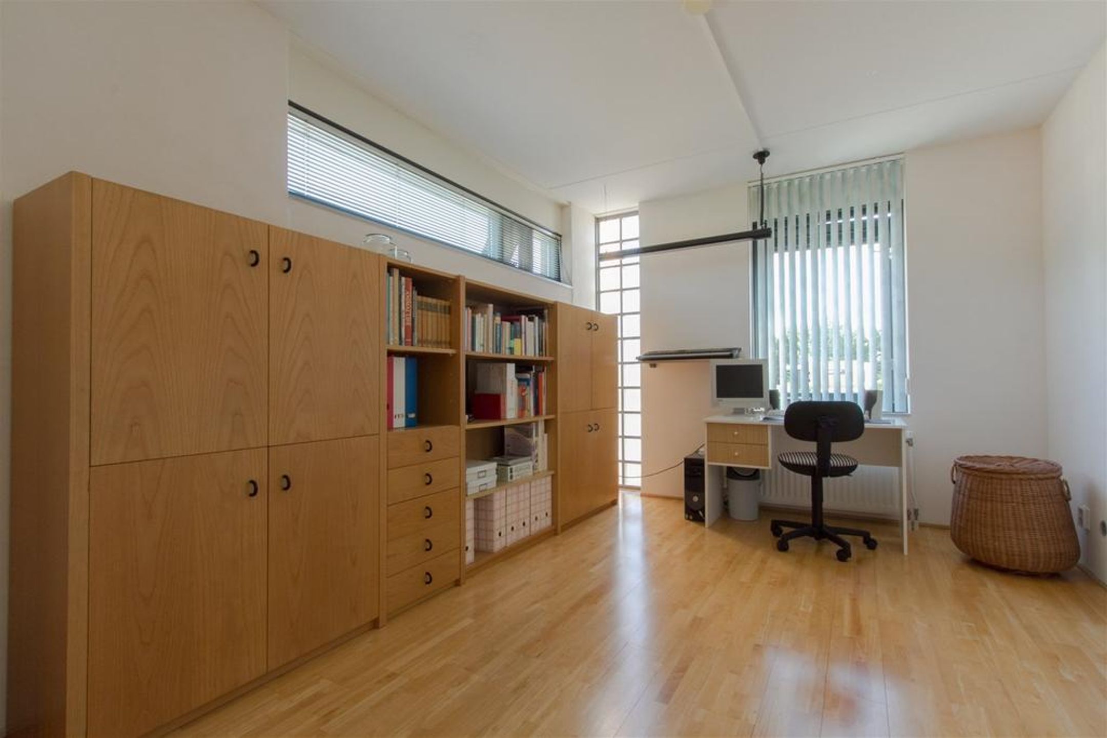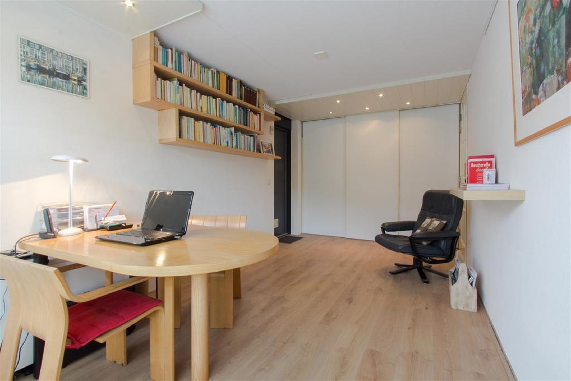 De voormalige garage is verbouwd tot werkkamer/kantoorruimte. De garagedeur is vervangen door een gevel vullende raampartij. In het plafond zijn spots verwerkt. Op de vloer ligt fraai laminaat. Een grote bergkast voorzien van schuifdeuren, voorziet in veel extra bergruimte. Via de werkkamer/kantoorruimte heeft u toegang tot de extra aangebouwde praktische berging welke beschikt over een lichtkoepel. Een deur biedt toegang tot de tuin.