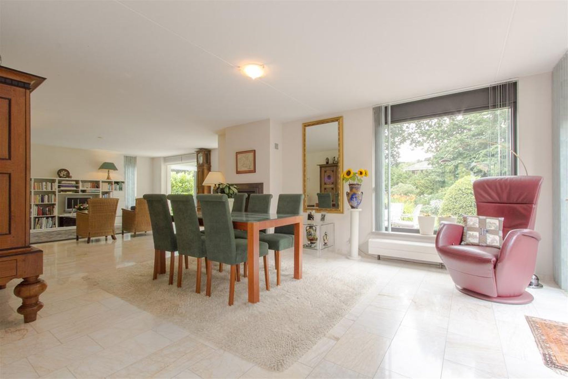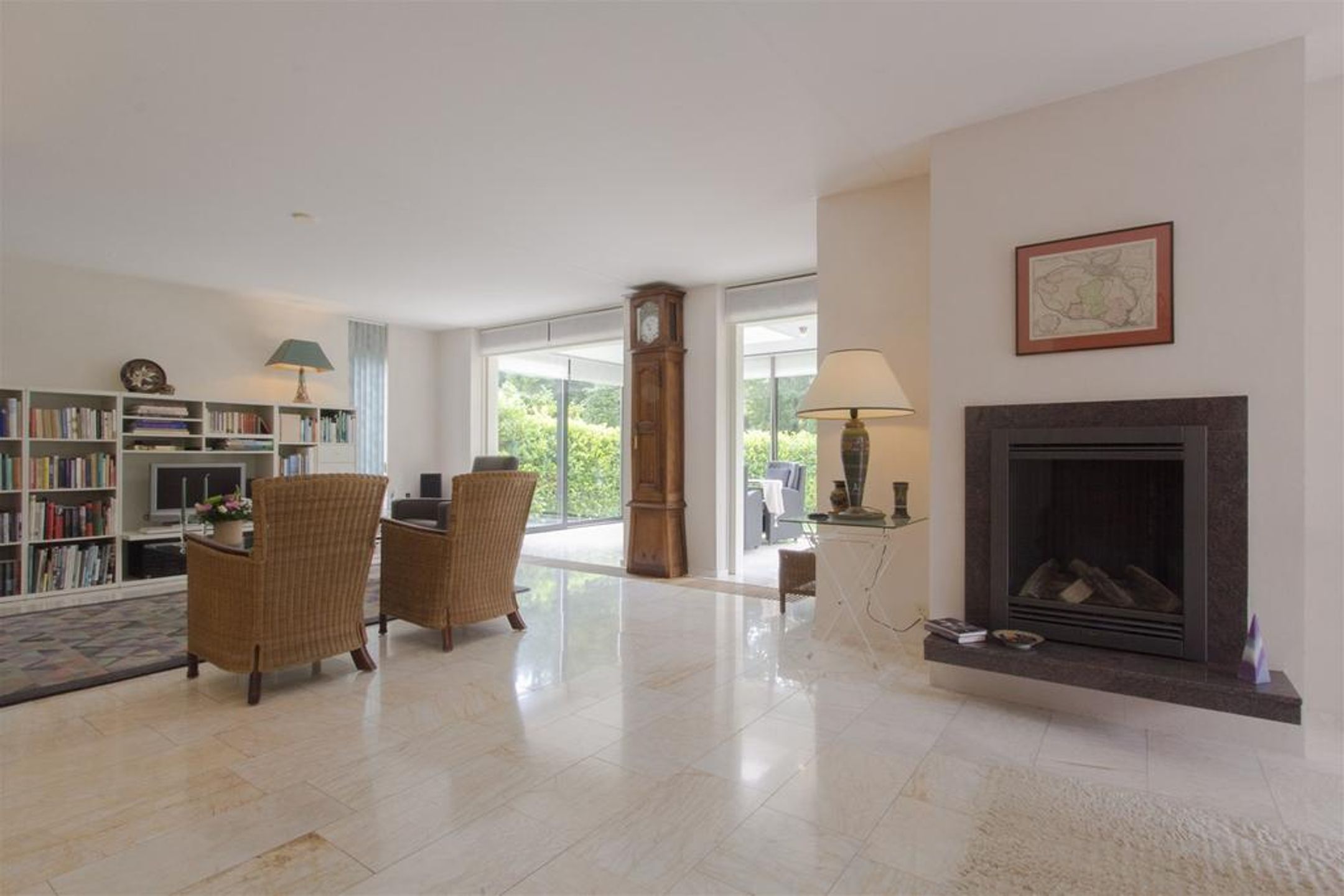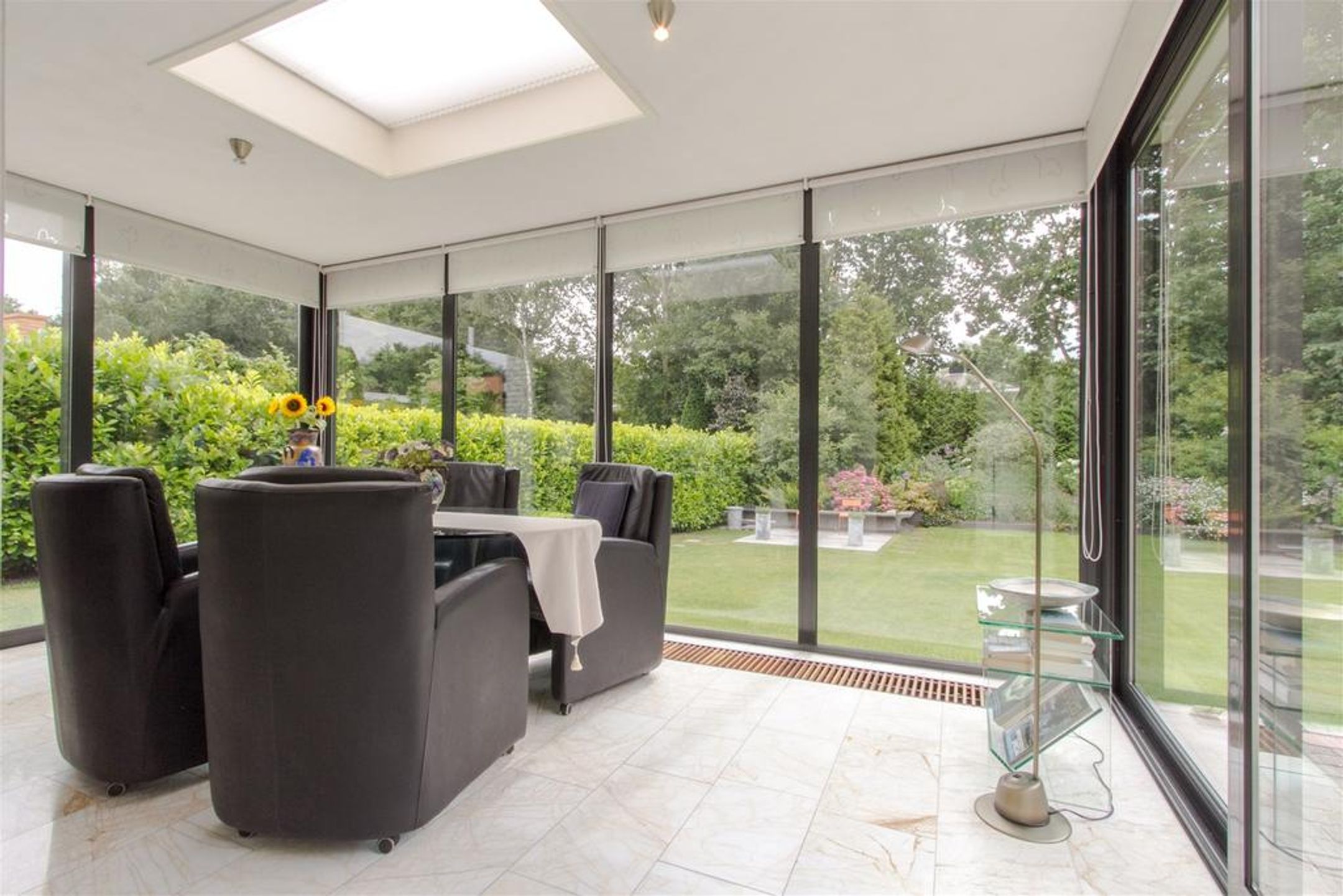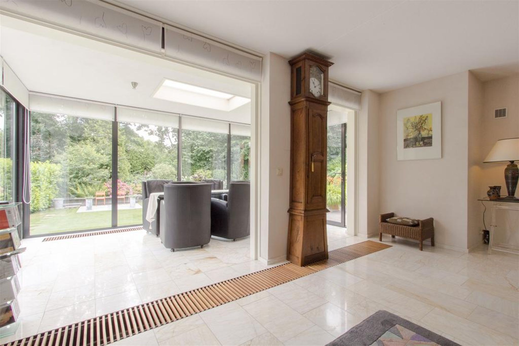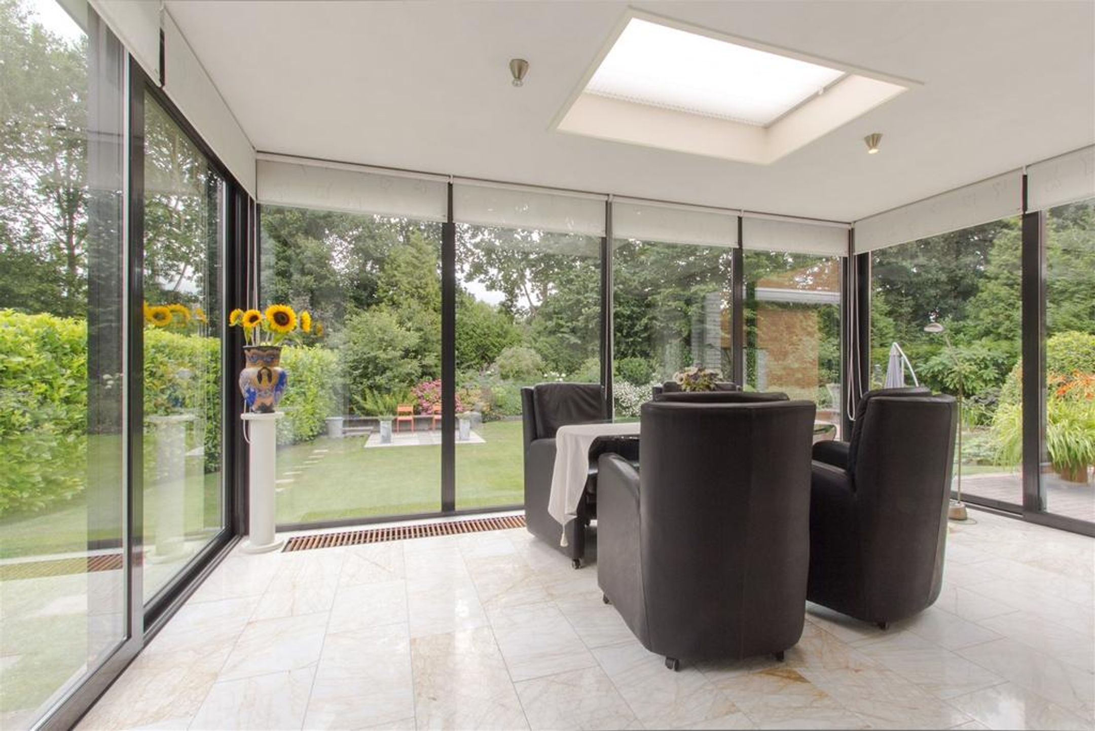 Via dubbele glasdeuren heeft u toegang tot de zeer royale tuingerichte living welke is ingedeeld met een gezellige zitkamer en langgerekte eetkamer. Centraal in de living staat een gashaard voorzien van graniet plateau met kader. Op de vloer ligt luxe marmer welke doorloopt naar de aangebouwde sfeervolle serre waar de vloer voorzien is van comfortabele vloerverwarming. In de vloer zijn 2 convectorputten verwerkt voorzien van hardhouten roosters. Een lichtkoepel met 3 dubbele schaal voorziet in veel extra daglicht. 2 dubbele brede schuifpuien in de serre en een brede schuifpui in de living bieden toegang tot de prachtige tuin.