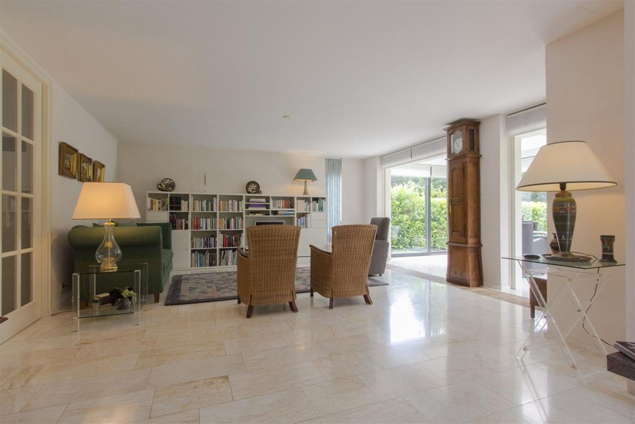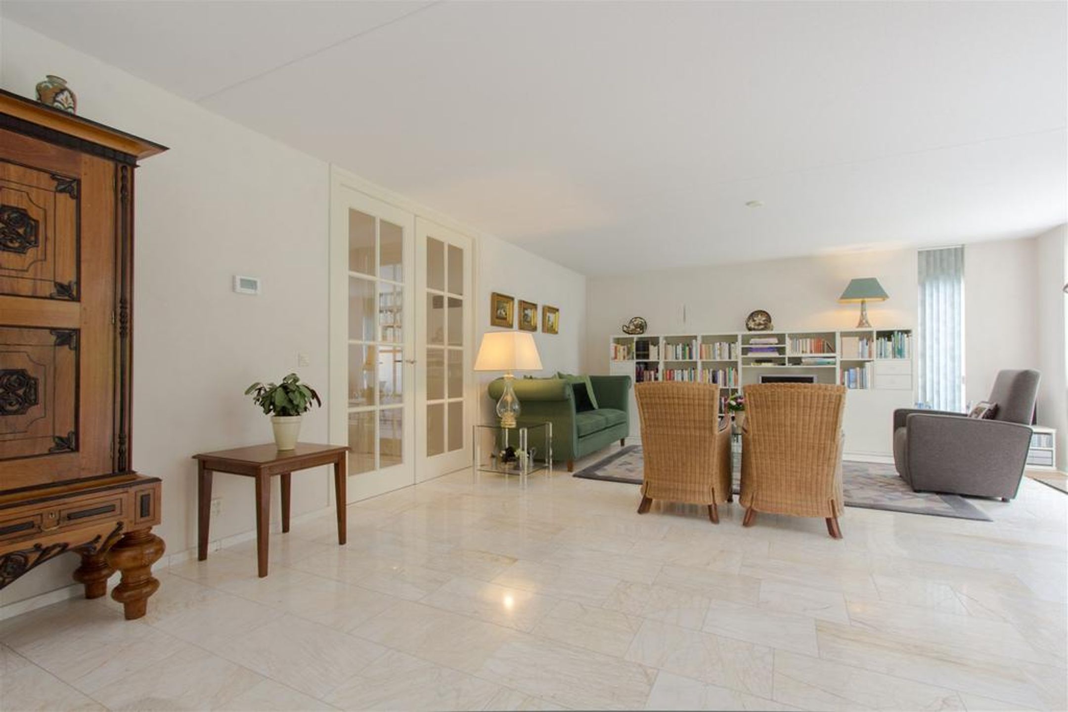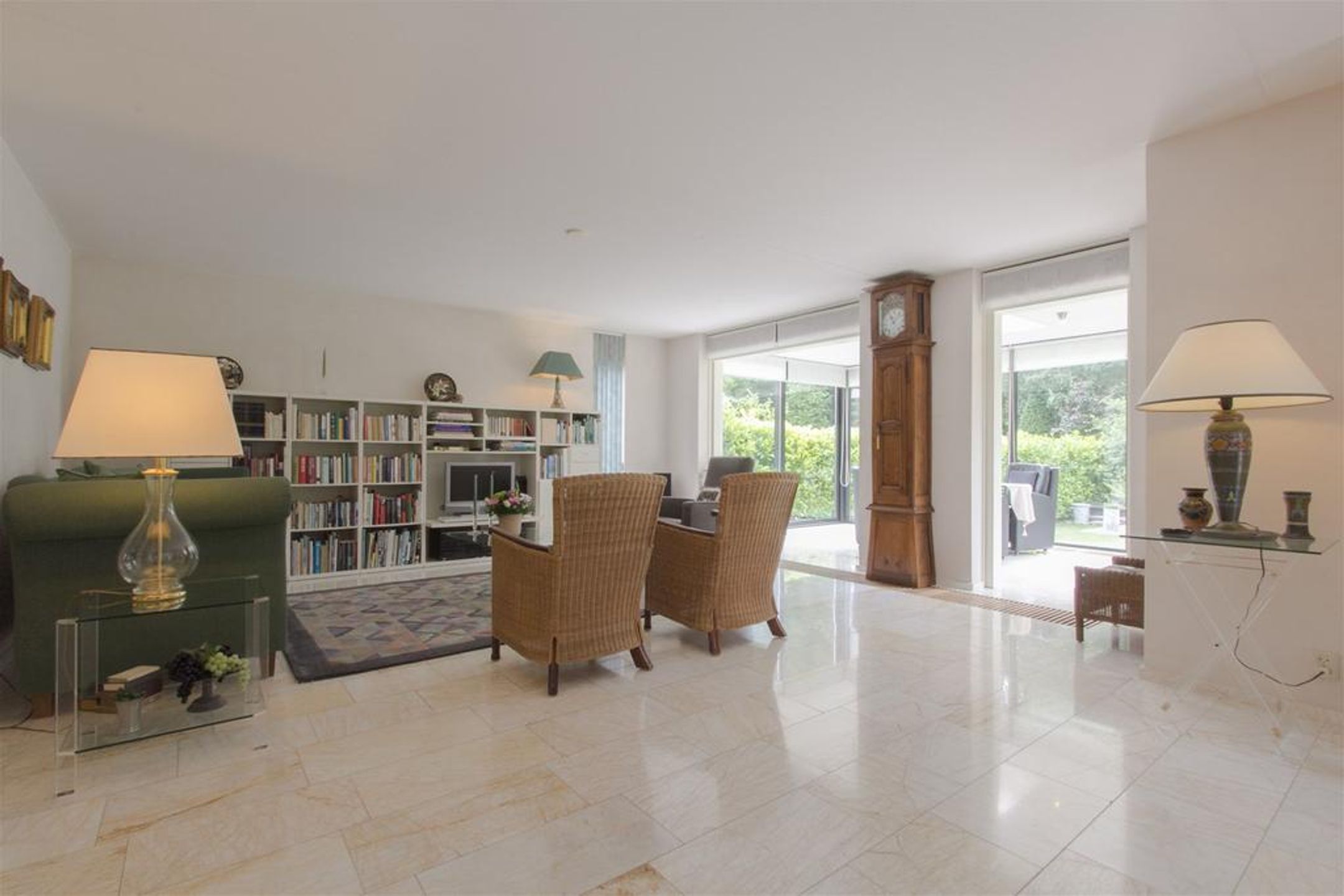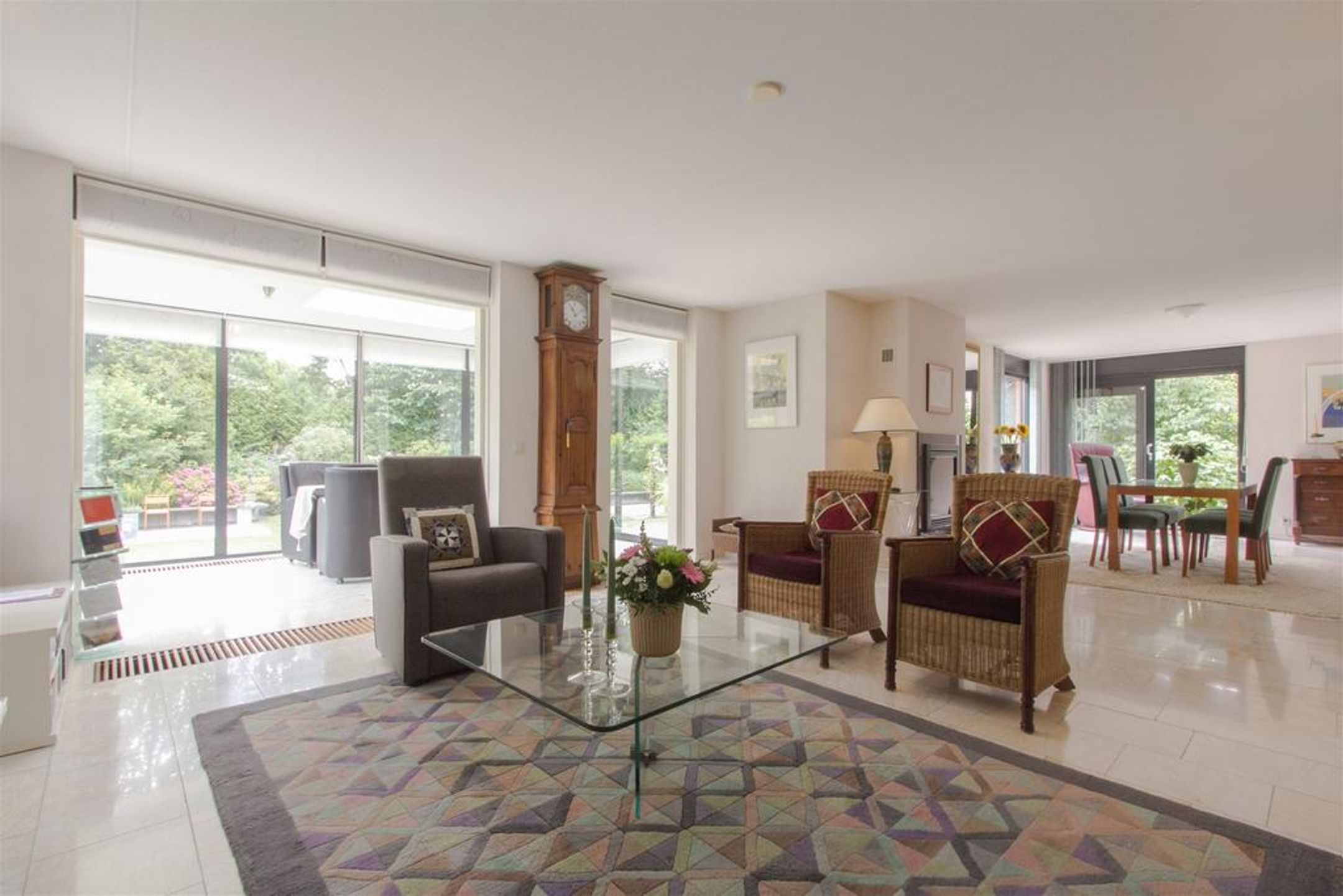 Via dubbele glasdeuren heeft u toegang tot de zeer royale tuingerichte living welke is ingedeeld met een gezellige zitkamer en langgerekte eetkamer. Centraal in de living staat een gashaard voorzien van graniet plateau met kader. Op de vloer ligt luxe marmer welke doorloopt naar de aangebouwde sfeervolle serre waar de vloer voorzien is van comfortabele vloerverwarming. In de vloer zijn 2 convectorputten verwerkt voorzien van hardhouten roosters. Een lichtkoepel met 3 dubbele schaal voorziet in veel extra daglicht. 2 dubbele brede schuifpuien in de serre en een brede schuifpui in de living bieden toegang tot de prachtige tuin.