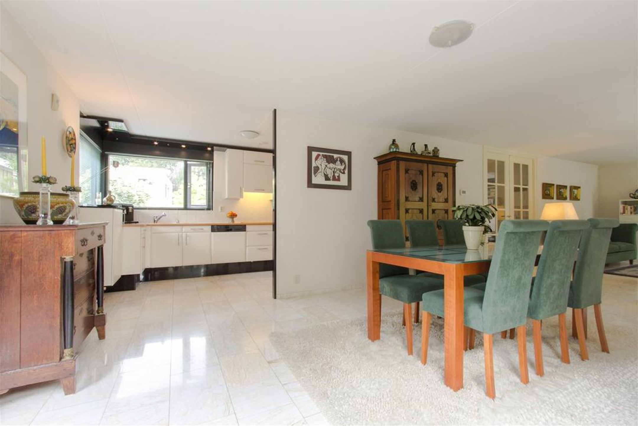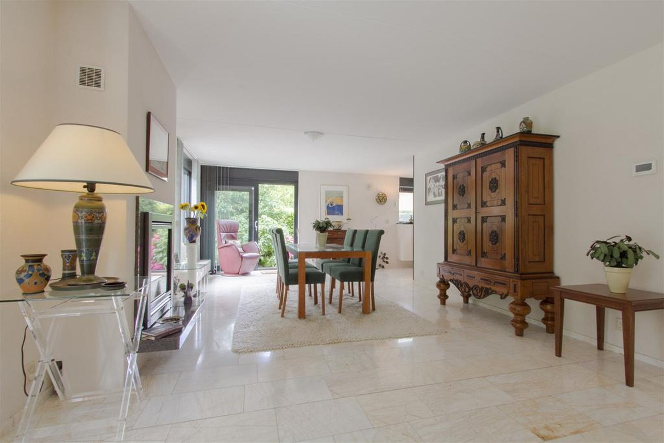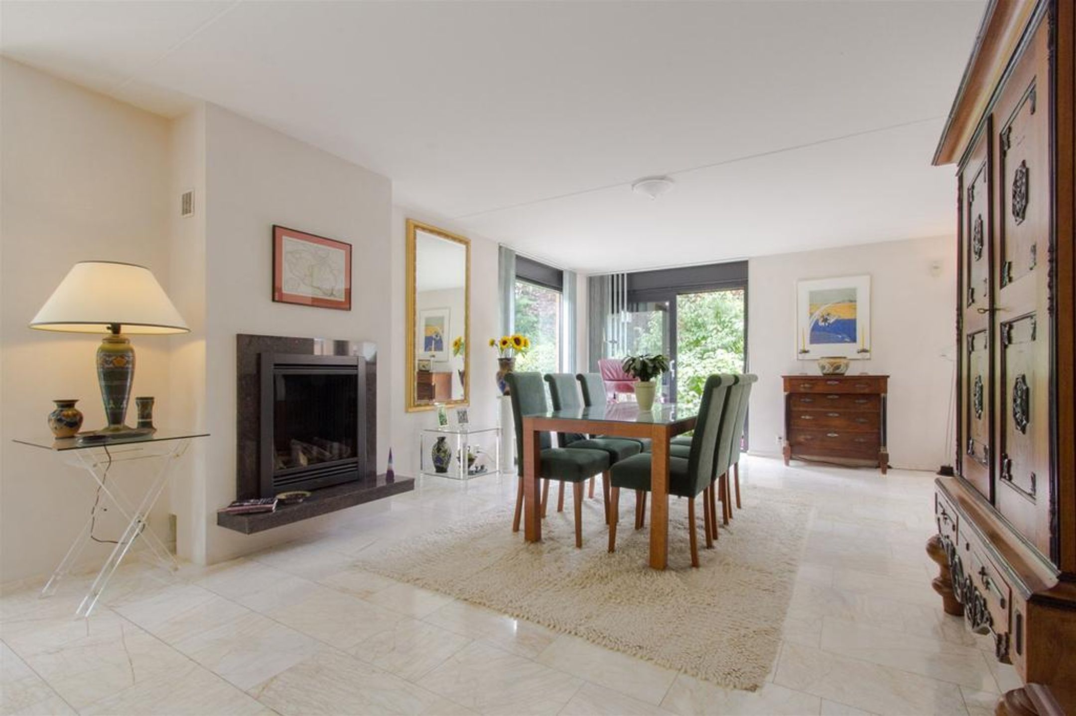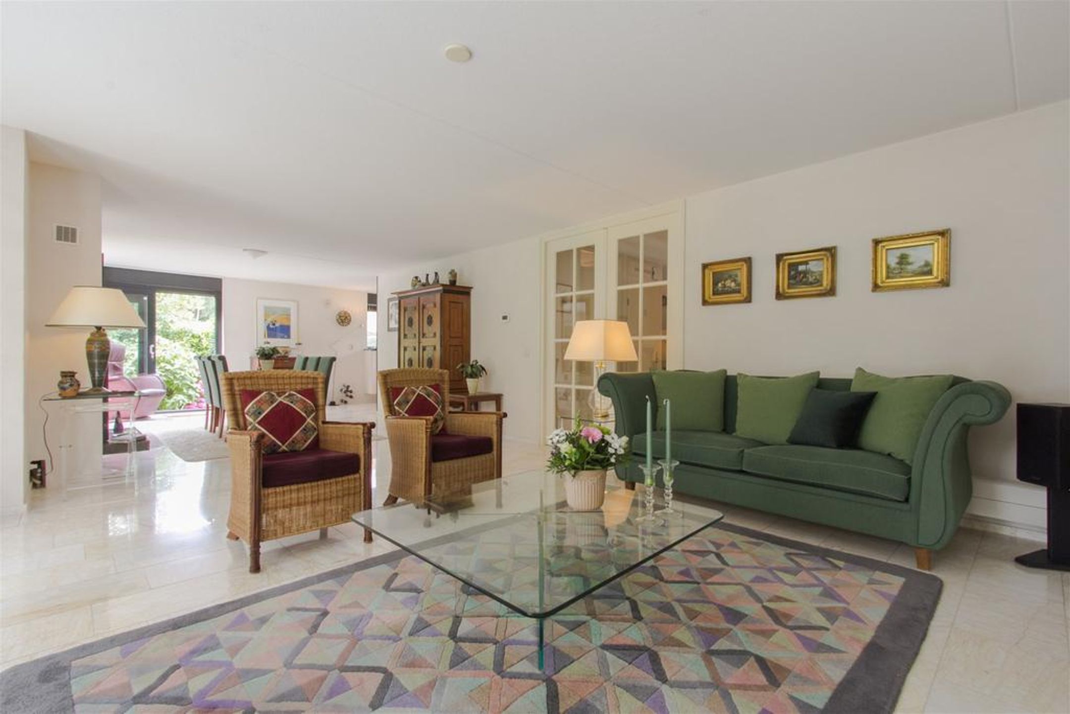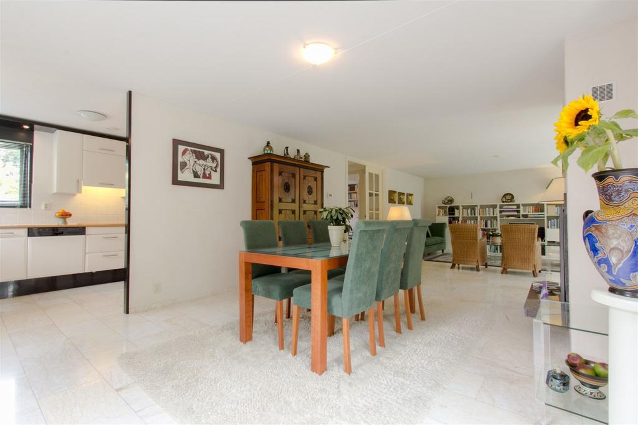 Via dubbele glasdeuren heeft u toegang tot de zeer royale tuingerichte living welke is ingedeeld met een gezellige zitkamer en langgerekte eetkamer. Centraal in de living staat een gashaard voorzien van graniet plateau met kader. Op de vloer ligt luxe marmer welke doorloopt naar de aangebouwde sfeervolle serre waar de vloer voorzien is van comfortabele vloerverwarming. In de vloer zijn 2 convectorputten verwerkt voorzien van hardhouten roosters. Een lichtkoepel met 3 dubbele schaal voorziet in veel extra daglicht. 2 dubbele brede schuifpuien in de serre en een brede schuifpui in de living bieden toegang tot de prachtige tuin.