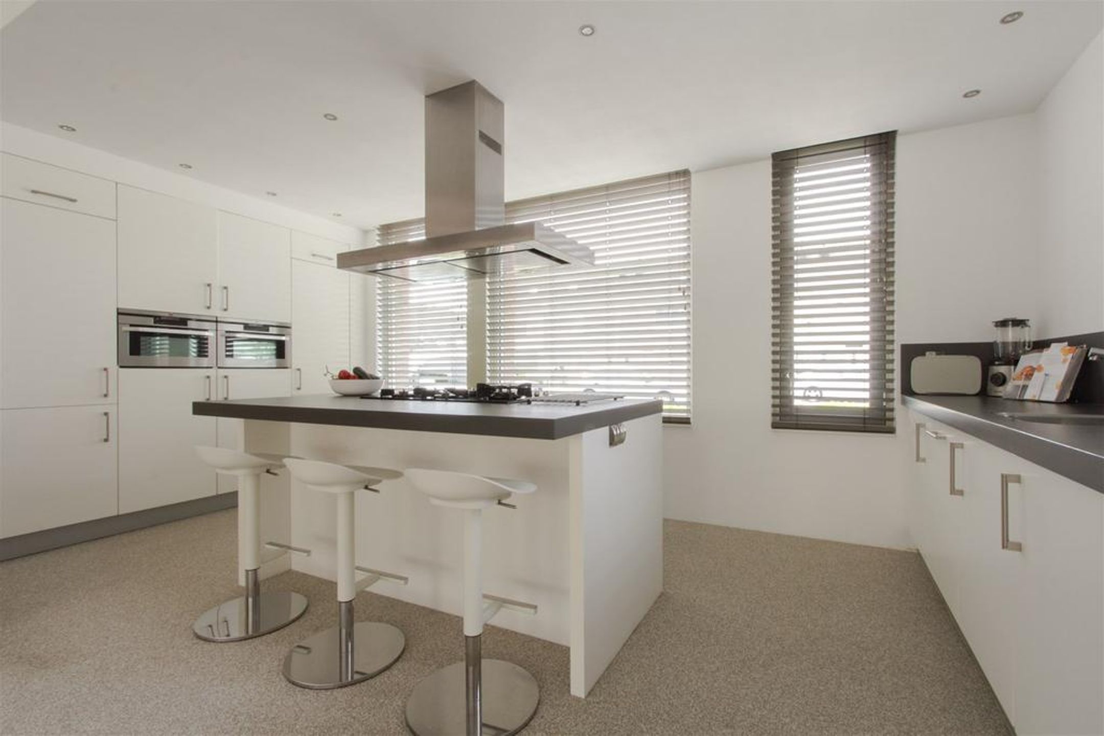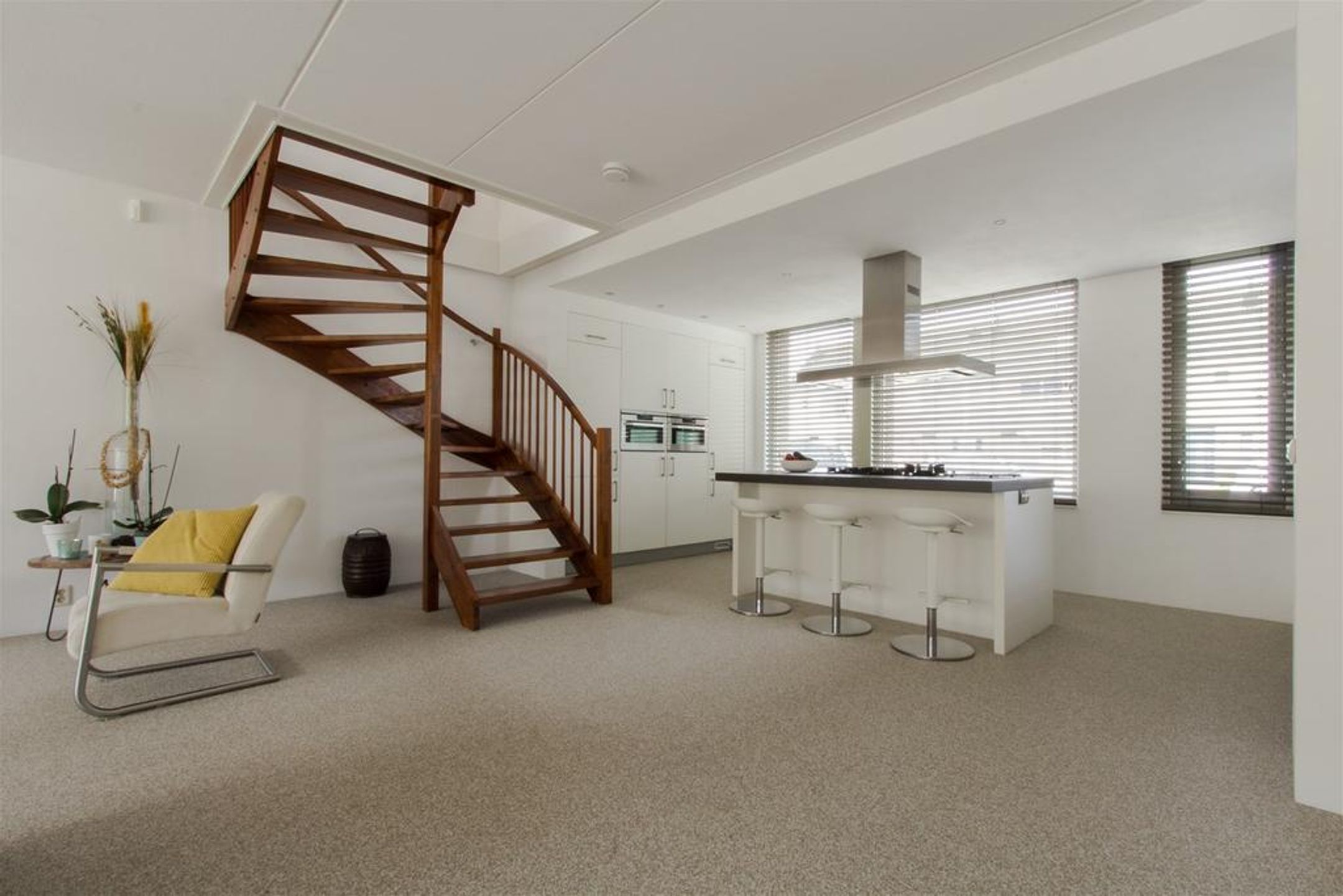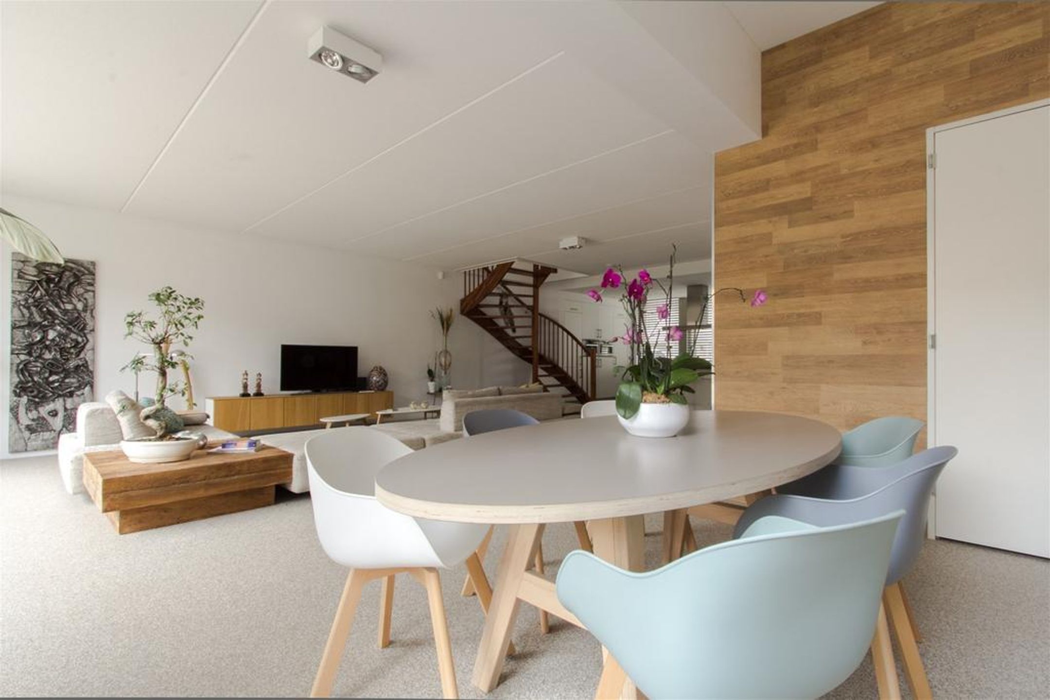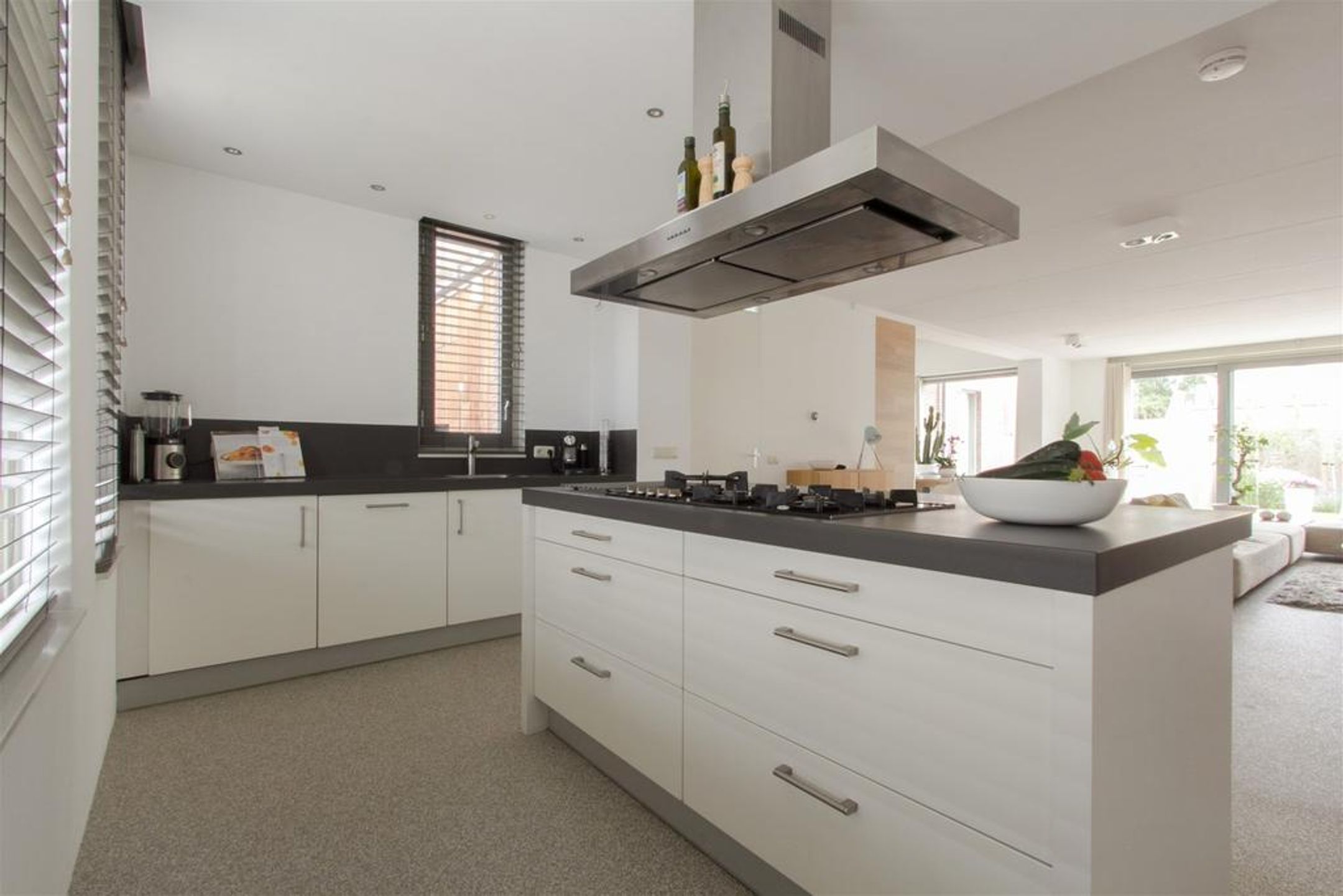Begane grond: Entree, ruime hal met toegang tot toilet voorzien van vrij hangend closet en fonteintje, meterkast, dubbele binnendeur naar bedrijfsruimte en toegang tot de zeer royale living. De living is zeer royaal met een brede schuifpui naar de achtertuin. De vloer is afgewerkt met fraai woongrind en in de royale en vooral hoge nis aan de zijkant is de eethoek gesitueerd. Hier treft u tevens een praktische extra bergkast. Aan de voorzijde staat de luxe keuken opgesteld. Deze is opgebouwd uit twee wandopstellingen met centraal het kookeiland met bar. De keuken is samengesteld met hoogglans fronten gecombineerd met zwart kunststof werkbladen. Voorts beschikt u hier over een ATAG 5-pits gaskookplaat met daarboven een RVS afzuigschouw, een AEG vaatwasmachine, oven, oven-magnetroncombinatie en koel-vrieskast (2017). Middels de hardhouten open trap bereikt u de verdieping.